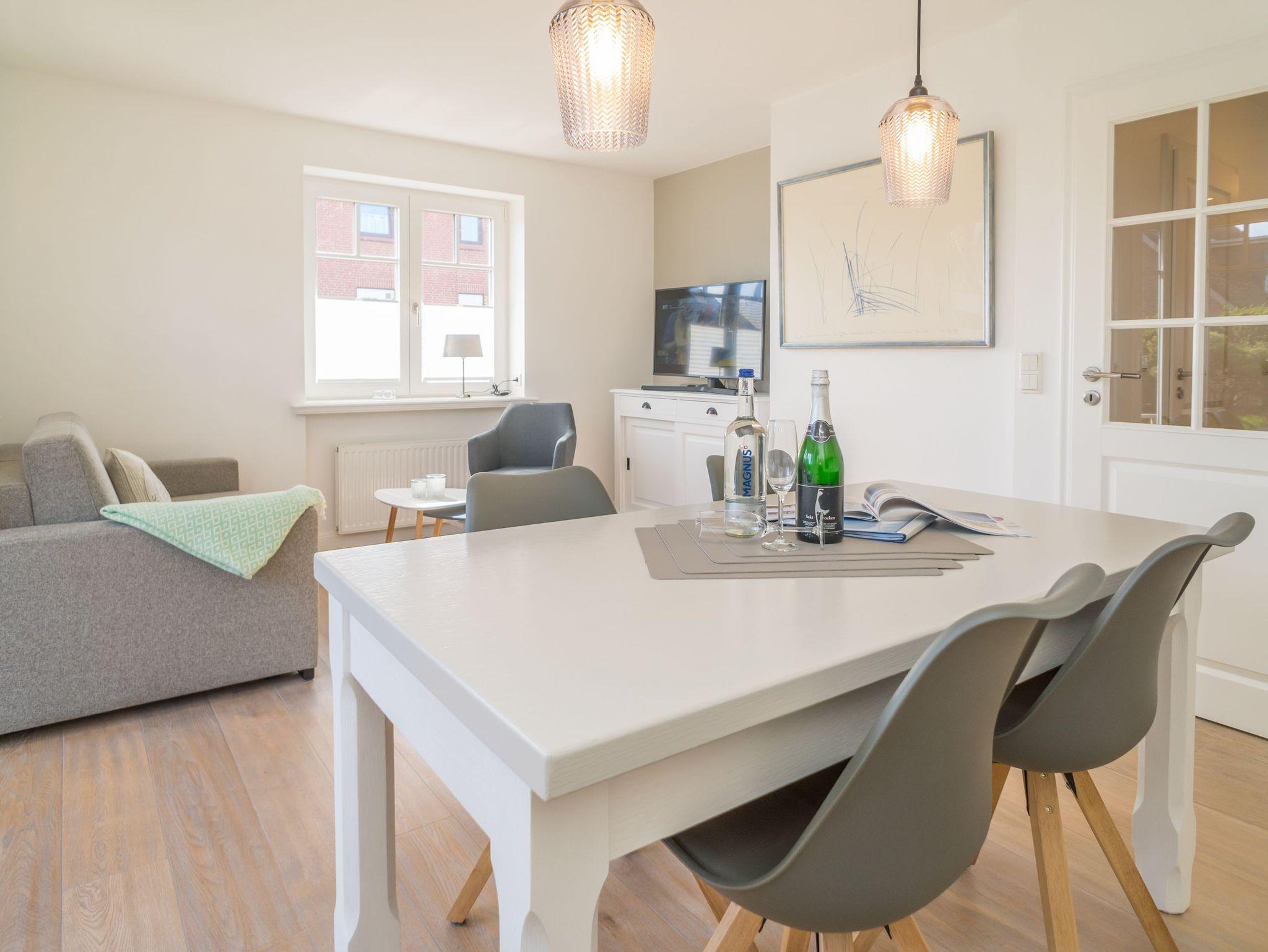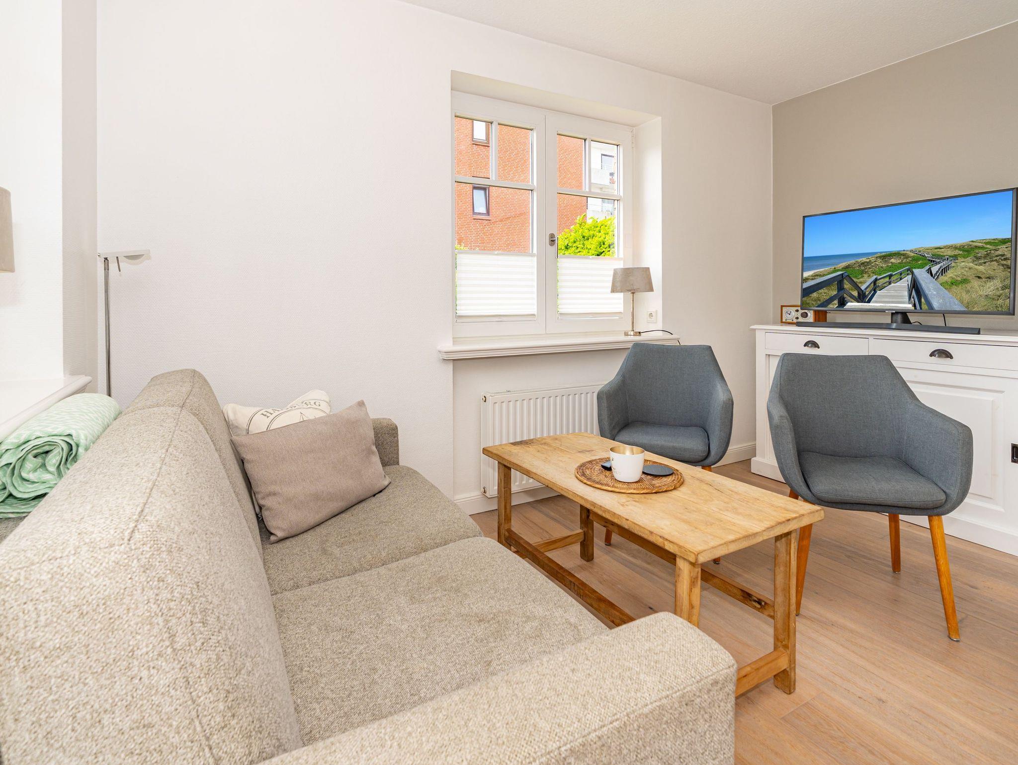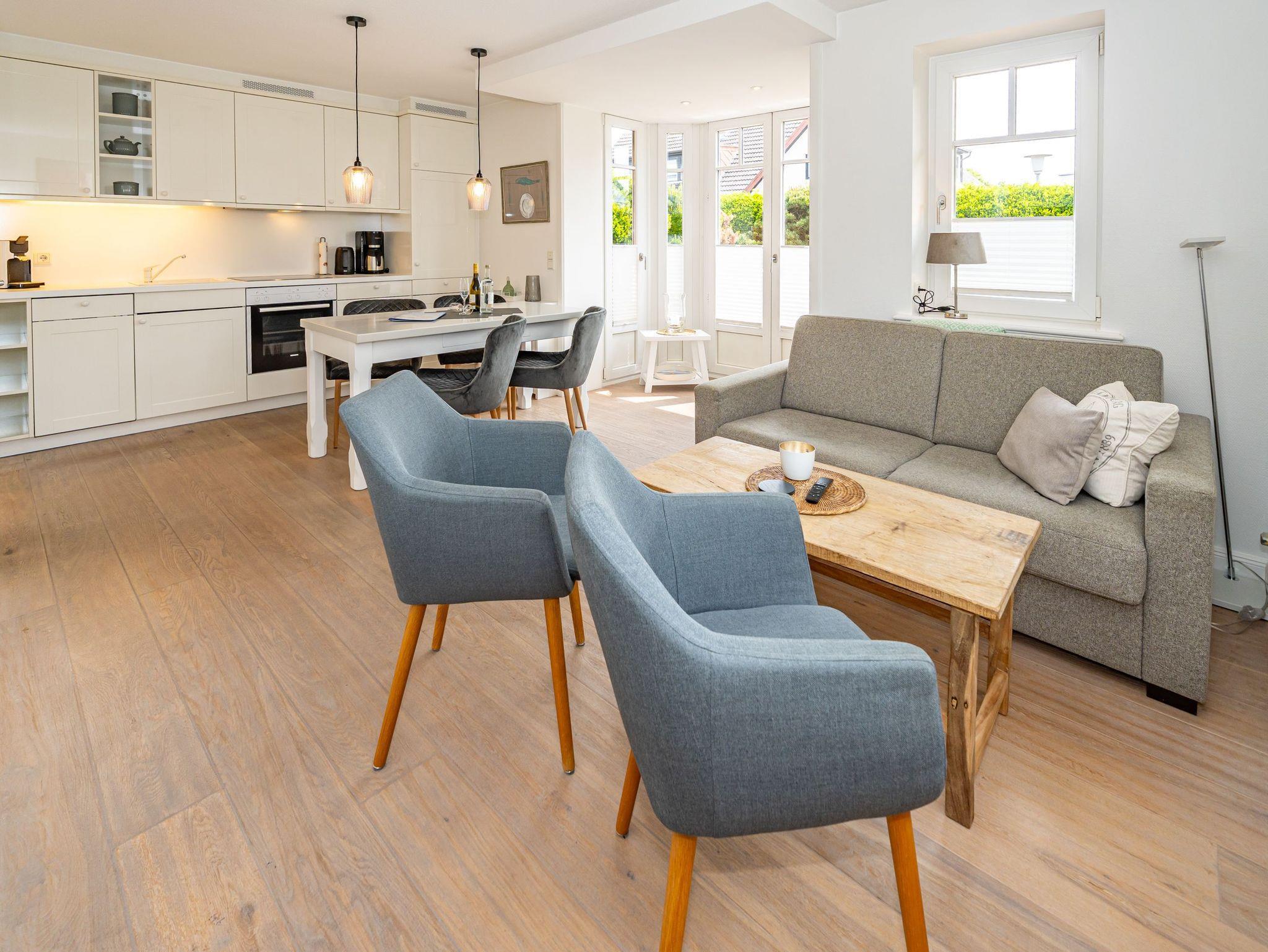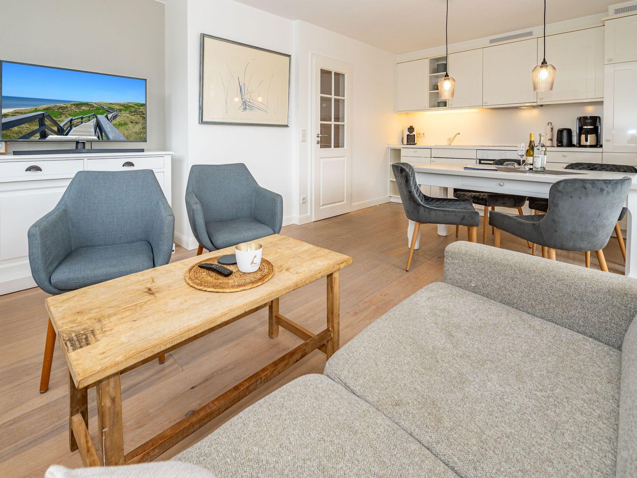 Im Eingangsbereich befindet sich die Diele mit Garderobe. Daran schließt das Wohnzimmer mit direktem Zugang zur geschützten Südterrasse an. Der Wohnraum ist mit einer Sitzgarnitur (2-Sitzer-Couch mit hochwertiger ausziehbarer Schlafmöglichkeit und 2 Sesseln), einem separaten Essplatz, Flachbild-TV, WLAN und einer offene Küche ausgestattet. Die voll ausgestattete weiße Hochglanzküche lässt mit Geschirrspüler, Ceranfeld (4 Felder) und Backofen kaum Wünsche offen. Kaffeemaschine, Wasserkocher und Toaster gehören zur Grundausstattung.[nbsp][nbsp]