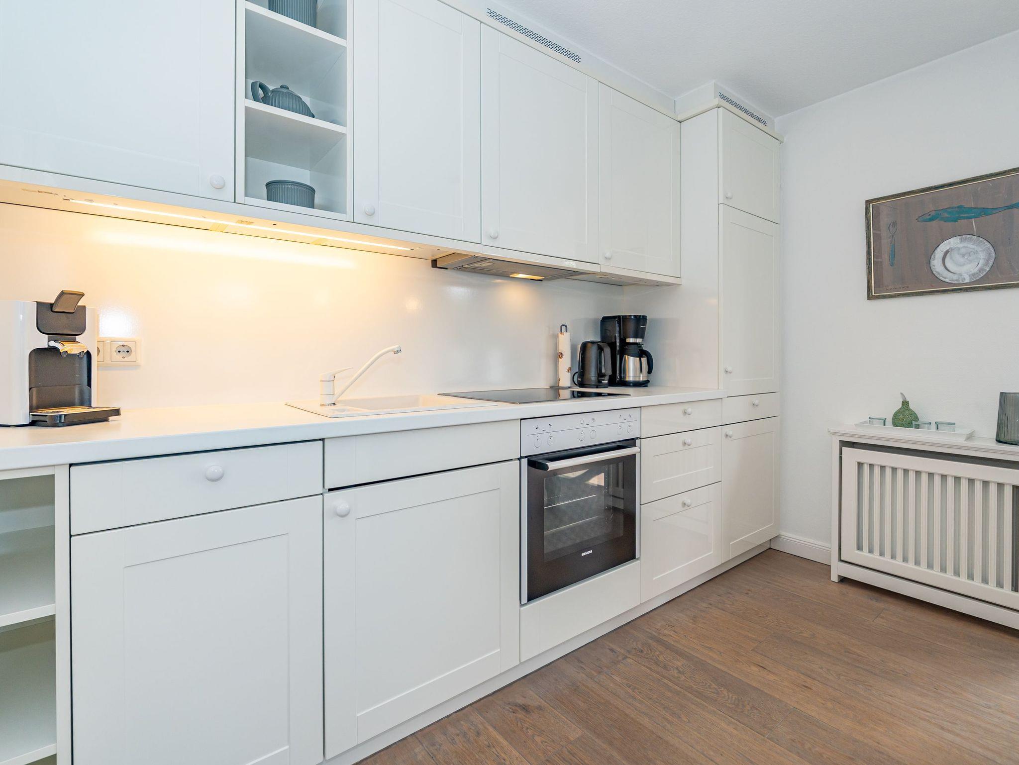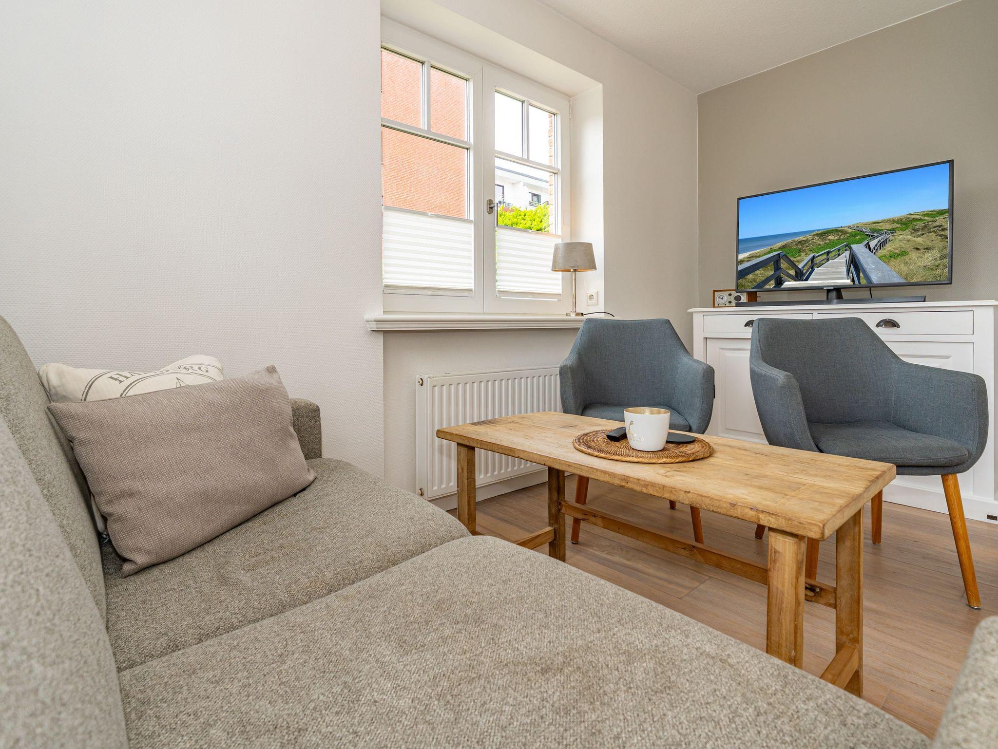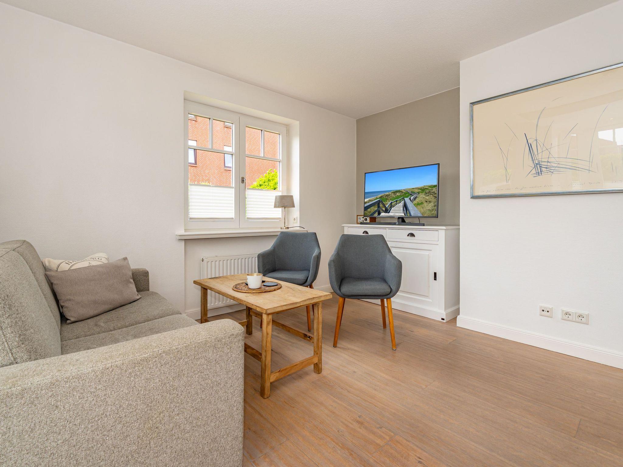 Im Eingangsbereich befindet sich die Diele mit Garderobe. Daran schließt das Wohnzimmer mit direktem Zugang zur geschützten Südterrasse an. Der Wohnraum ist mit einer Sitzgarnitur (2-Sitzer-Couch mit hochwertiger ausziehbarer Schlafmöglichkeit und 2 Sesseln), einem separaten Essplatz, Flachbild-TV, WLAN und einer offene Küche ausgestattet. Die voll ausgestattete weiße Hochglanzküche lässt mit Geschirrspüler, Ceranfeld (4 Felder) und Backofen kaum Wünsche offen. Kaffeemaschine, Wasserkocher und Toaster gehören zur Grundausstattung.[nbsp][nbsp]