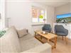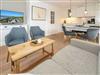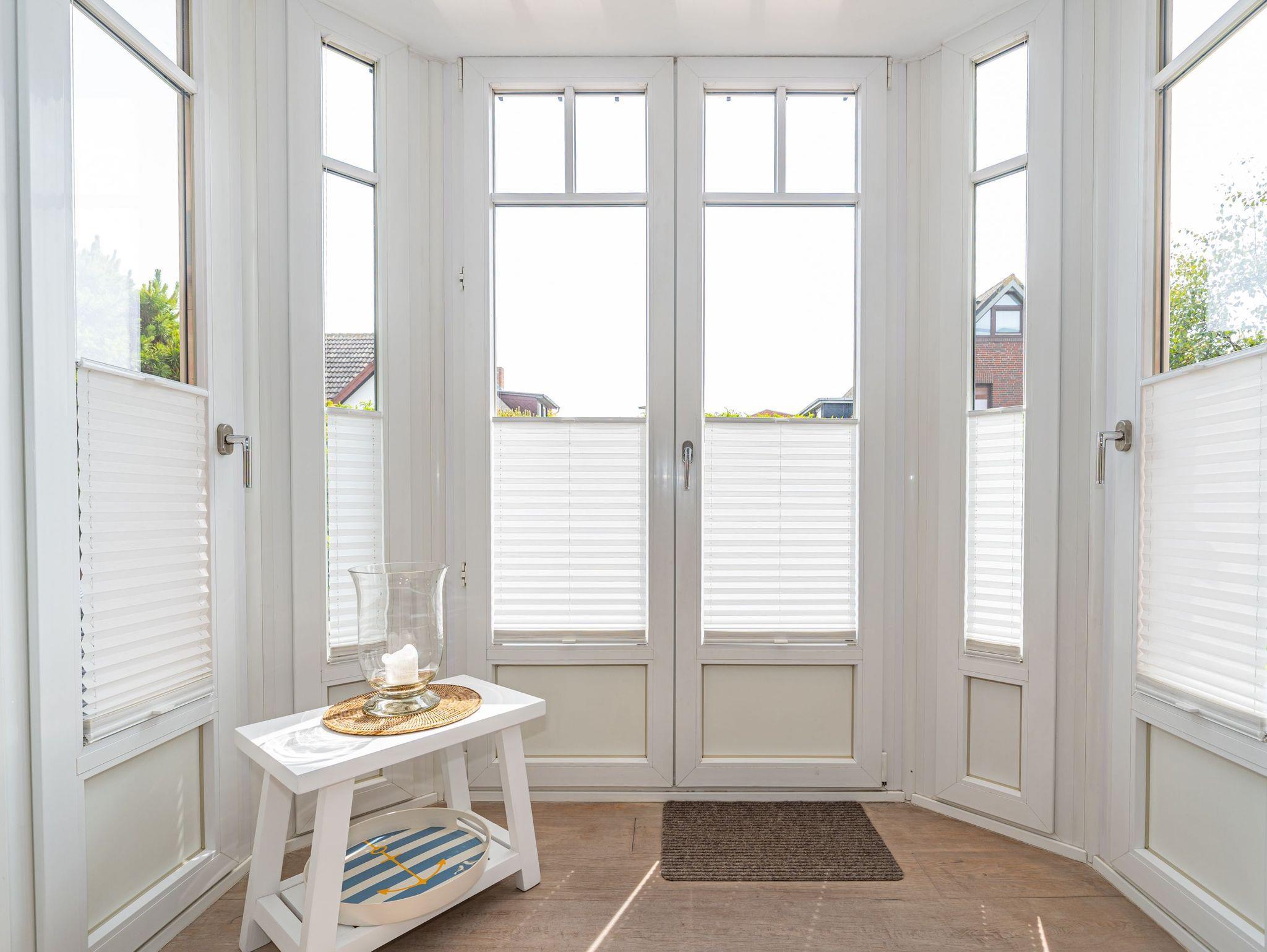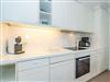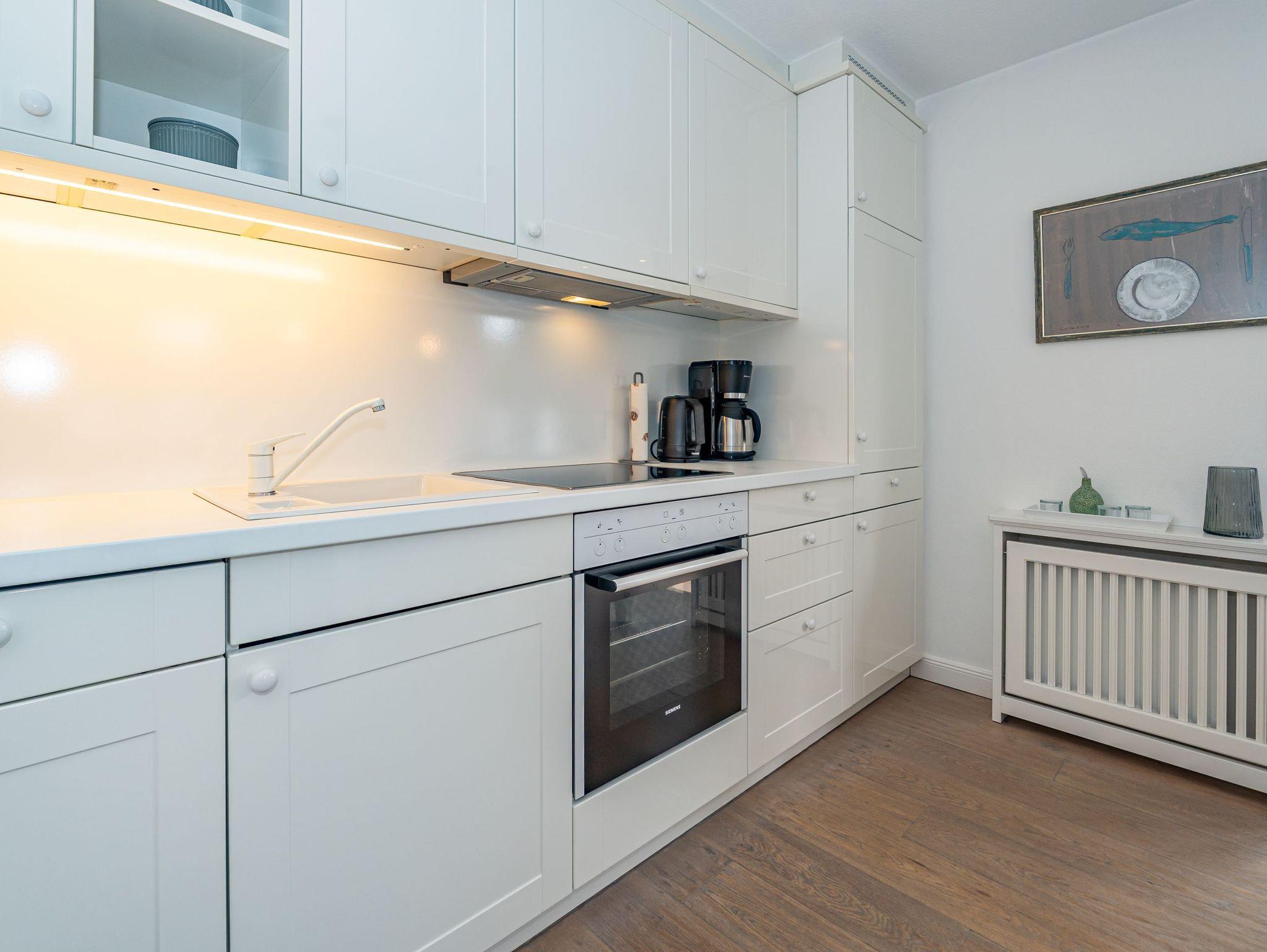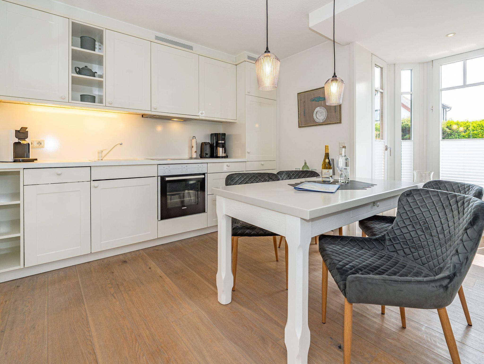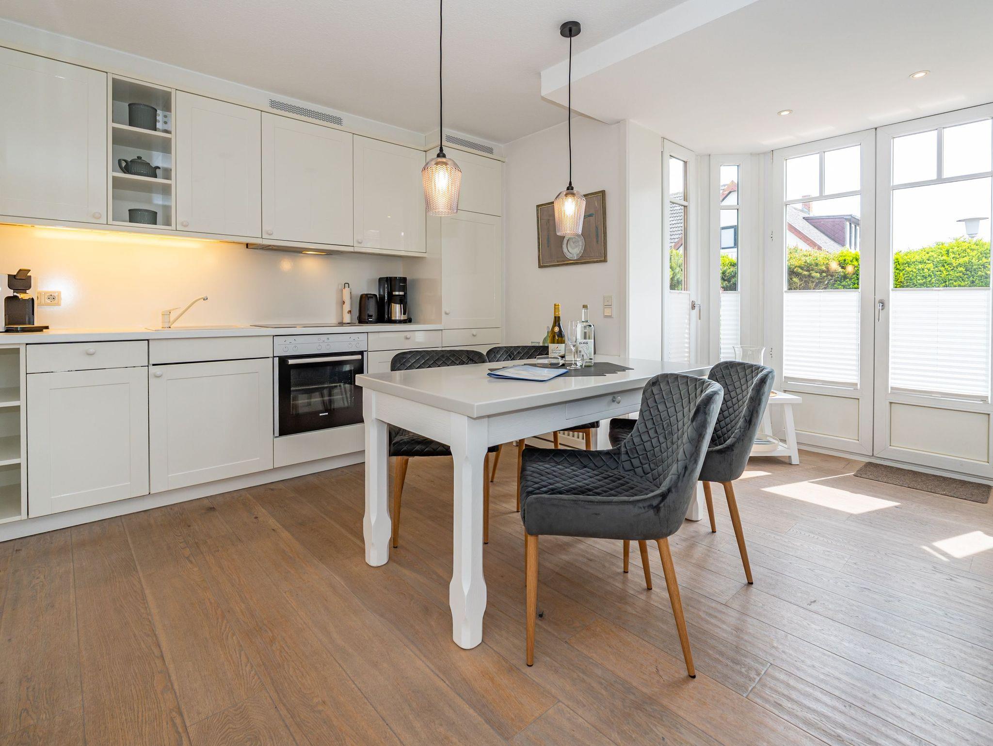 Im Eingangsbereich befindet sich die Diele mit Garderobe. Daran schließt das Wohnzimmer mit direktem Zugang zur geschützten Südterrasse an. Der Wohnraum ist mit einer Sitzgarnitur (2-Sitzer-Couch mit hochwertiger ausziehbarer Schlafmöglichkeit und 2 Sesseln), einem separaten Essplatz, Flachbild-TV, WLAN und einer offene Küche ausgestattet. Die voll ausgestattete weiße Hochglanzküche lässt mit Geschirrspüler, Ceranfeld (4 Felder) und Backofen kaum Wünsche offen. Kaffeemaschine, Wasserkocher und Toaster gehören zur Grundausstattung.[nbsp][nbsp]