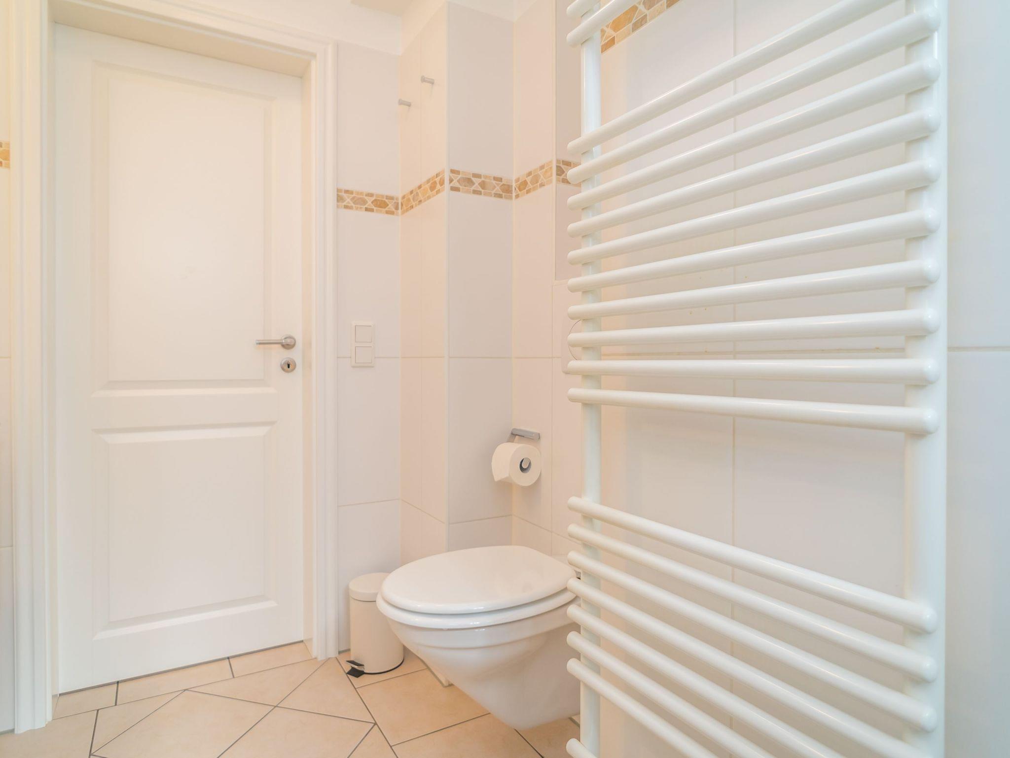 Das Badezimmer ist mit Dusche (mit bodengleichem Einstieg), Waschtisch, Handtuchtrockner, Föhn, WC und Fenster ausgestattet.