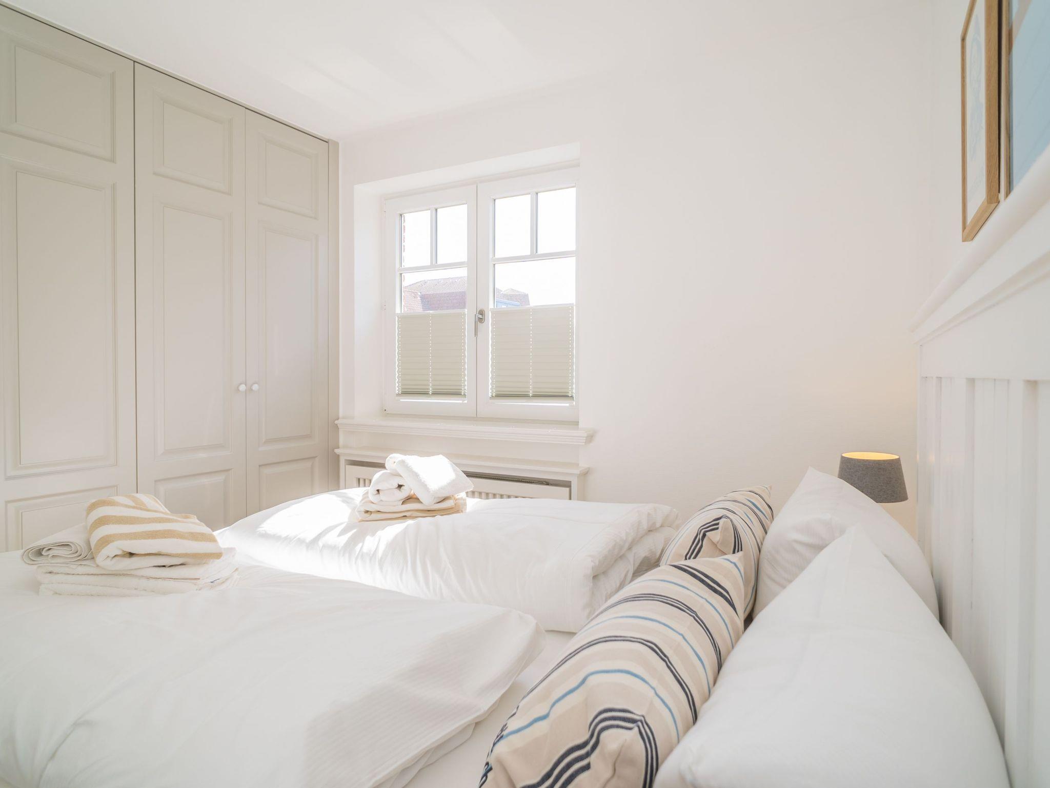 Das separate Schlafzimmer hat ein Doppelbett (mit guten Einzelmatratzen, je 80 x 200cm) und viel Schrankraum.