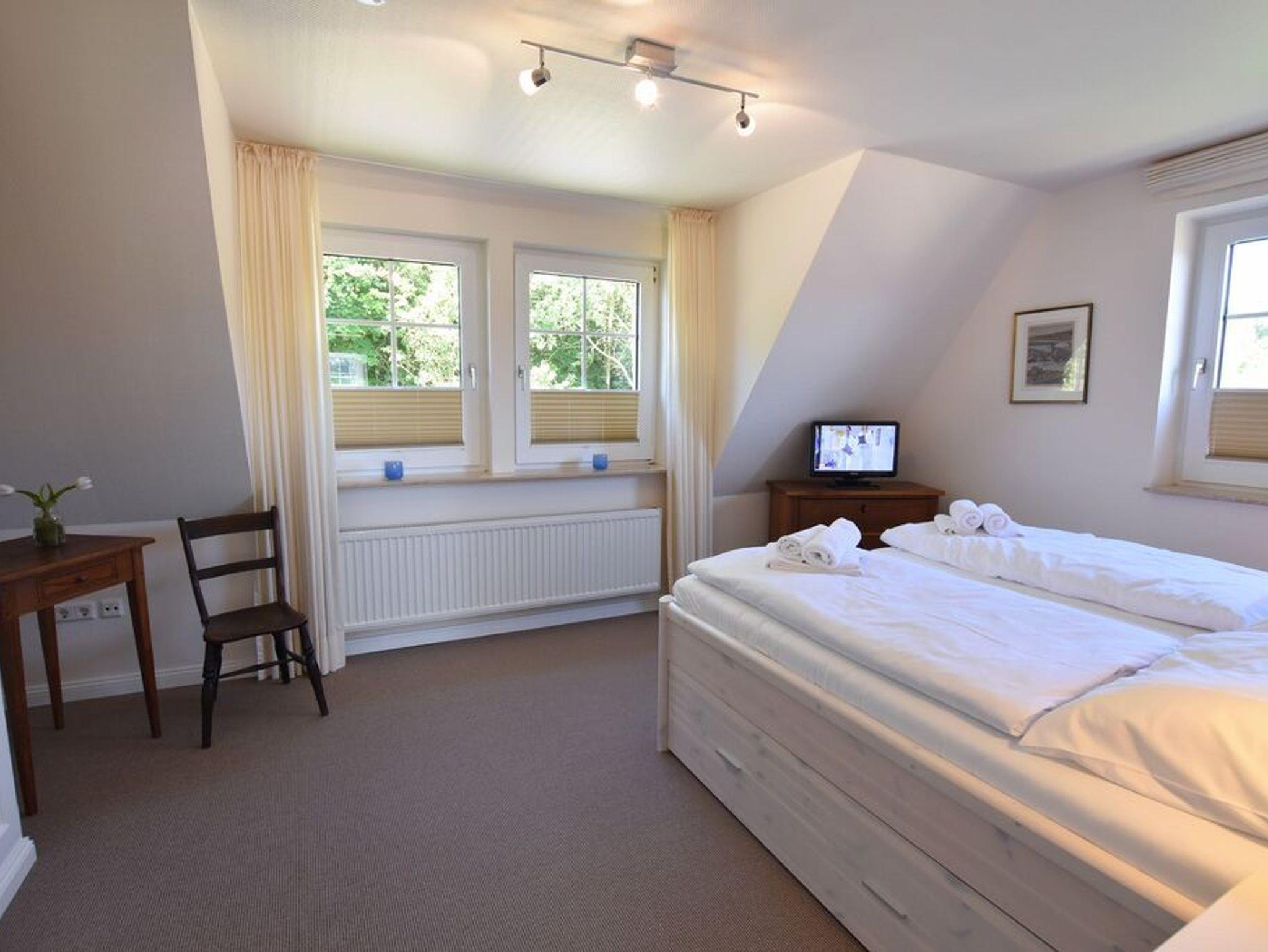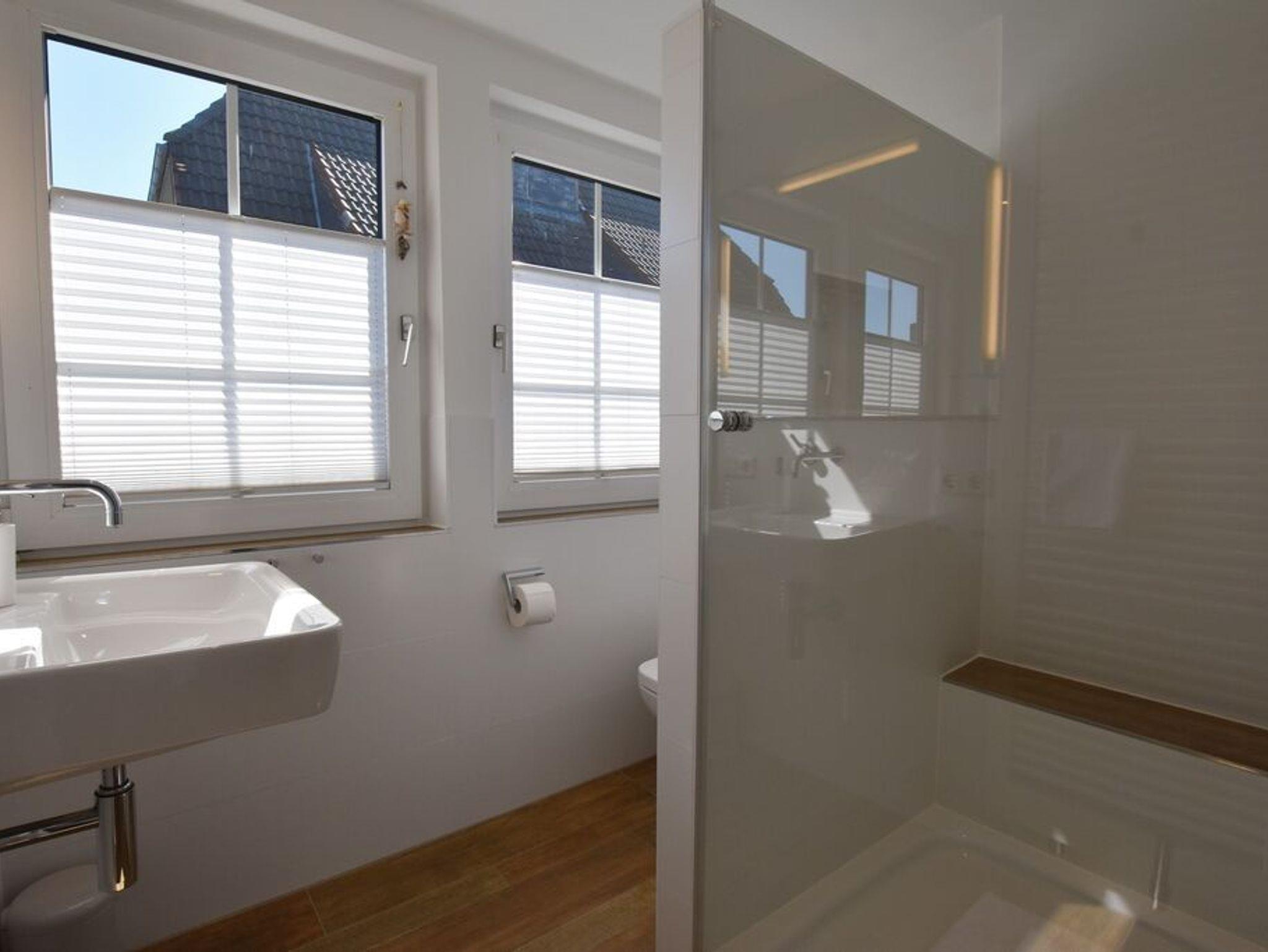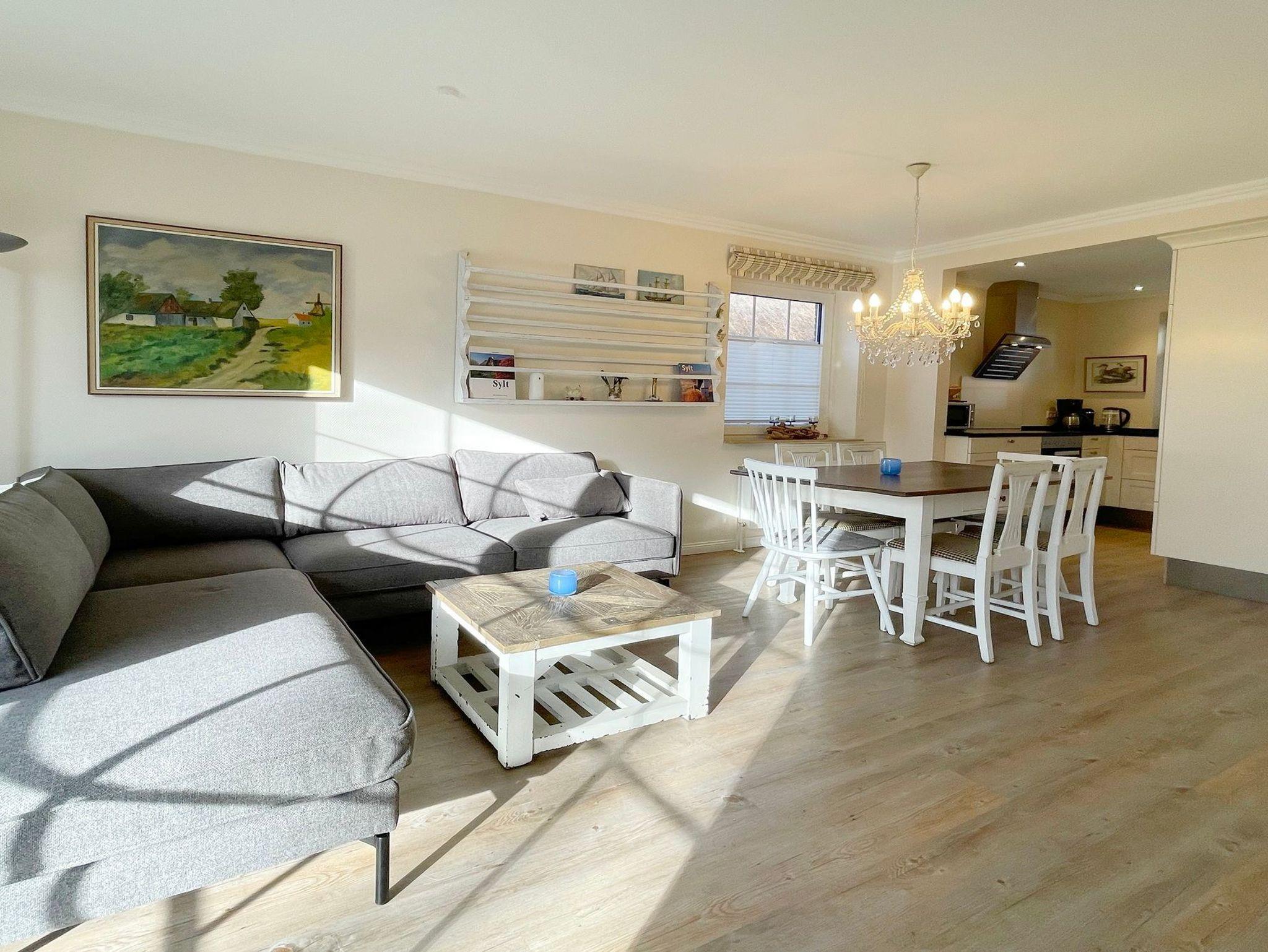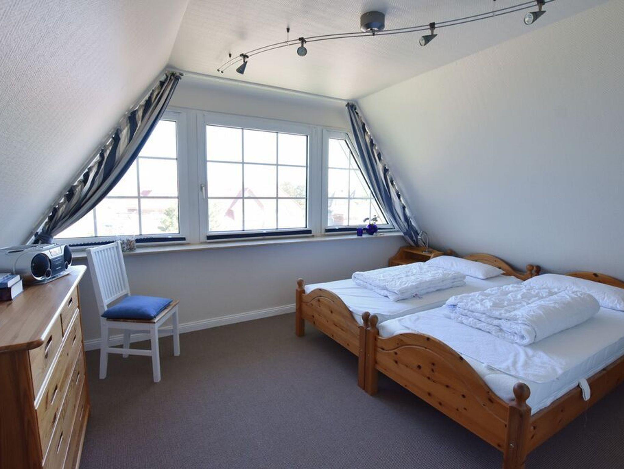 ir freuen uns Ihnen mitteilen zu können, dass ab sofort eine Doppelhaushälfte in Strandnähe am Süd-Wäldchen zur Verfügung steht. Im Erdgeschoss befinden sich das Wohnzimmer mit offener Küche und Zugang zur möblierten West-Terrasse, ein Flur sowie ein Gäste-WC ( mit Duschmöglichkeit ). Im Obergeschoss befinden sich ein Schlafzimmer mit Doppelbett, Kleiderschrank und Flachbildfernseher, ein zweites Schlafzimmer mit zwei Einzelbetten, Kleiderschrank und Fernseher sowie ein modernes Badezimmer mit Dusche.