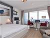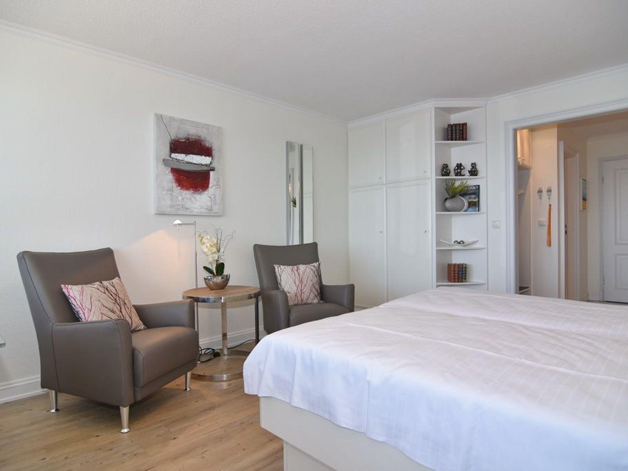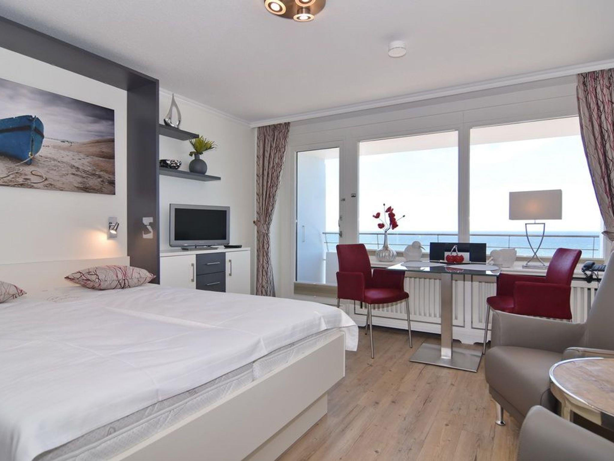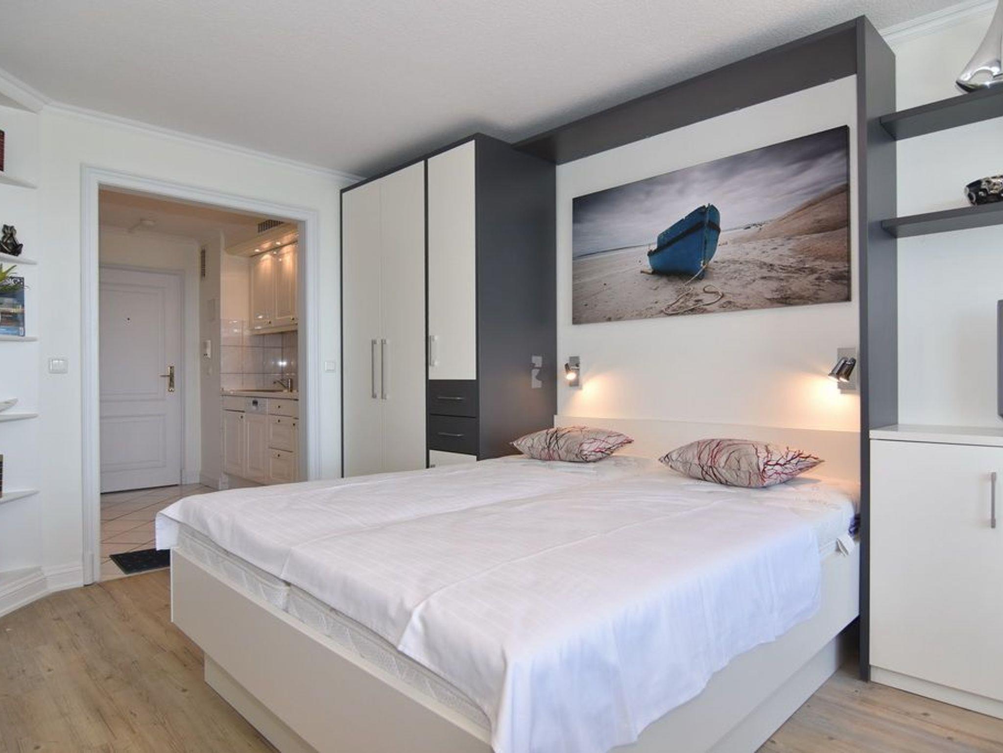 Exklusive 1-Zimmer-Ferienwohnung im Haus Metropol im 11.OG mit Westbalkon. Ca. 34m². Nichtraucher! Wohn-/Schlafraum mit Doppelbett (160x200, 2 Matratzen) 2 Sesseln, Eßtisch am Fenster mit herrlichem Meerblick, Flat-TV/Radio/W-Lan (ohne Gewähr). Hübsche Küchenzeile mit Geschirrspüler und Ceranherd im Flurbereich, Duschbad/WC. Möblierter Balkon. Tierhaltung verboten! Bettwäsche und Handtücher sind zur Anreise aufgezogen. Ein PKW-Stellplatz kann kostenpflichtig zugebucht werden.
