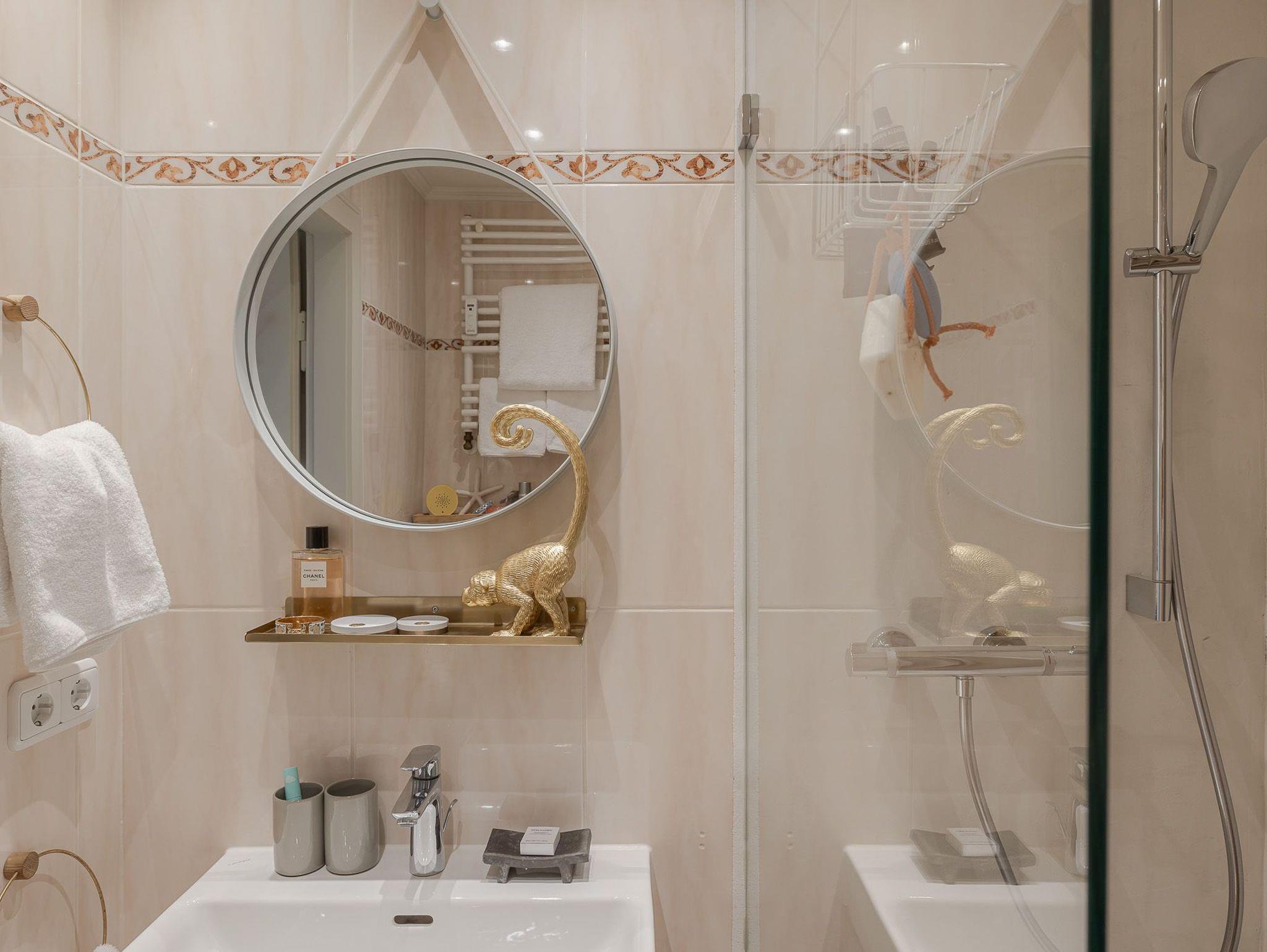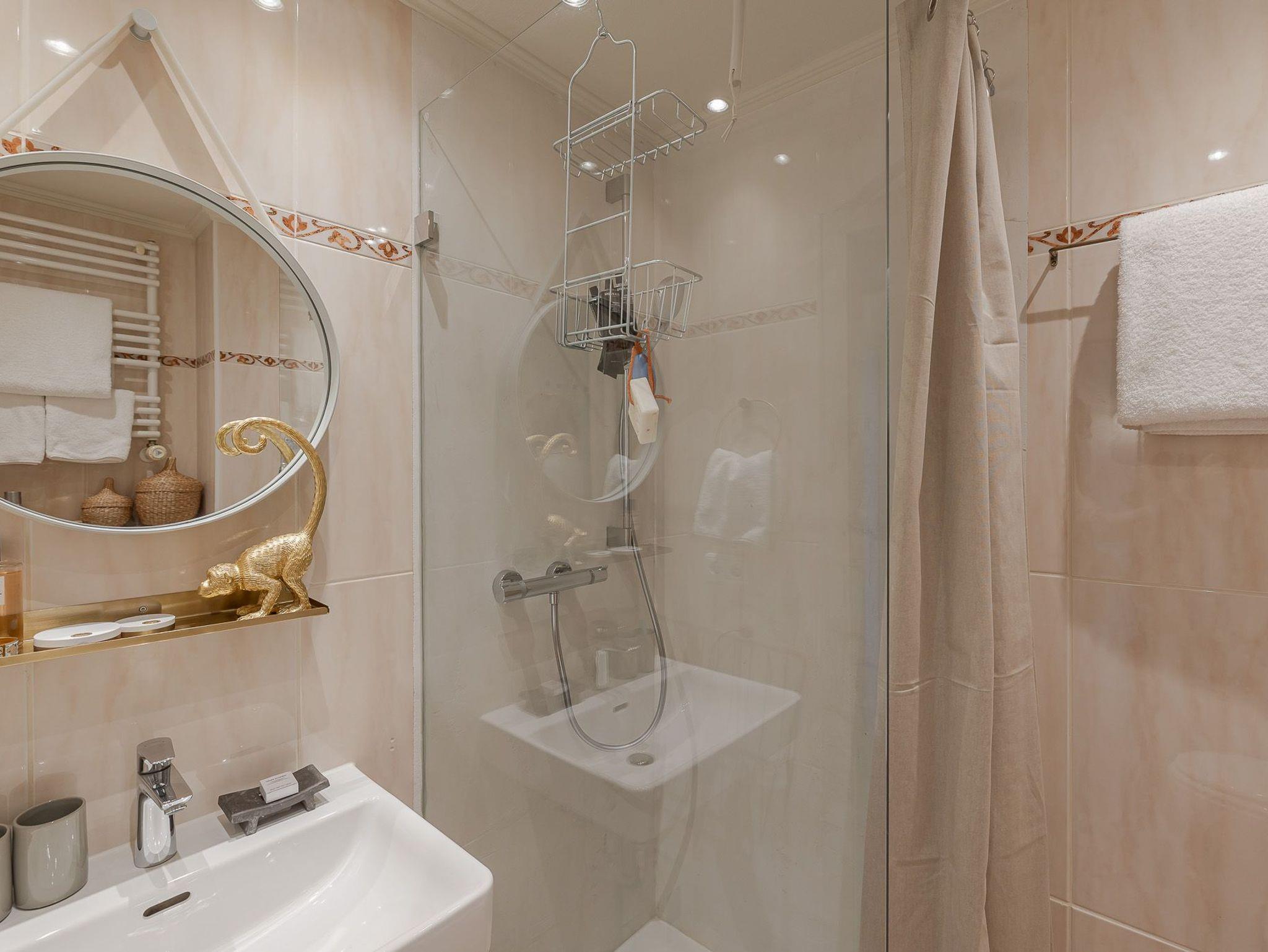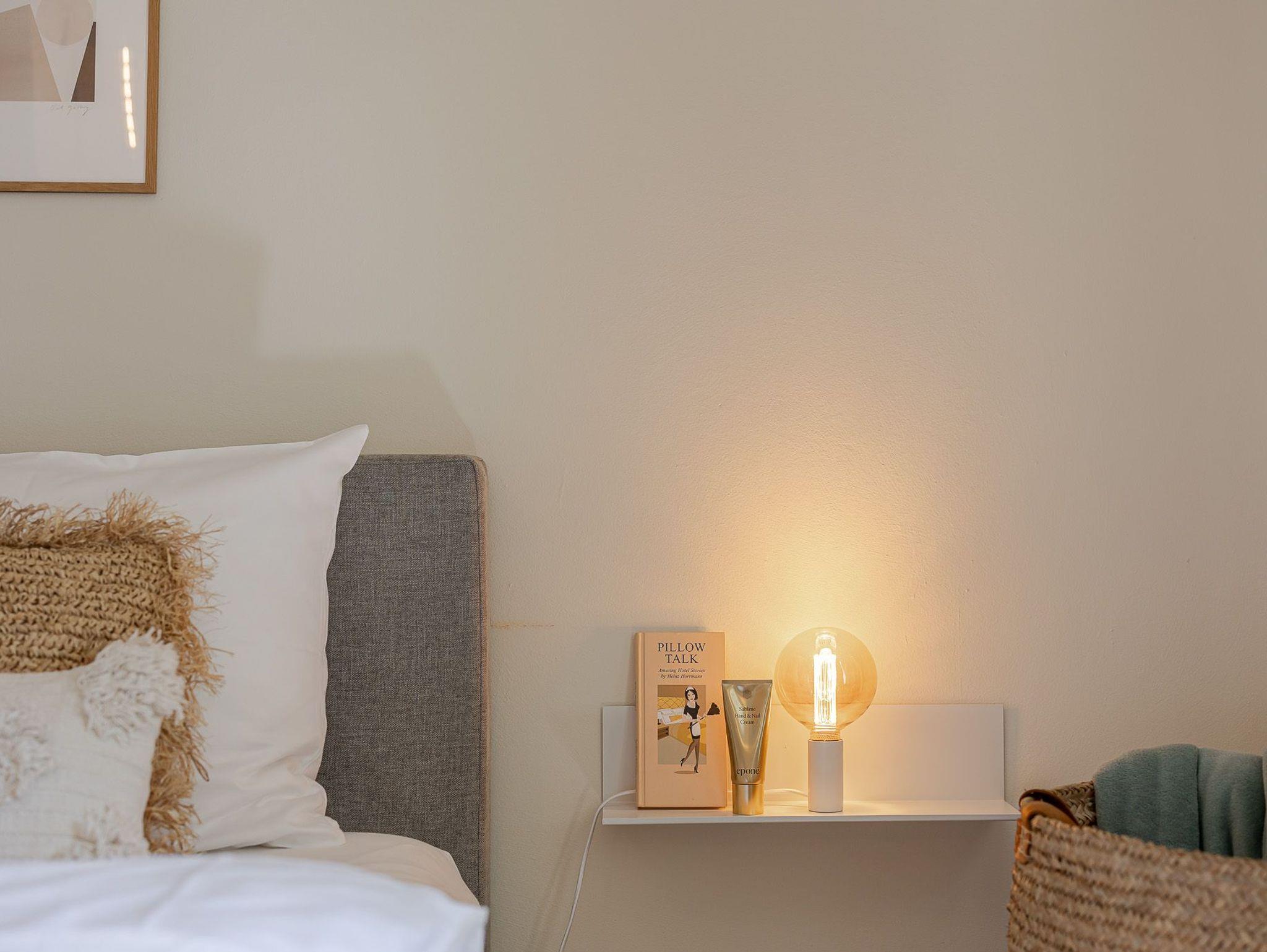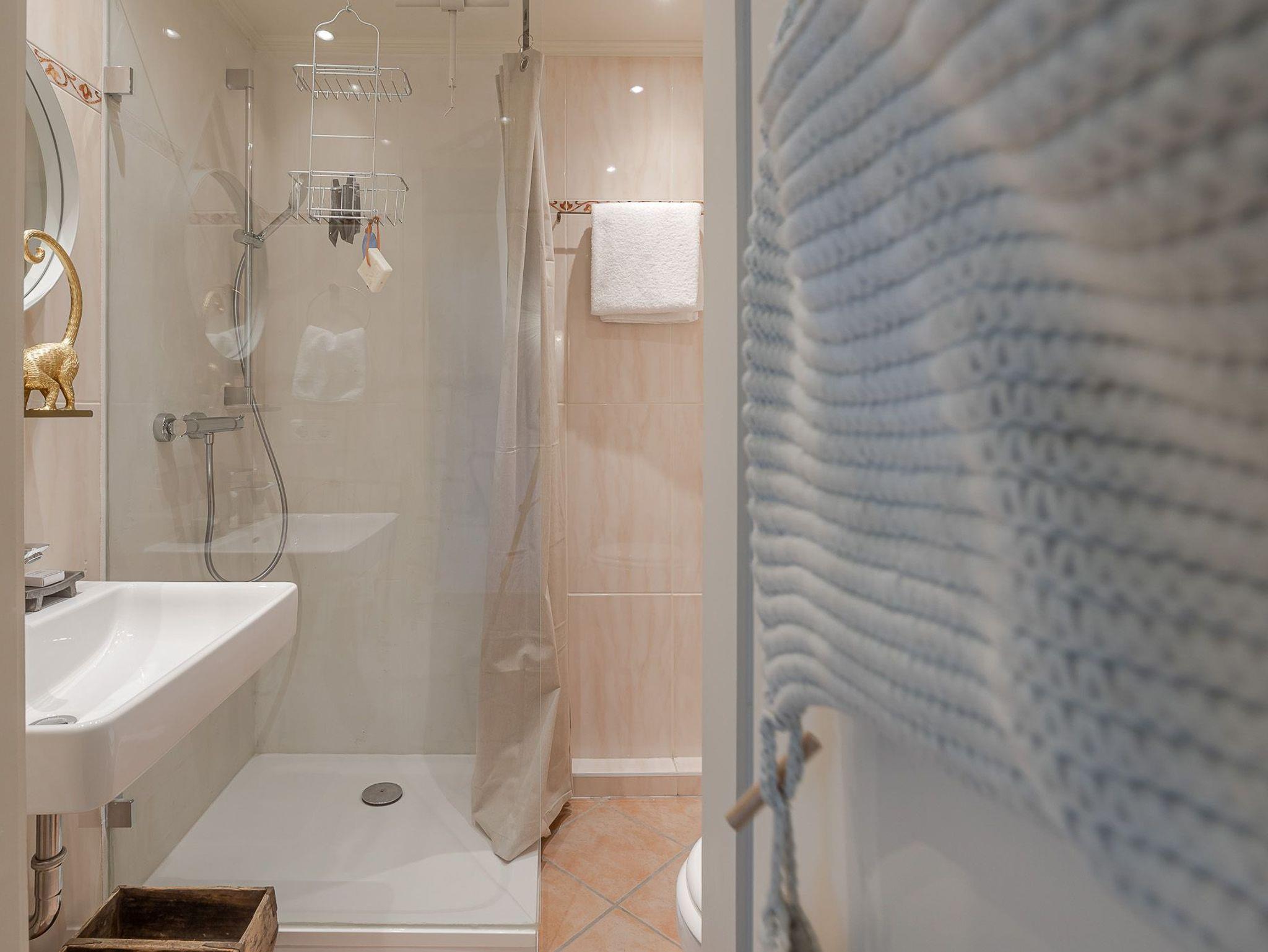 Das großzügige Schlafzimmer bietet Ihnen höchsten Komfort und lädt zum Entspannen ein. Es ist mit einem hochwertigen Boxspringbett und einem praktischen Kleiderschrank ausgestattet. Das Badezimmer überzeugt mit einer modernen Dusche, einem WC sowie einem Handtuchheizkörper, der an kühleren Tagen zusätzlichen Komfort bietet.