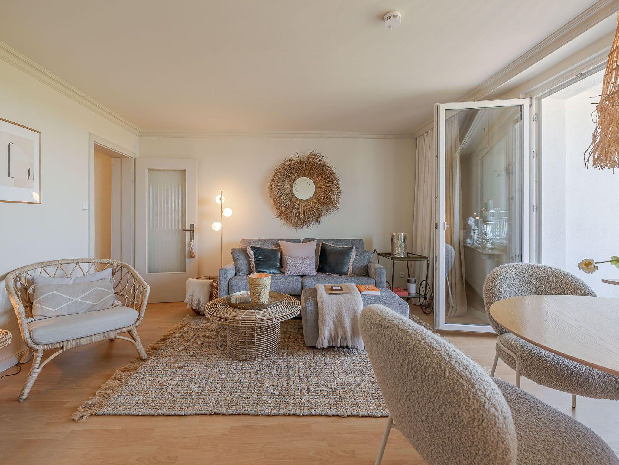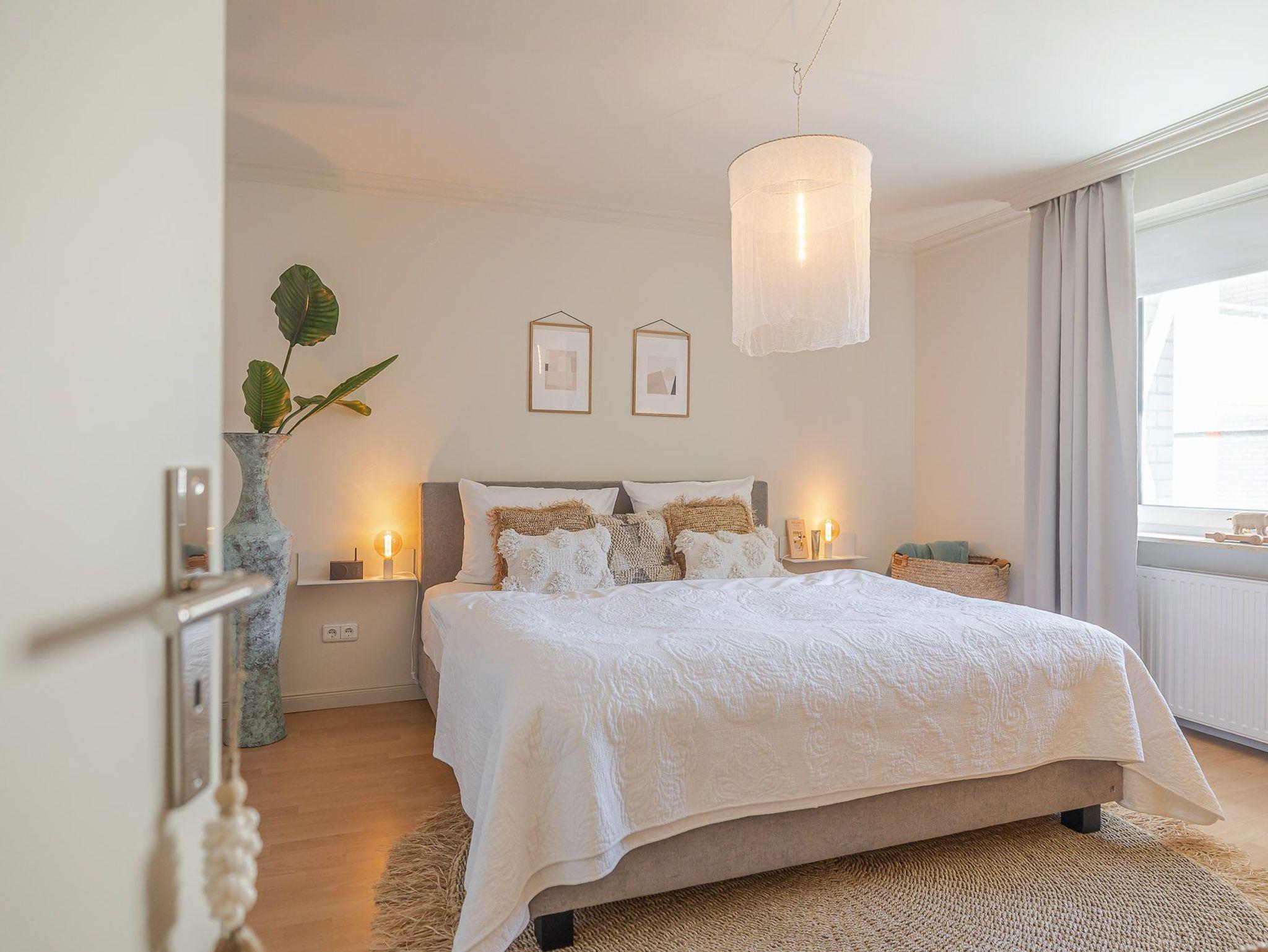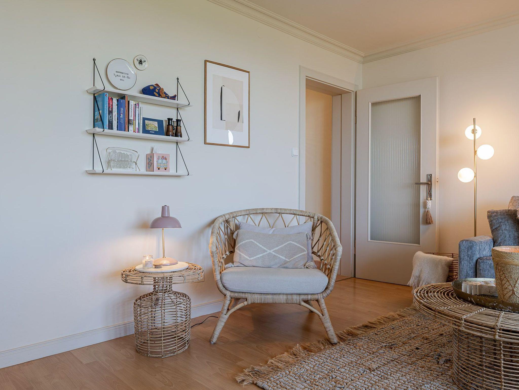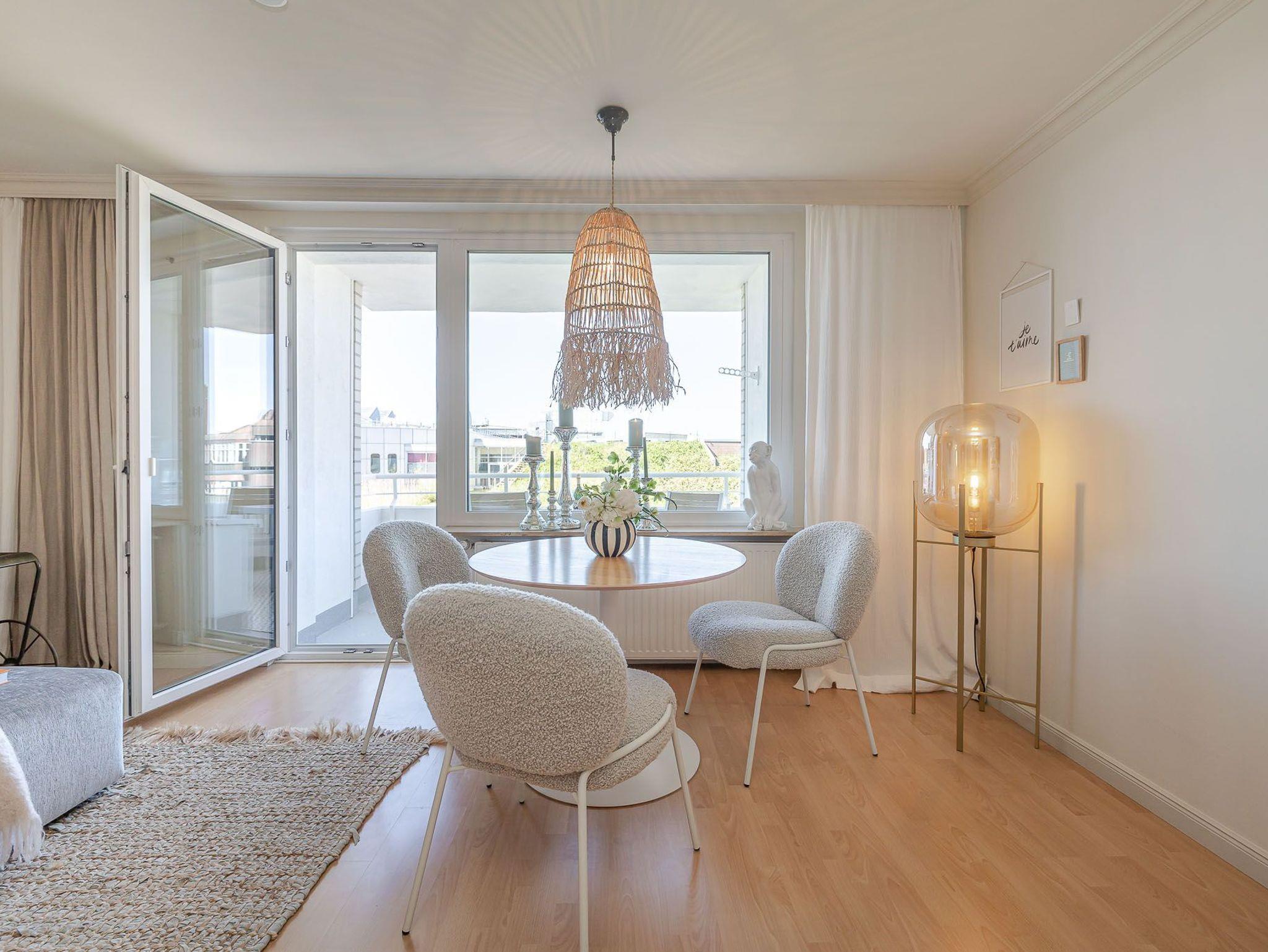 Mit einer großzügigen Wohnfläche von rund 54 m² bietet die Wohnung Platz für 2 Personen und ein Kleinkind. Sie befindet sich im zweiten Stock des Hauses und ist der ideale Ort für eine entspannte Auszeit auf der Insel. Der offene Wohnbereich ist lichtdurchflutet und wurde mit hochwertigen Möbeln ausgestattet, darunter stilvolle und kuschelige Esszimmerstühle von Freifrau sowie eine wertige Couch, die als Schlafcouch genutzt werden kann. Der Bereich ist perfekt für gemütliche Stunden und entspanntes Zusammensitzen.