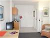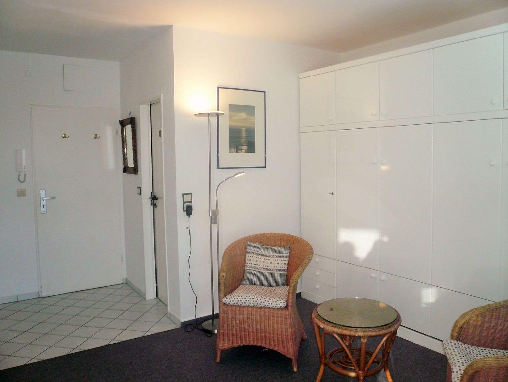 Im Wohnzimmer des Appartements stehen eine Couch und, vor dem Fenster, der Essplatz. In einer Schrankwand ist das Doppelschrankbett untergebracht. Die Küchenzeile ist zum Wohnzimmer hin offen. Das Bad hat eine Dusche. In der Wohnung gibt es W-Lan.
