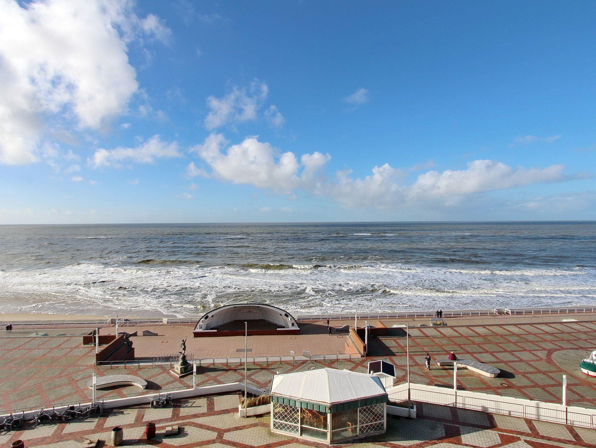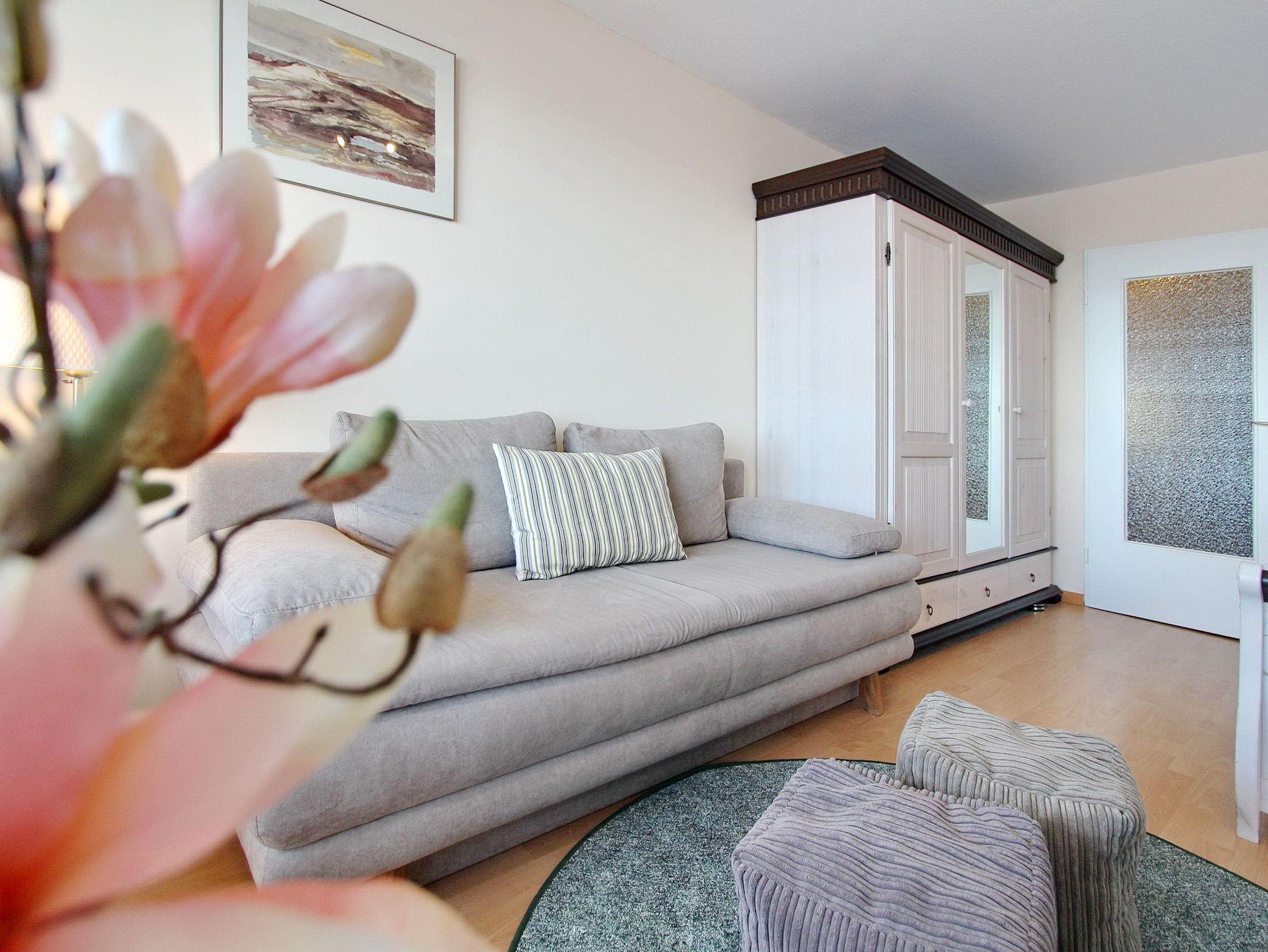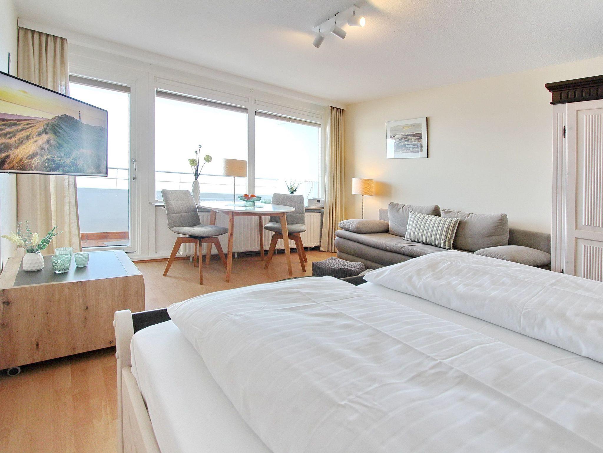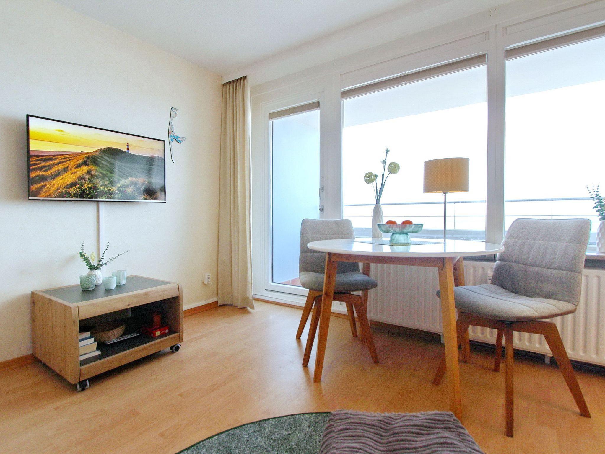 Einzimmerwohnung in der 4. Etage im Haus Metropol mit herrlichem Blick über den Strand und das Meer. Der kombinierte Wohn-/Schlafraum mit vorgelagertem Westbalkon und Balkonmöbeln verfügt über ein modernes Doppelbett, eine große Couch sowie eine Essgruppe mit 2 Stühlen am Fenster. In der Wohnung wurde Laminatfußboden verlegt. Das Badezimmer hat eine Dusche und eine kleine Einbauküche mit Backofen befindet sich im Flur. Zur technischen Ausstattung dieser Nichtraucherwohnung gehört : ein Flachbildfernseher und ein Radio mit CD Player. Ein freies WLAN Netzwerk (WEG Haus Metropol - Passwortfrei - ohne Gewähr) steht ihnen ebenfalls kostenfrei zur Verfügung. Wohnungsgröße: ca. 34 m².