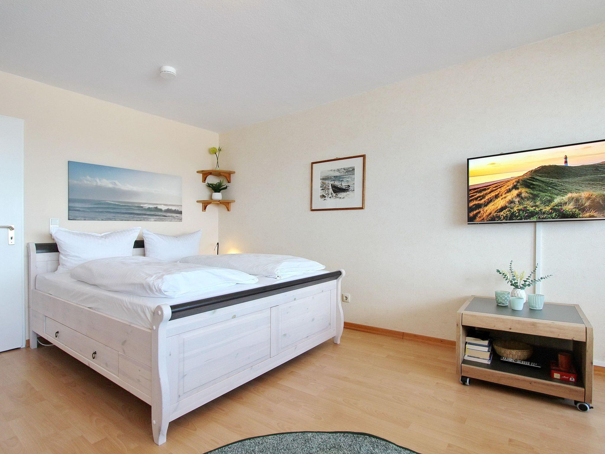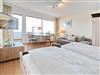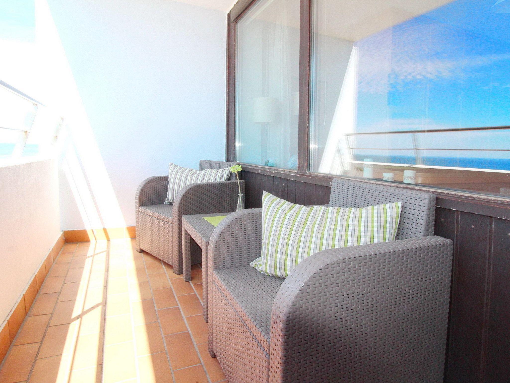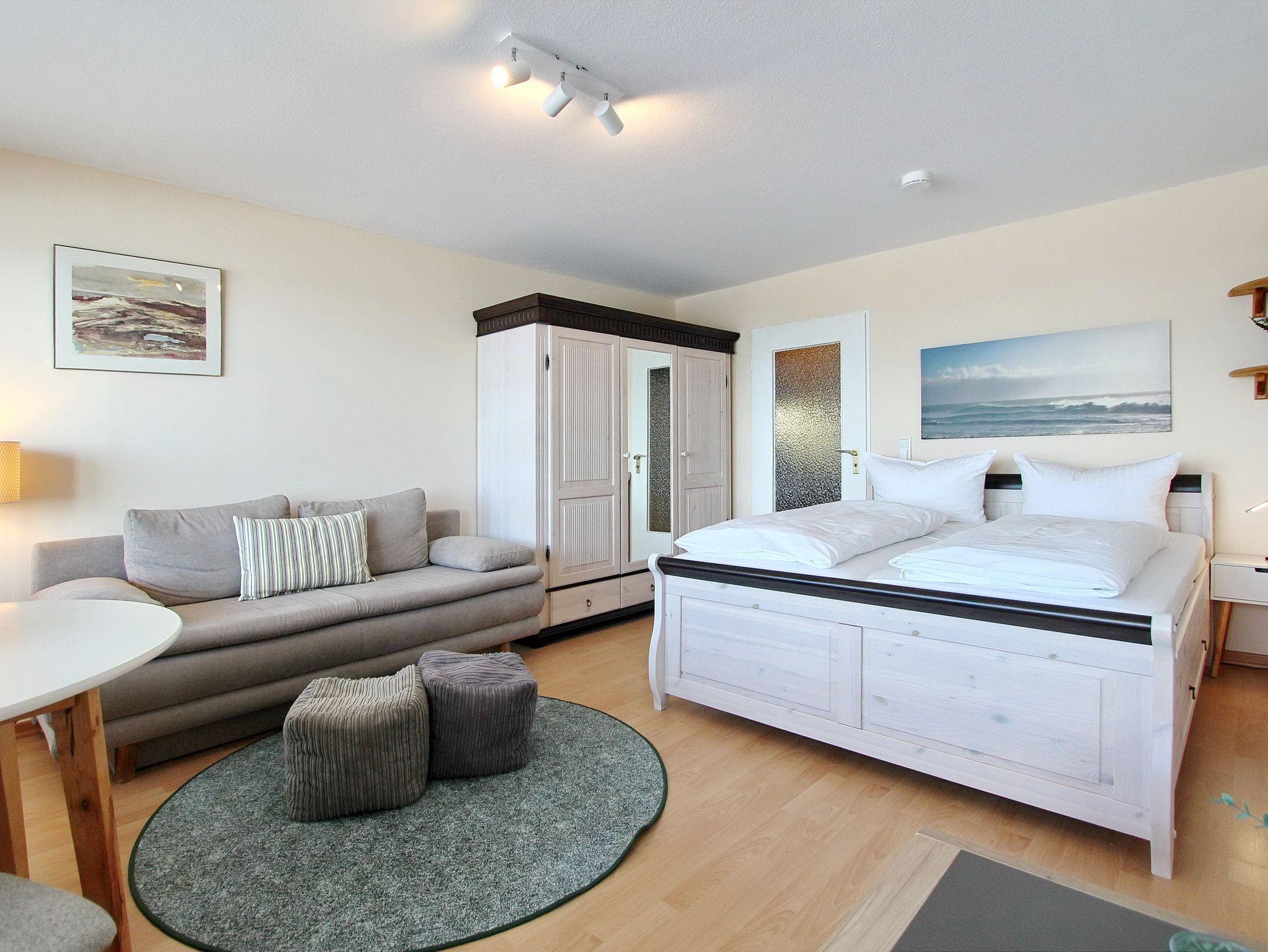 Einzimmerwohnung in der 4. Etage im Haus Metropol mit herrlichem Blick über den Strand und das Meer. Der kombinierte Wohn-/Schlafraum mit vorgelagertem Westbalkon und Balkonmöbeln verfügt über ein modernes Doppelbett, eine große Couch sowie eine Essgruppe mit 2 Stühlen am Fenster. In der Wohnung wurde Laminatfußboden verlegt. Das Badezimmer hat eine Dusche und eine kleine Einbauküche mit Backofen befindet sich im Flur. Zur technischen Ausstattung dieser Nichtraucherwohnung gehört : ein Flachbildfernseher und ein Radio mit CD Player. Ein freies WLAN Netzwerk (WEG Haus Metropol - Passwortfrei - ohne Gewähr) steht ihnen ebenfalls kostenfrei zur Verfügung. Wohnungsgröße: ca. 34 m².
