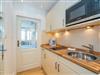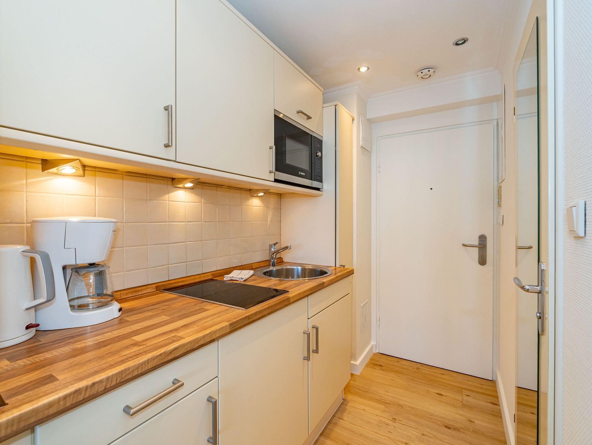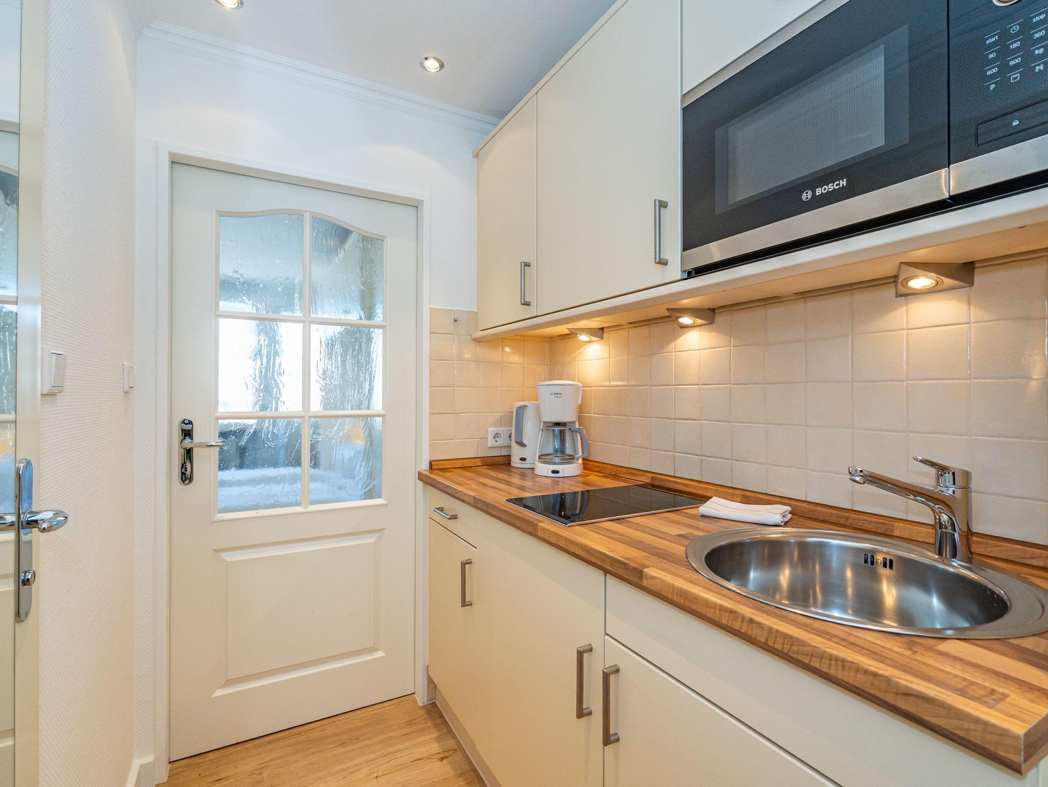 Die Küchenzeile hat eine Mikrowelle (mit Grillfunktion), Cerankochfeld, Kühlschrank mit 3*Gefrierfach. Kaffeemaschine, Wasserkocher und Toaster gehören zur Grundausstattung.