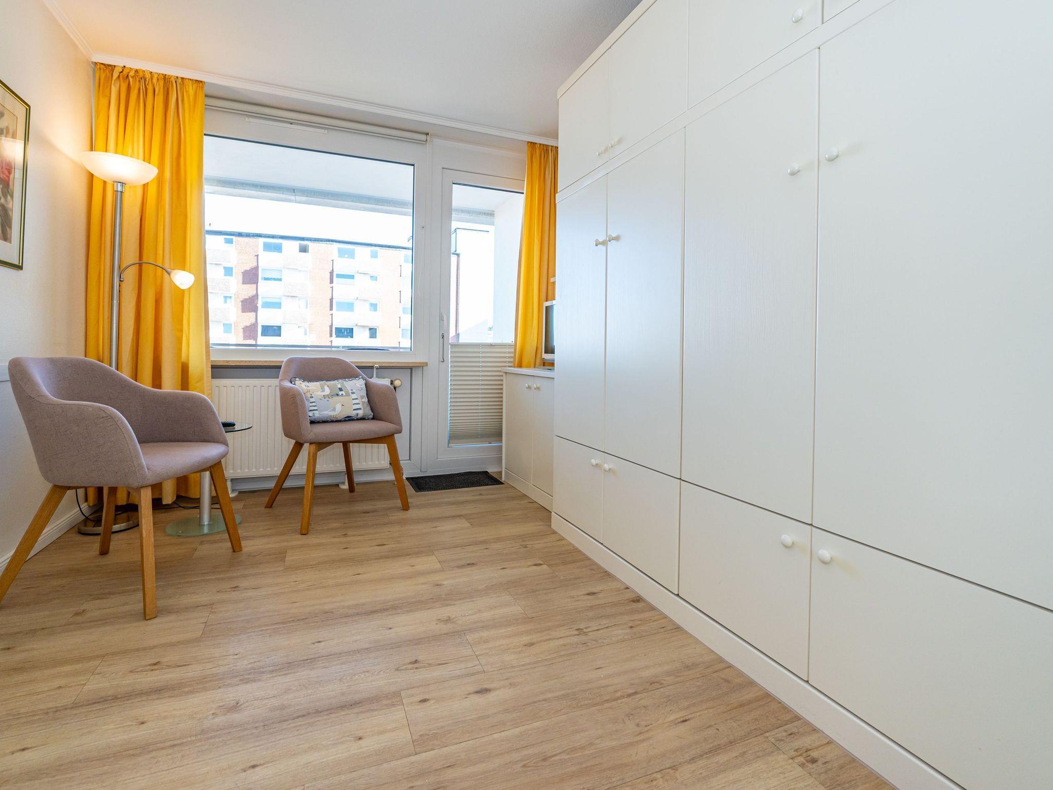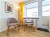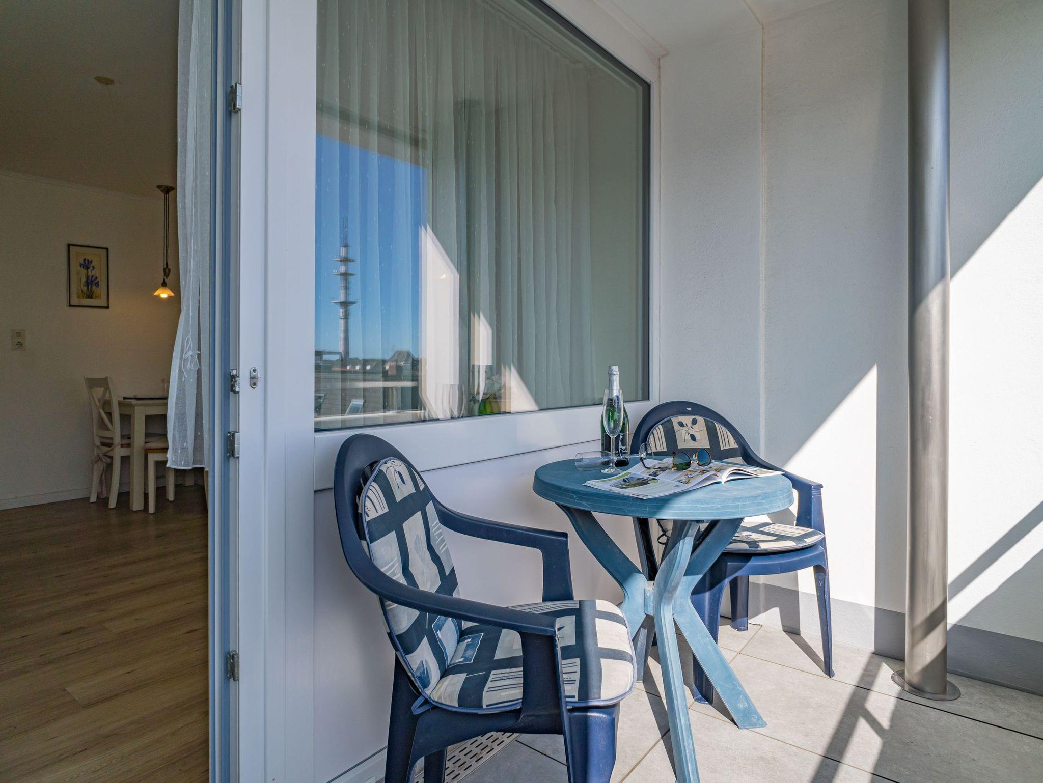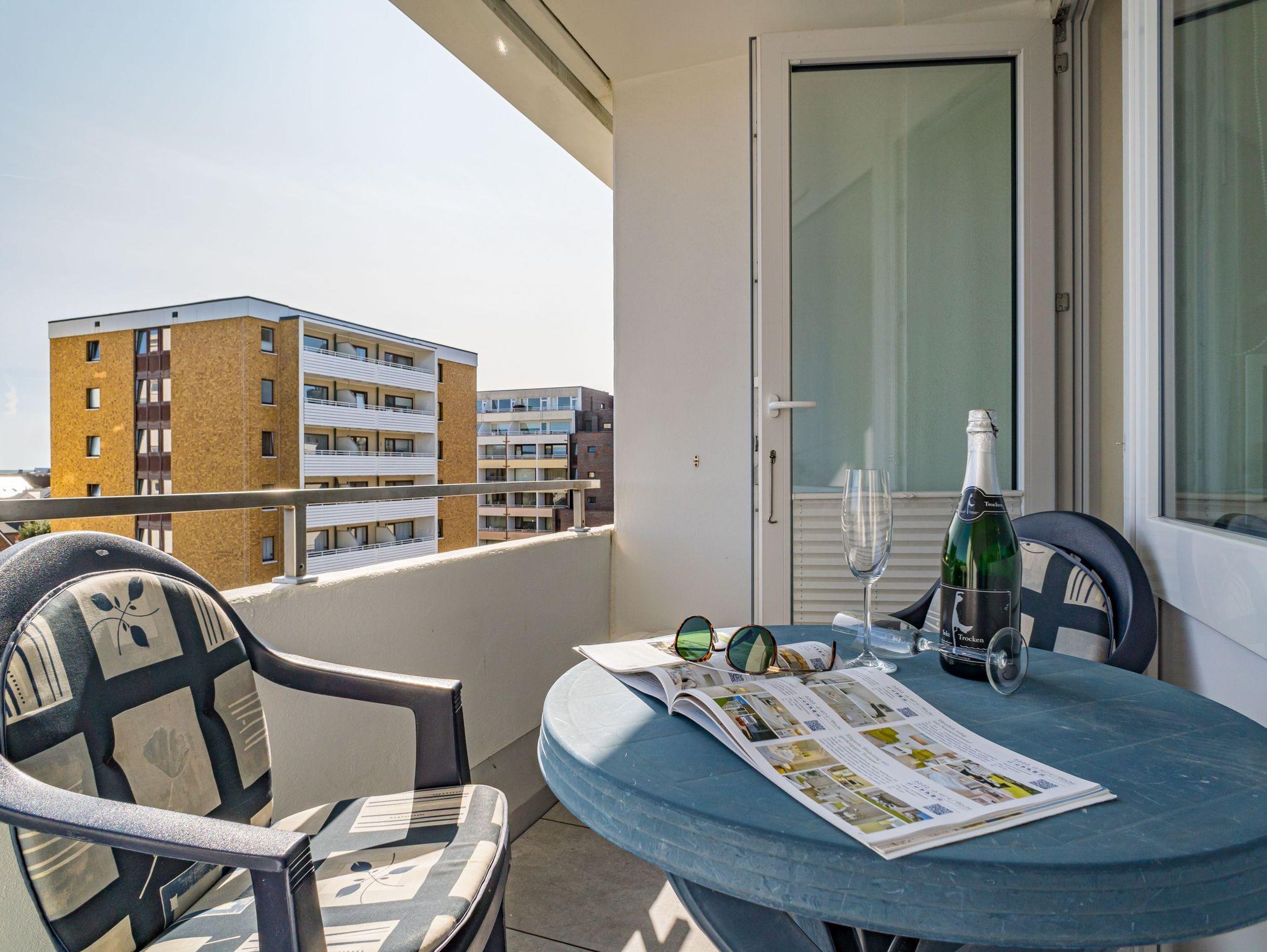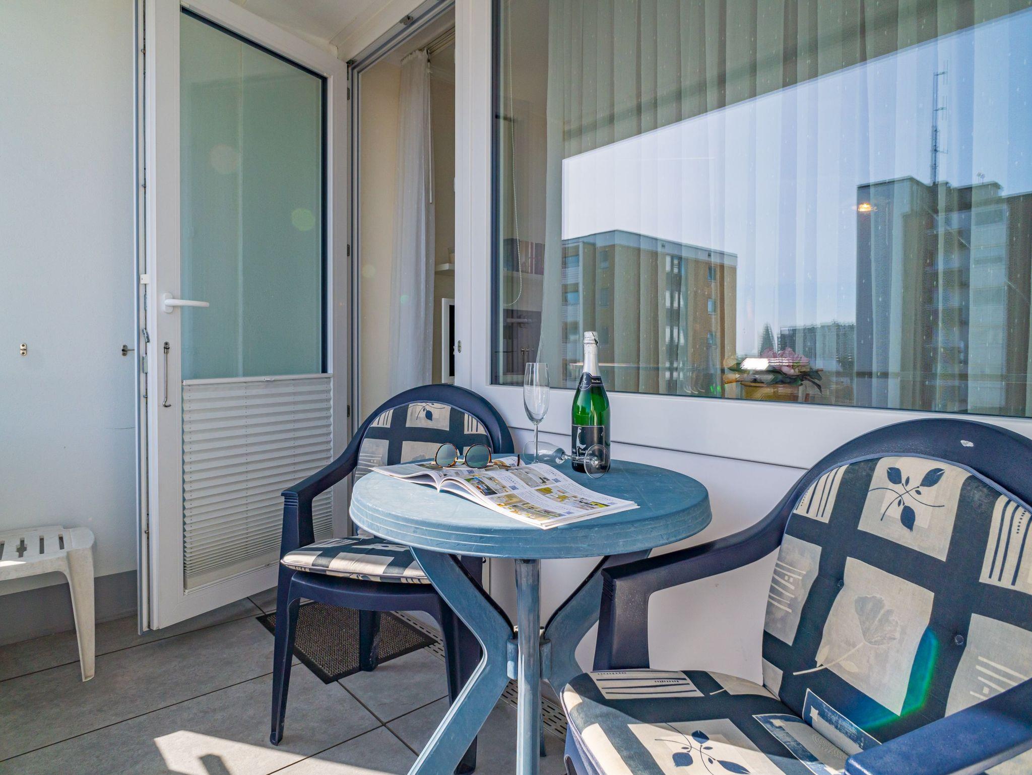 1-Zimmer-Ferienwohnung (ca. 21 m²) in der 4. Etage zur Landseite mit Ostloggia (Morgensonne, mit Balkonmöbeln und Auflagen) für max. 2 Personen.