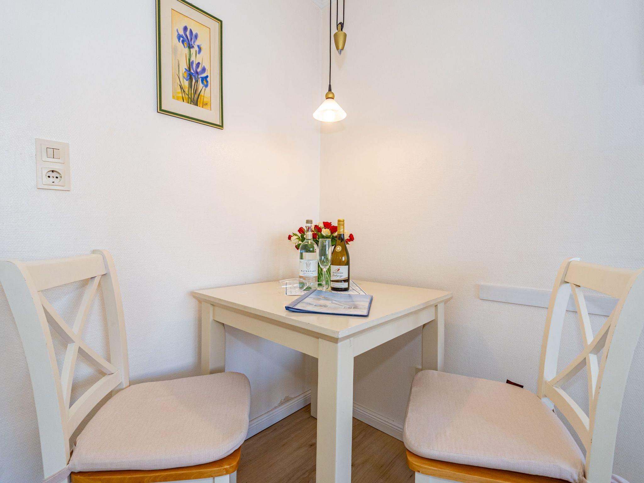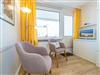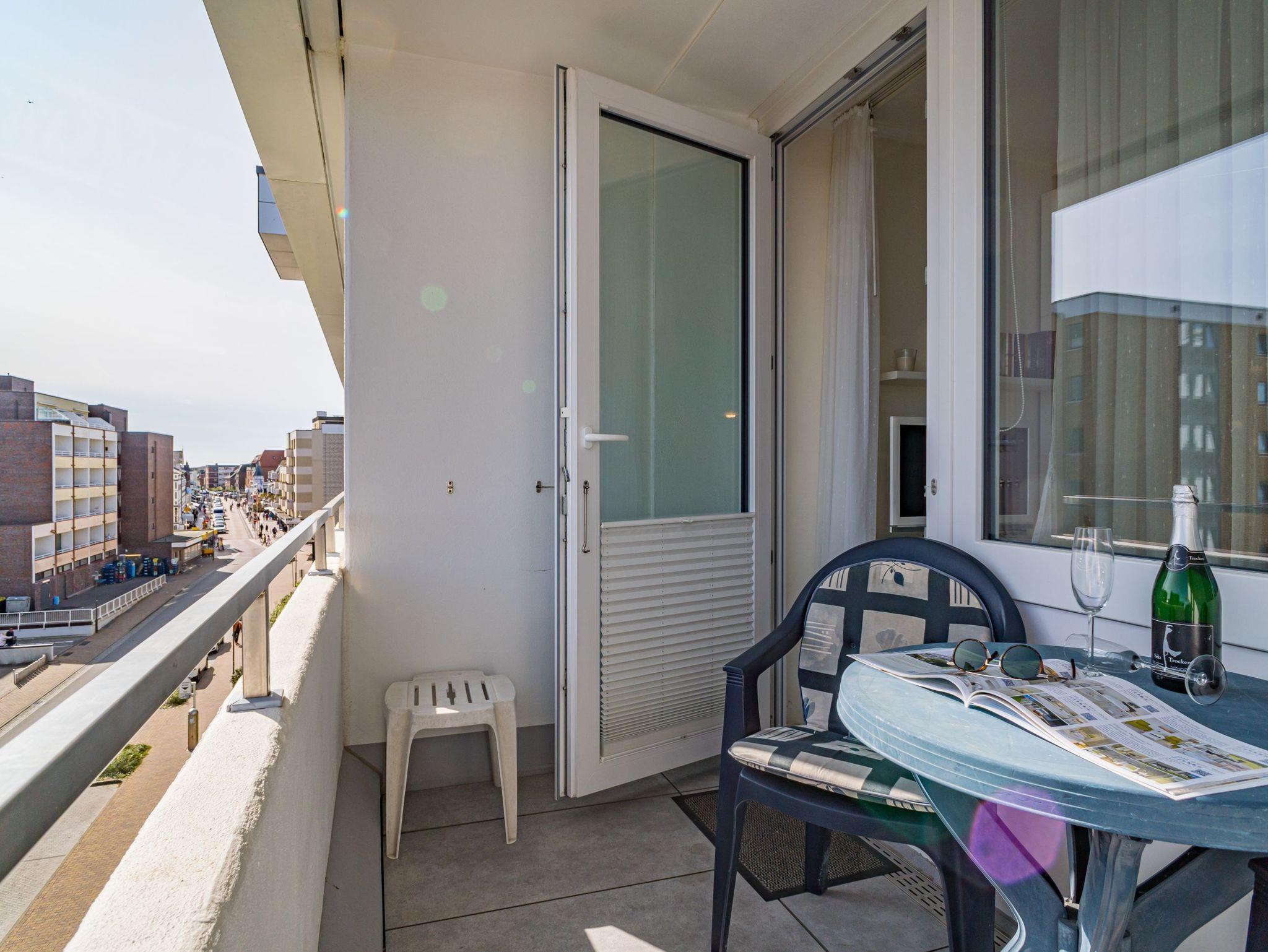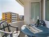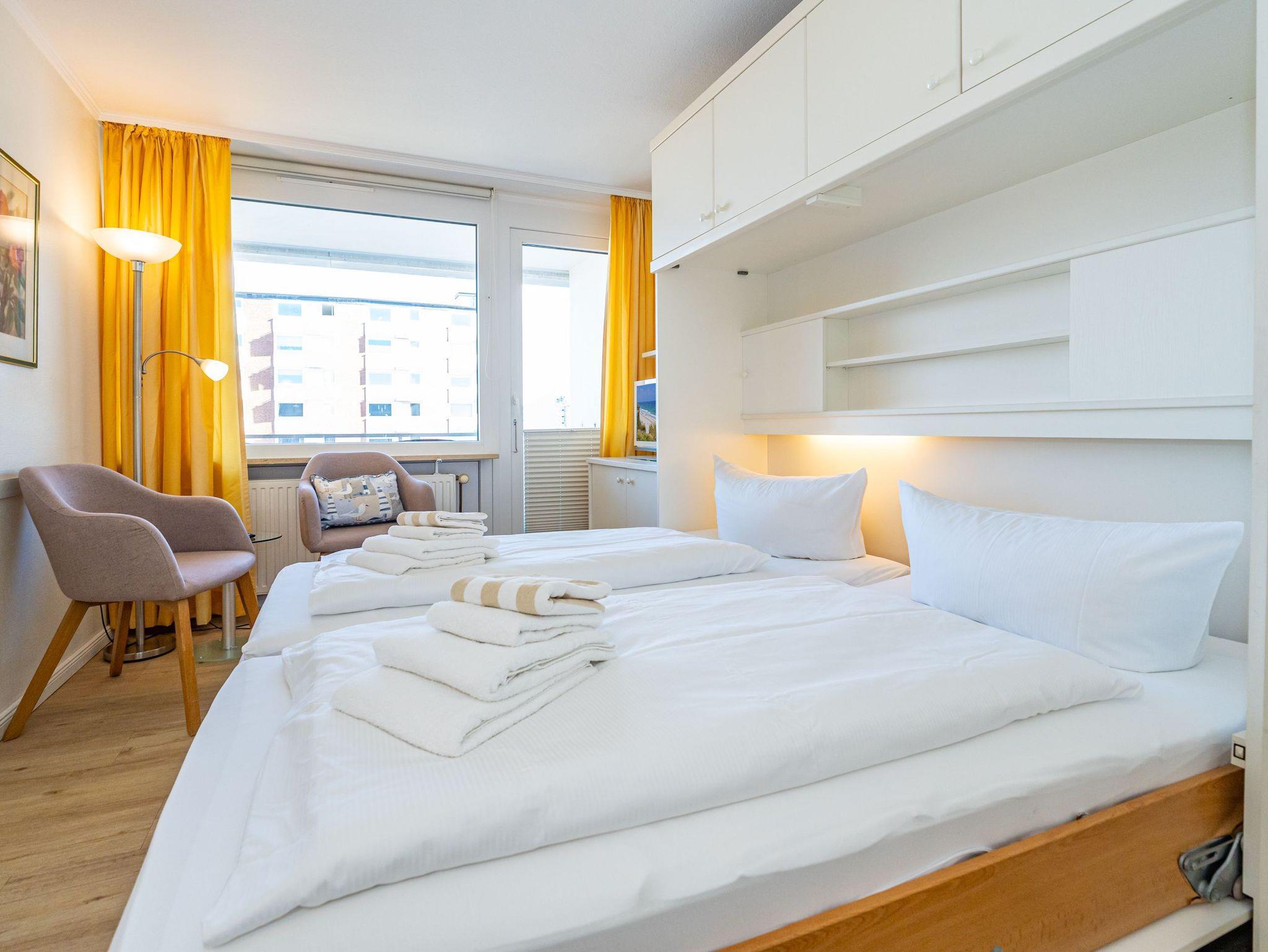 1-Zimmer-Ferienwohnung (ca. 21 m²) in der 4. Etage zur Landseite mit Ostloggia (Morgensonne, mit Balkonmöbeln und Auflagen) für max. 2 Personen.