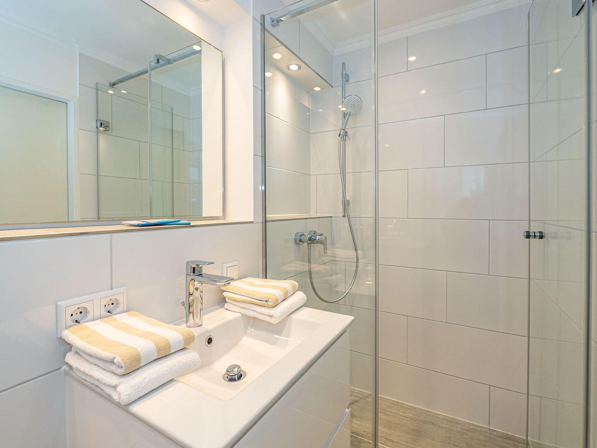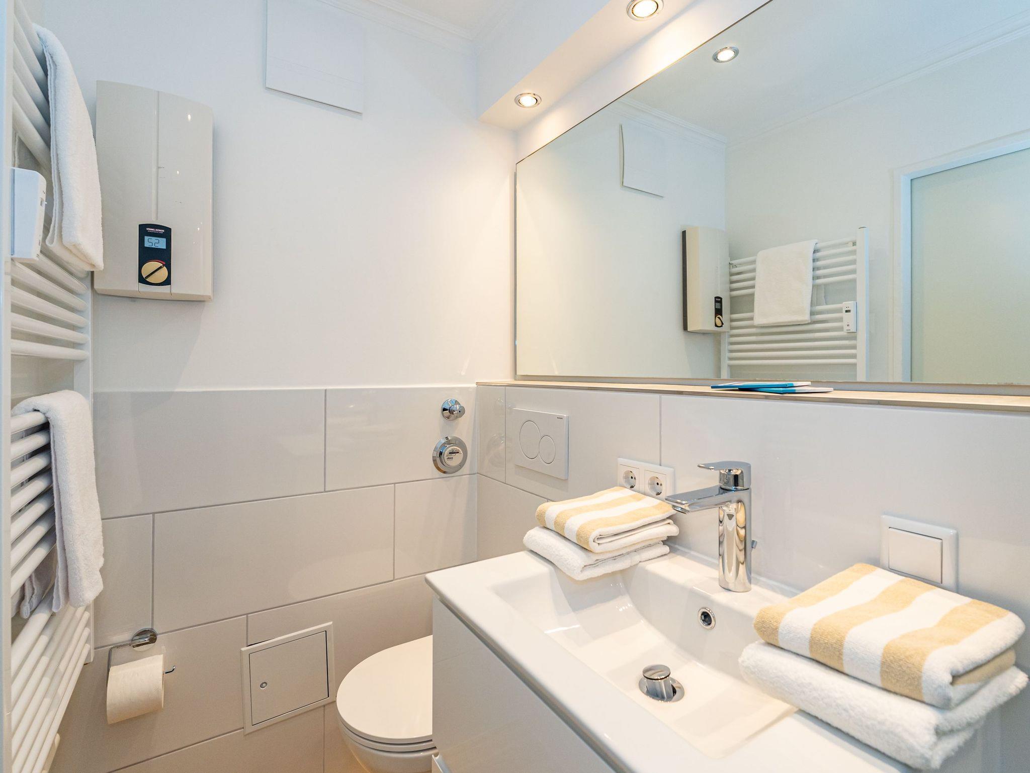 Im Bad befinden sich eine Dusche, ein WC und ein Waschtisch.