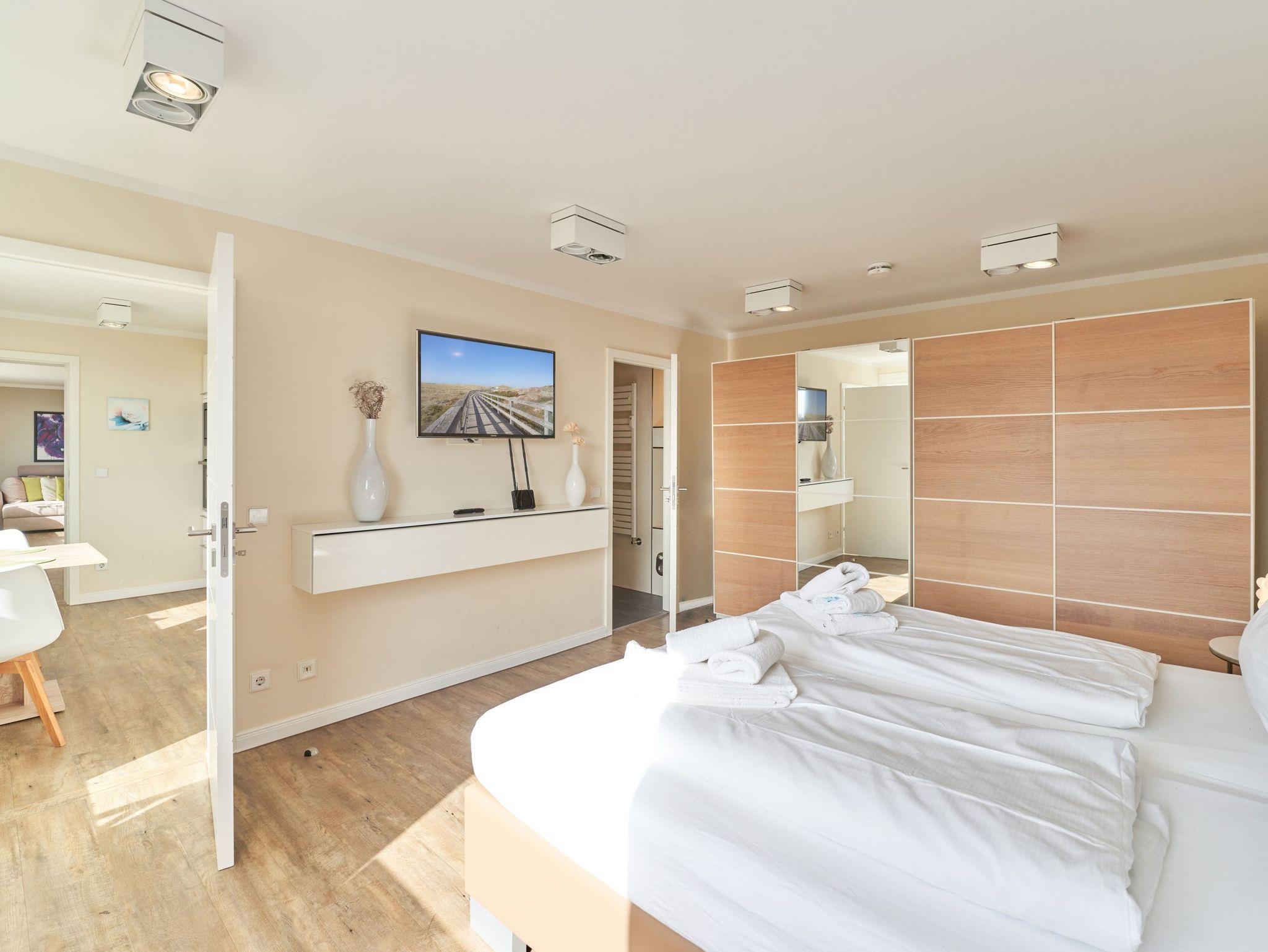Diese großzügige Ferienwohnung in Westerland auf Sylt ist der perfekte Ort für einen erholsamen Urlaub. Mit einer Fläche von 80 qm und zwei westlich ausgerichteten Balkonen, die einen herrlichen Meerblick bieten, ist sie ideal für entspannte Stunden im Freien. Das Schlafzimmer mit Doppelbett und praktischem Schiebetürenschrank sorgt für Komfort und ausreichend Stauraum.