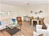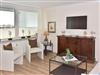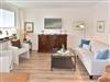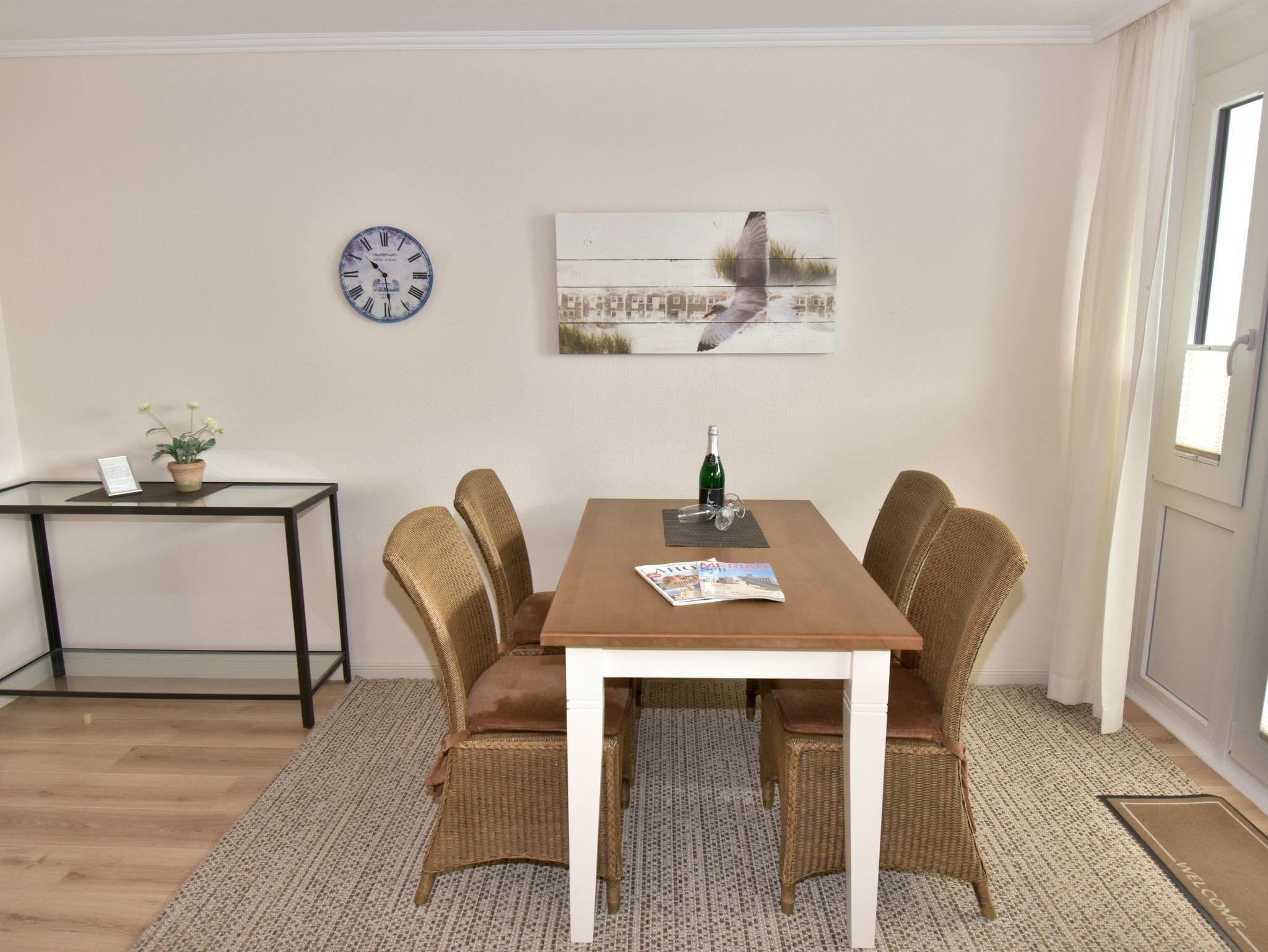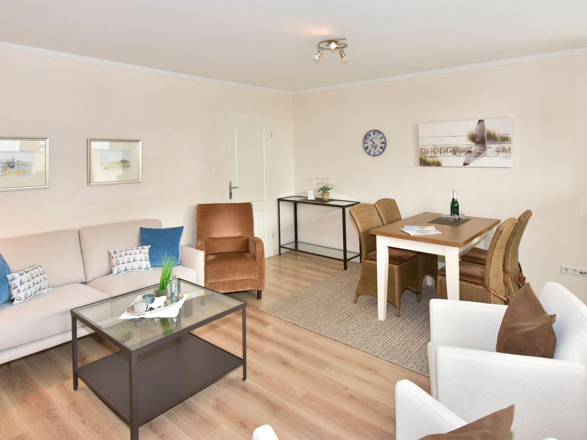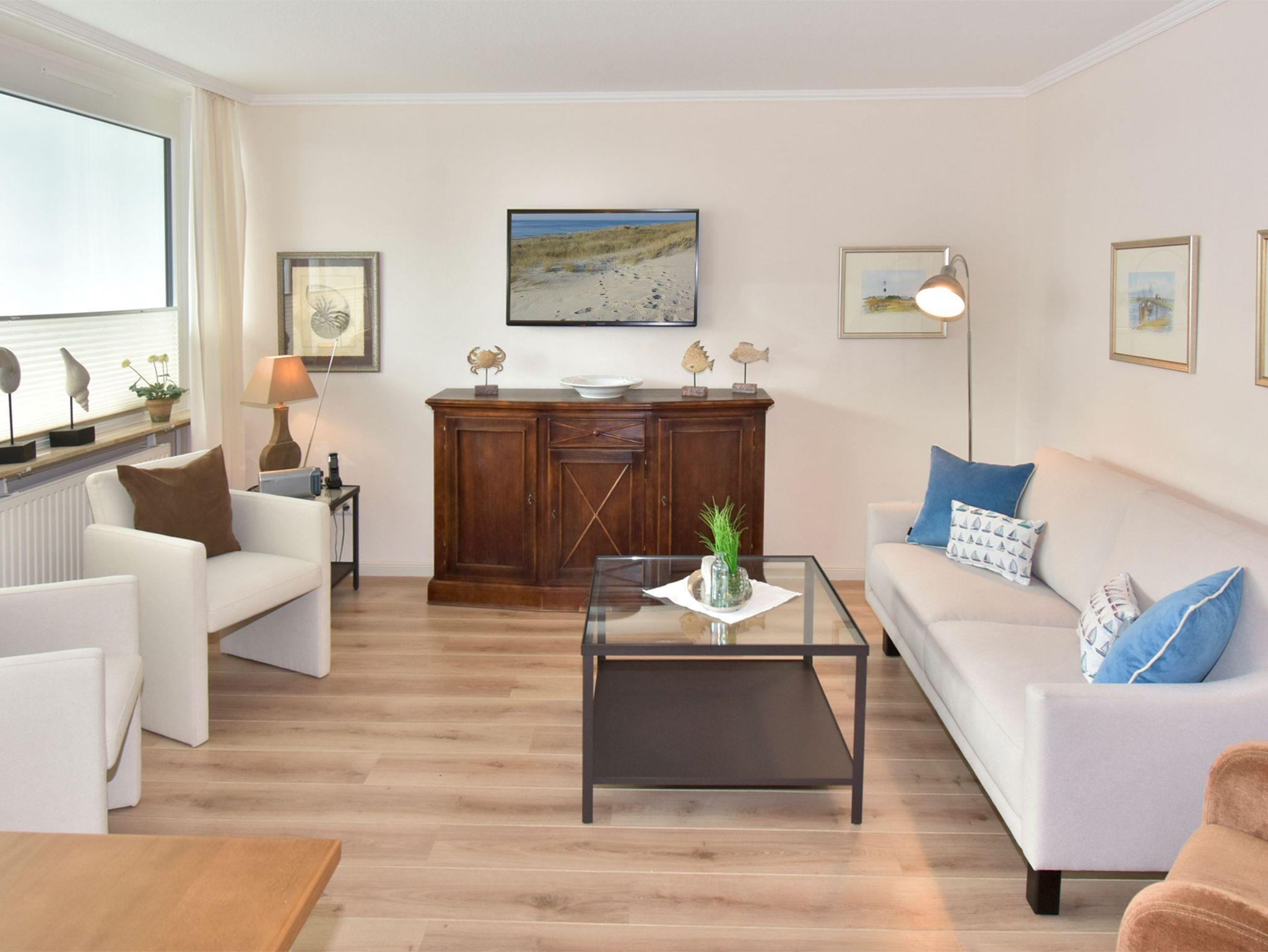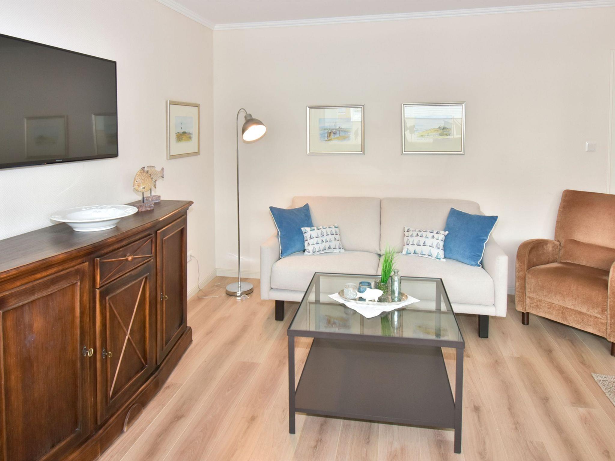 Der Wohnraum besteht aus einer bequemen Sitzgarnitur (Zweisitzer mit Sessel und Fußhocker), einem Essplatz, großer Flachbild-TV, DVD-Player, HiFi-Anlage und Telefon.