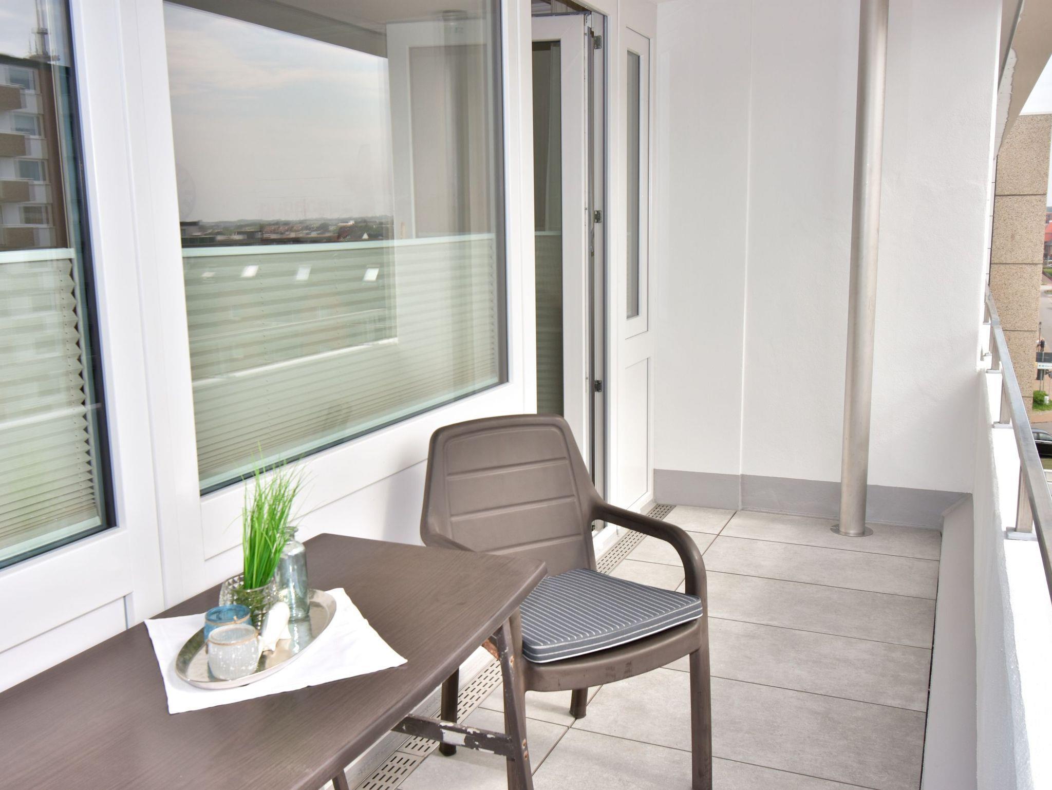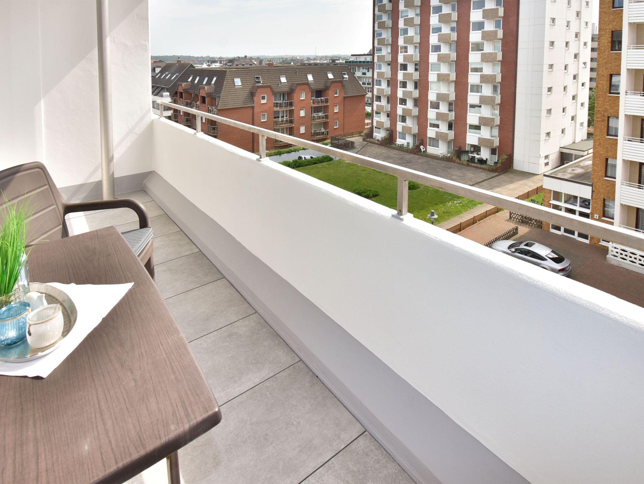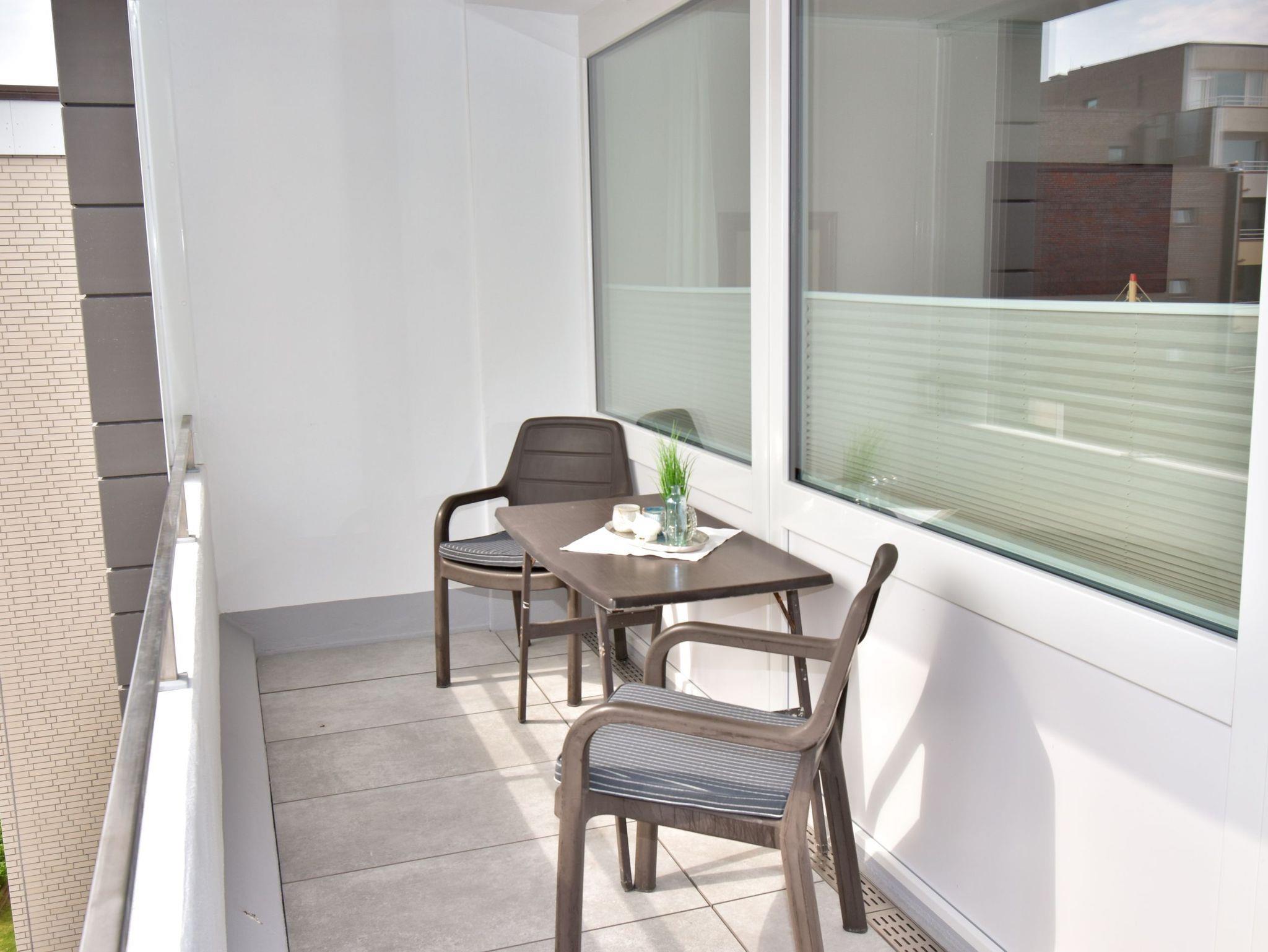Aufwändig und modern renovierte und komplett mit Laminat ausgelegte 3-Zimmer-Nichtraucher-Ferienwohnung (ca. 63 qm) in der 4. Etage zur Landseite mit Ostloggia (Morgensonne, mit Balkonmöbeln und Auflagen) für max. 4 Personen.