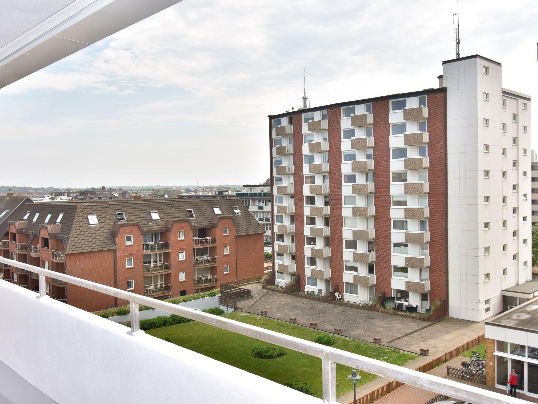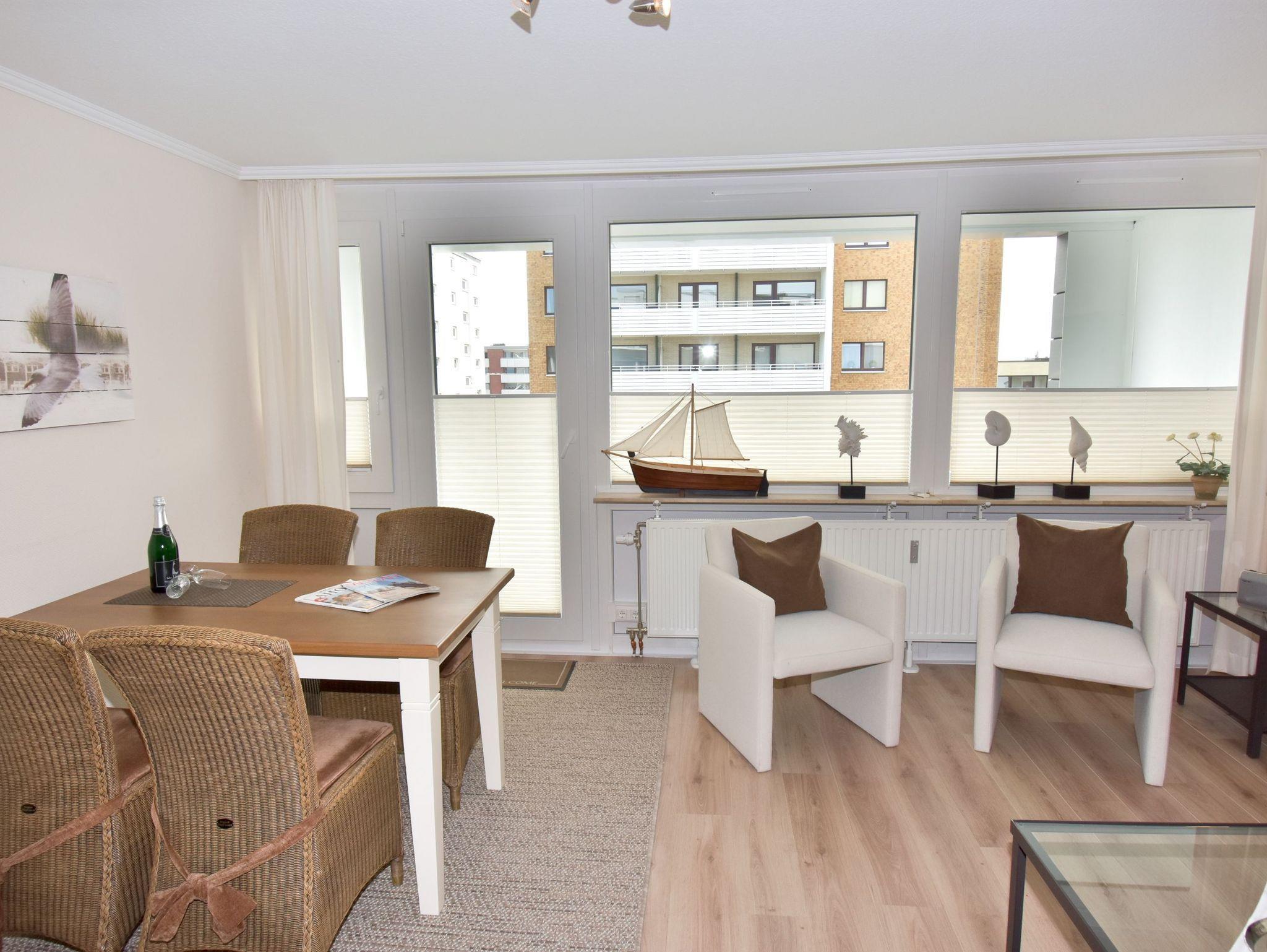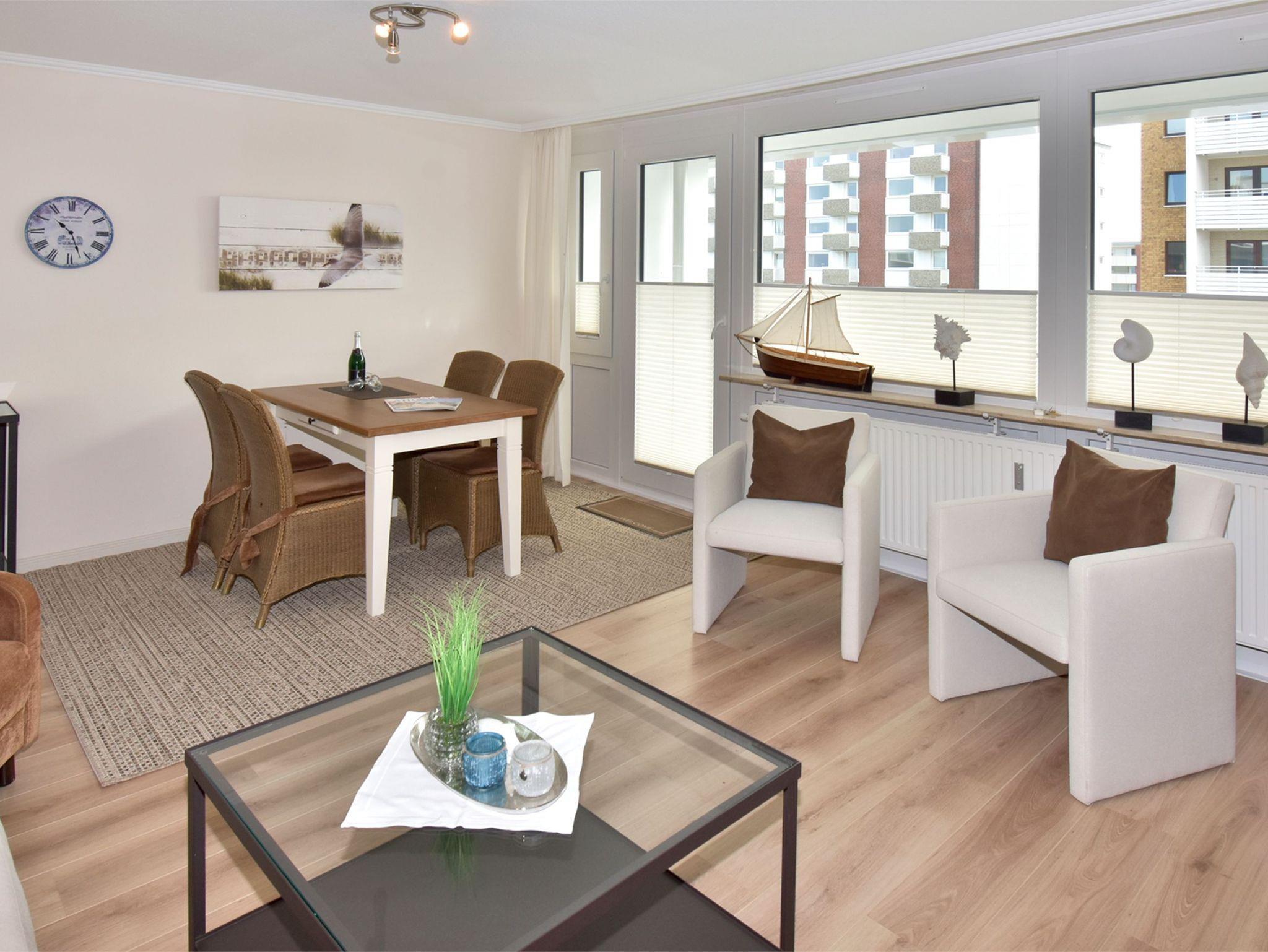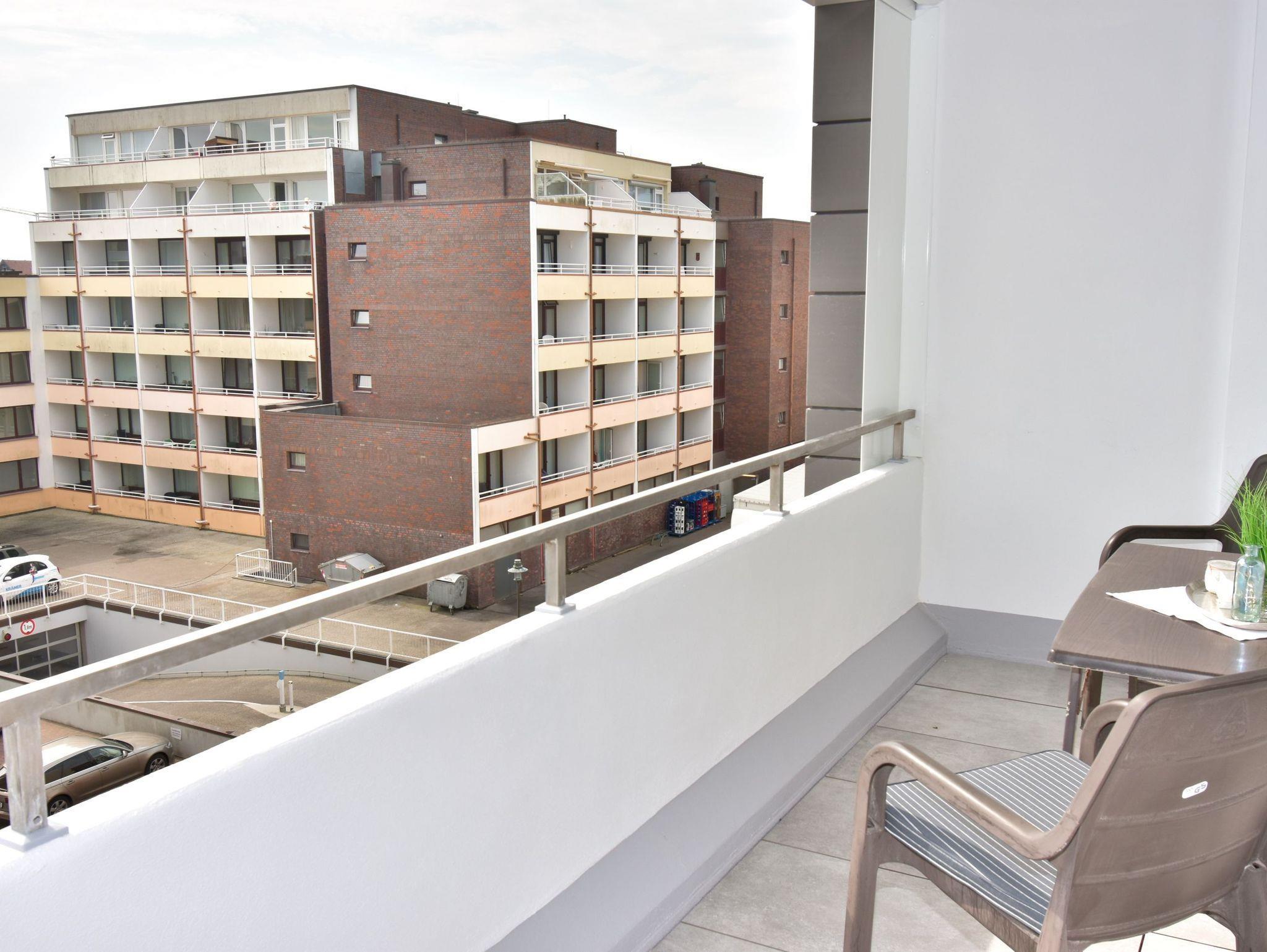 Aufwändig und modern renovierte und komplett mit Laminat ausgelegte 3-Zimmer-Nichtraucher-Ferienwohnung (ca. 63 qm) in der 4. Etage zur Landseite mit Ostloggia (Morgensonne, mit Balkonmöbeln und Auflagen) für max. 4 Personen.