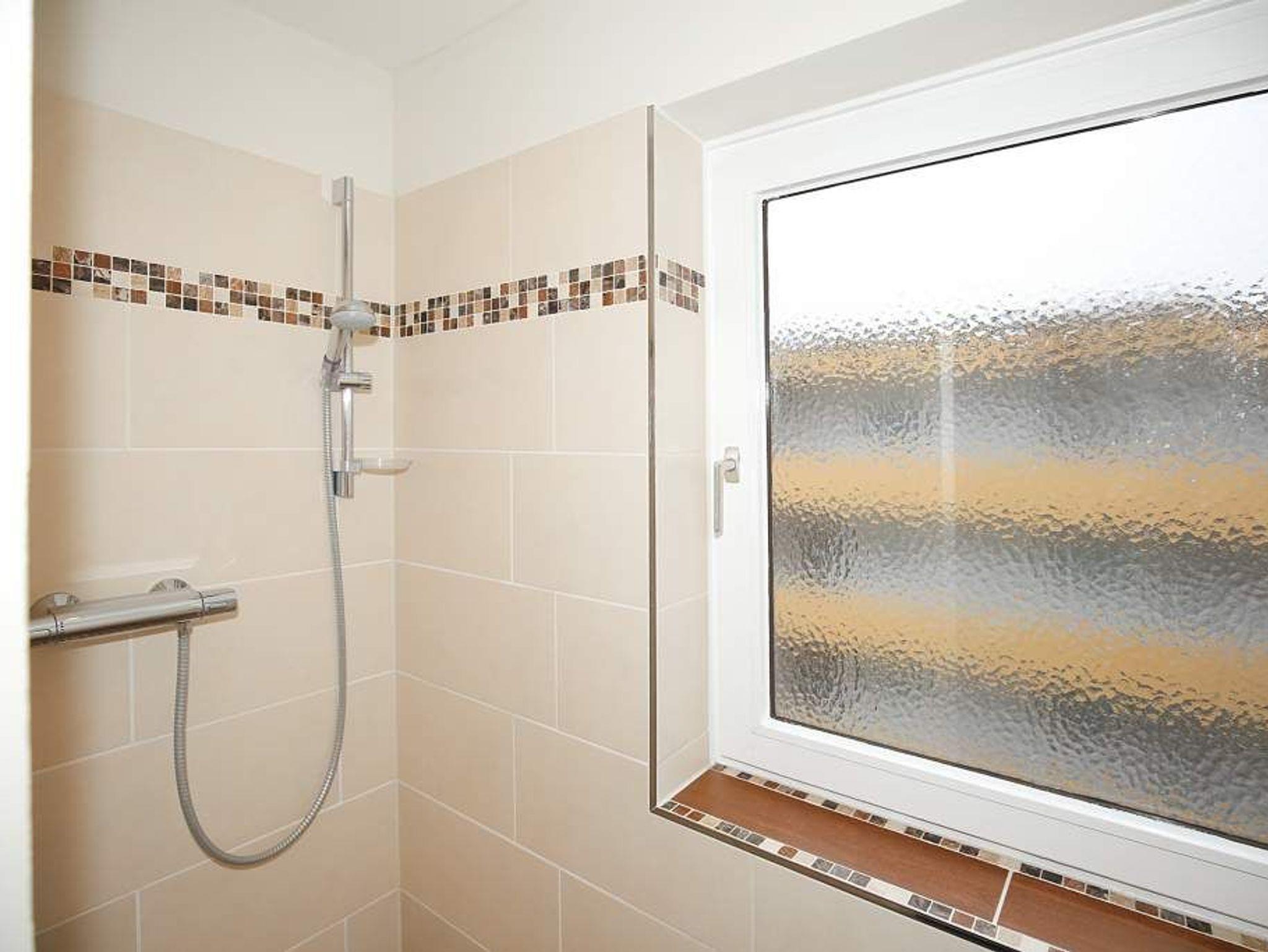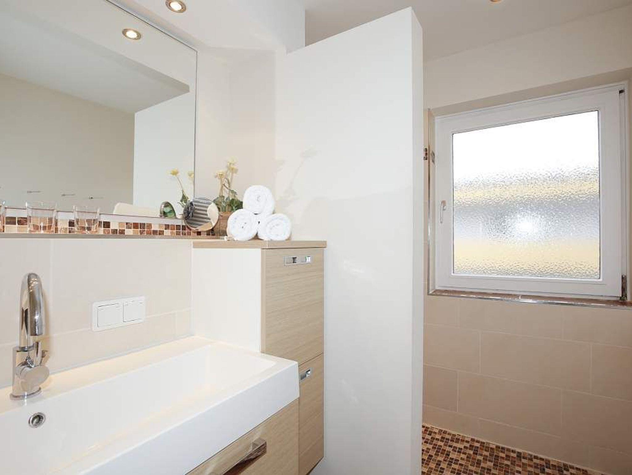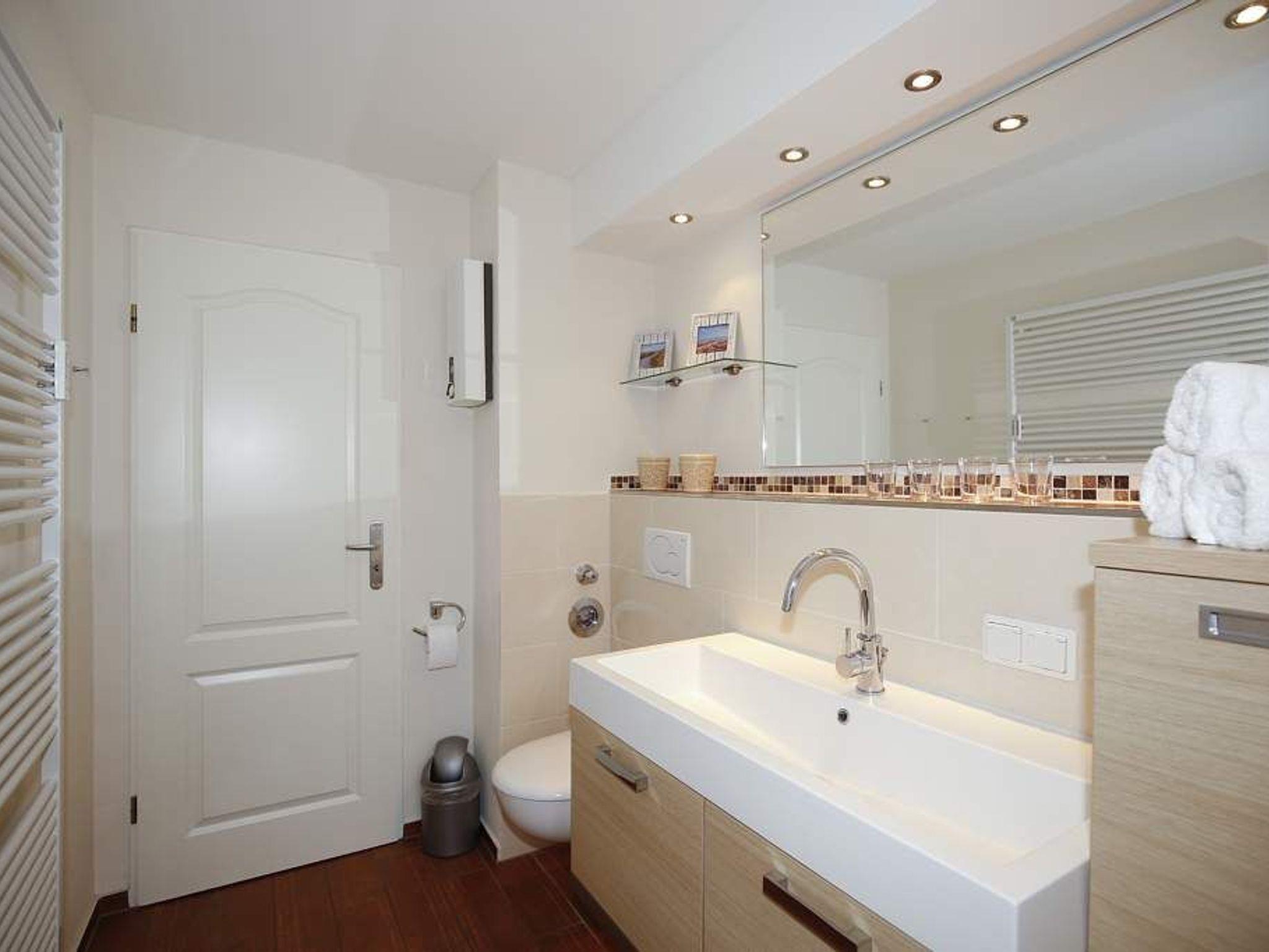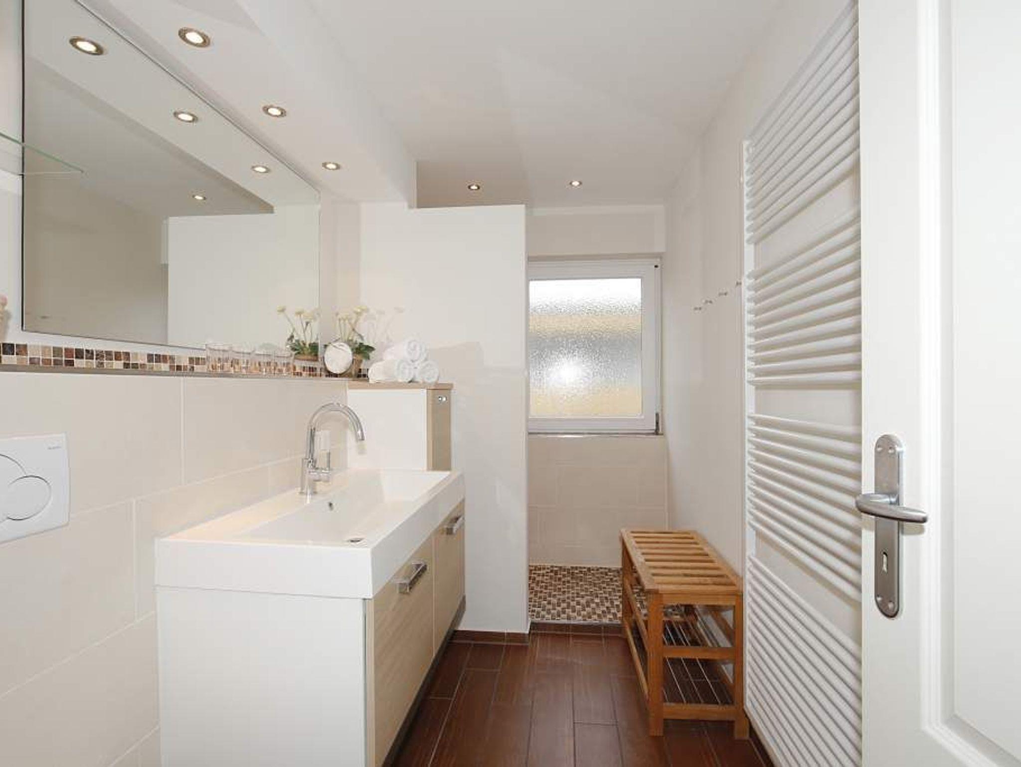 Im neuen großzügigen Bad befinden sich eine große, sehr flache Dusche, ein WC, ein Waschtisch, ein Handtuchtrockner und ein Fön.
