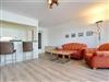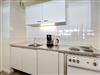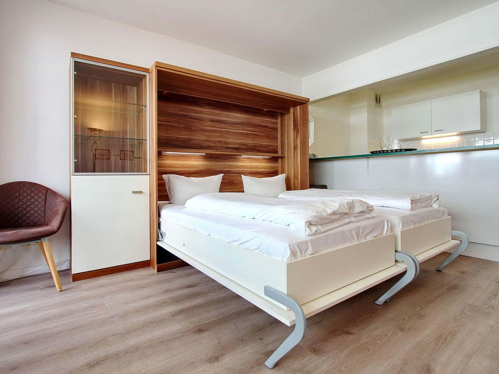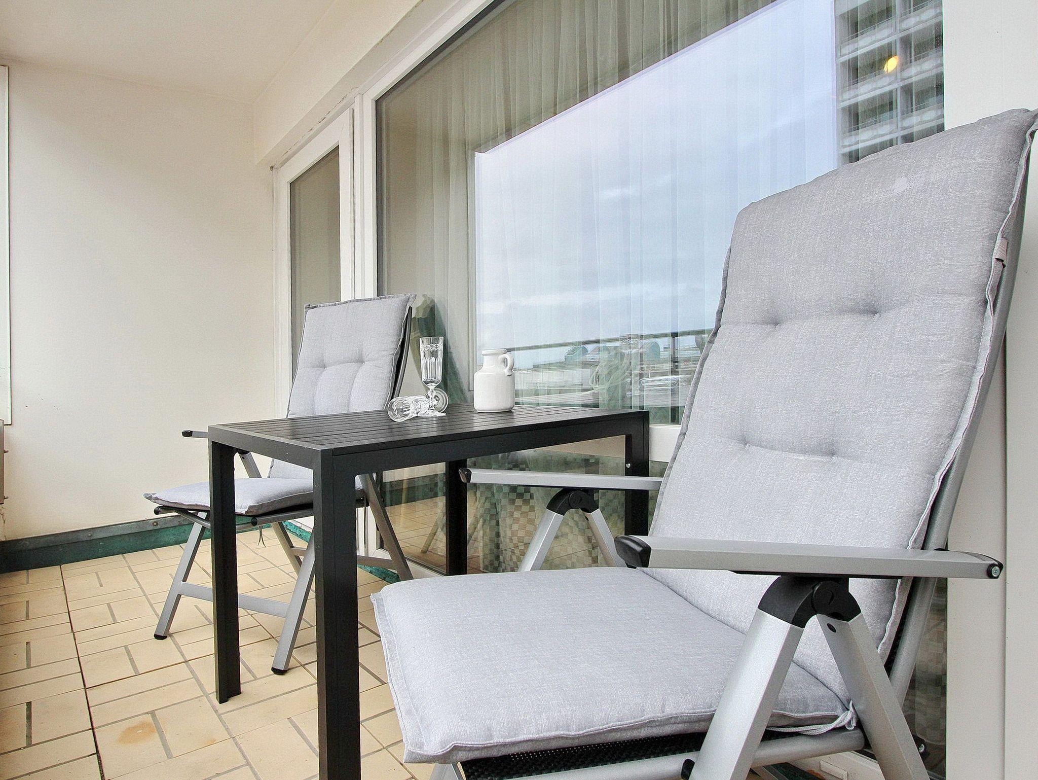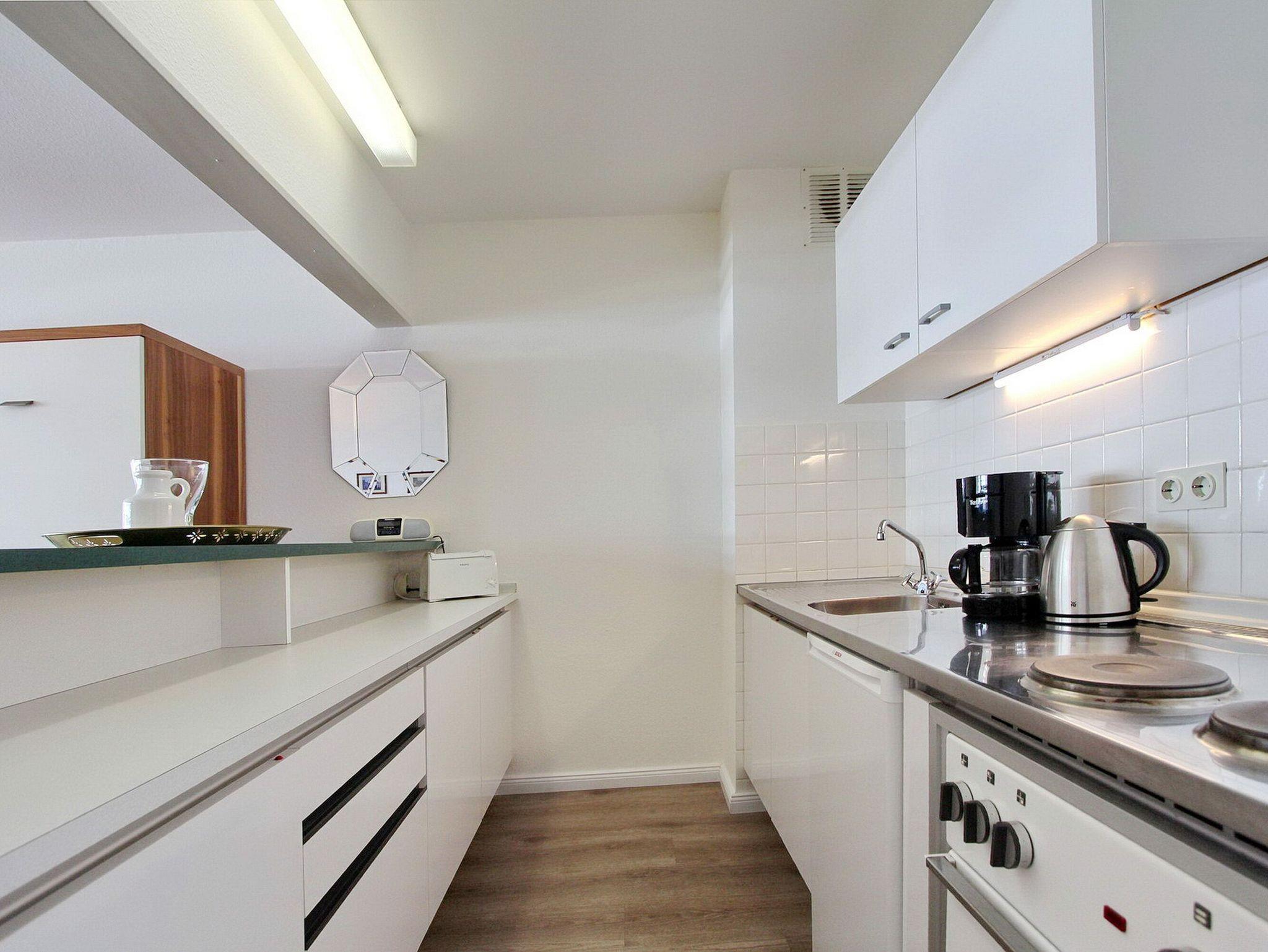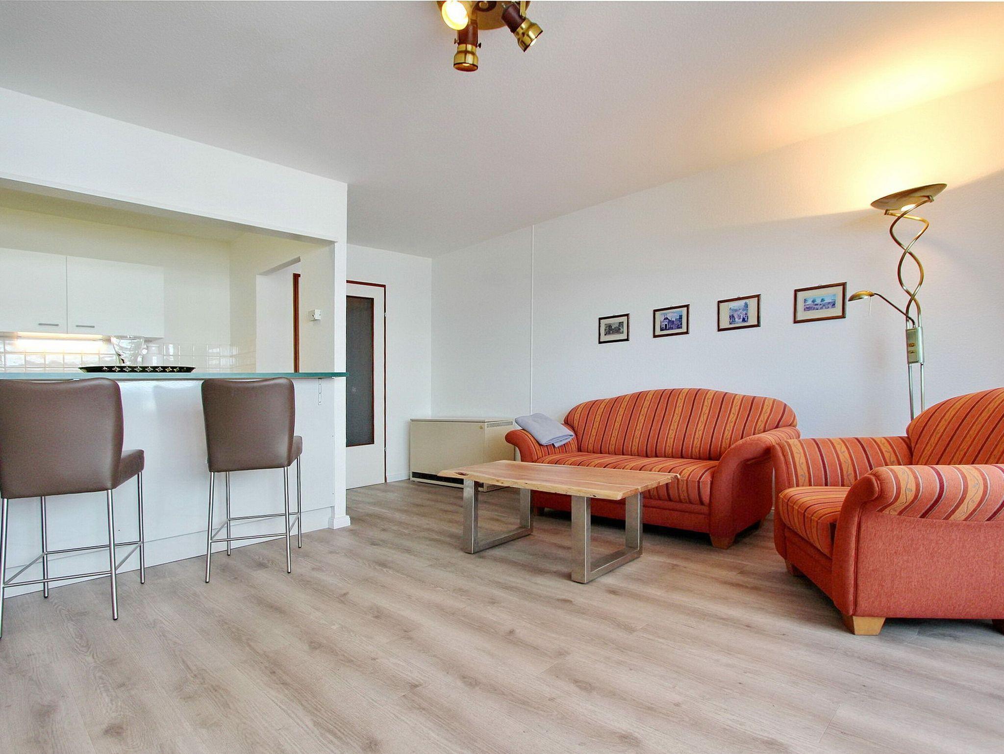 Das 1-Zimmer-Appartement befindet sich in der 3. Etage des Hauses Westerhörn und ist nur wenige Schritte vom Strand und Meer entfernt. Der Wohn- und Schlafraum ist hell und verfügt über bodentiefe Fenster sowie einen vorgelagerten Westbalkon mit vorhandenen Balkonmöbeln. Die Einrichtung umfasst Einzelschrankbetten, eine Sitzgruppe und zwei Stühle. Eine offene Küchenbar mit Backofen und Esstresen, an dem Lederbarhocker stehen, ermöglicht das Einnehmen von Mahlzeiten. Der Fußboden wurde in Holzdielenoptik gestaltet, was eine hygienische Reinigung gewährleistet. Im Badezimmer befinden sich eine Badewanne mit Duschvorhang sowie ein Fenster zur direkten Belüftung. Zur technischen Ausstattung gehören ein moderner Flachbildfernseher von Panasonic und ein Radio. Die Größe des Appartements beträgt ca. 35 m².