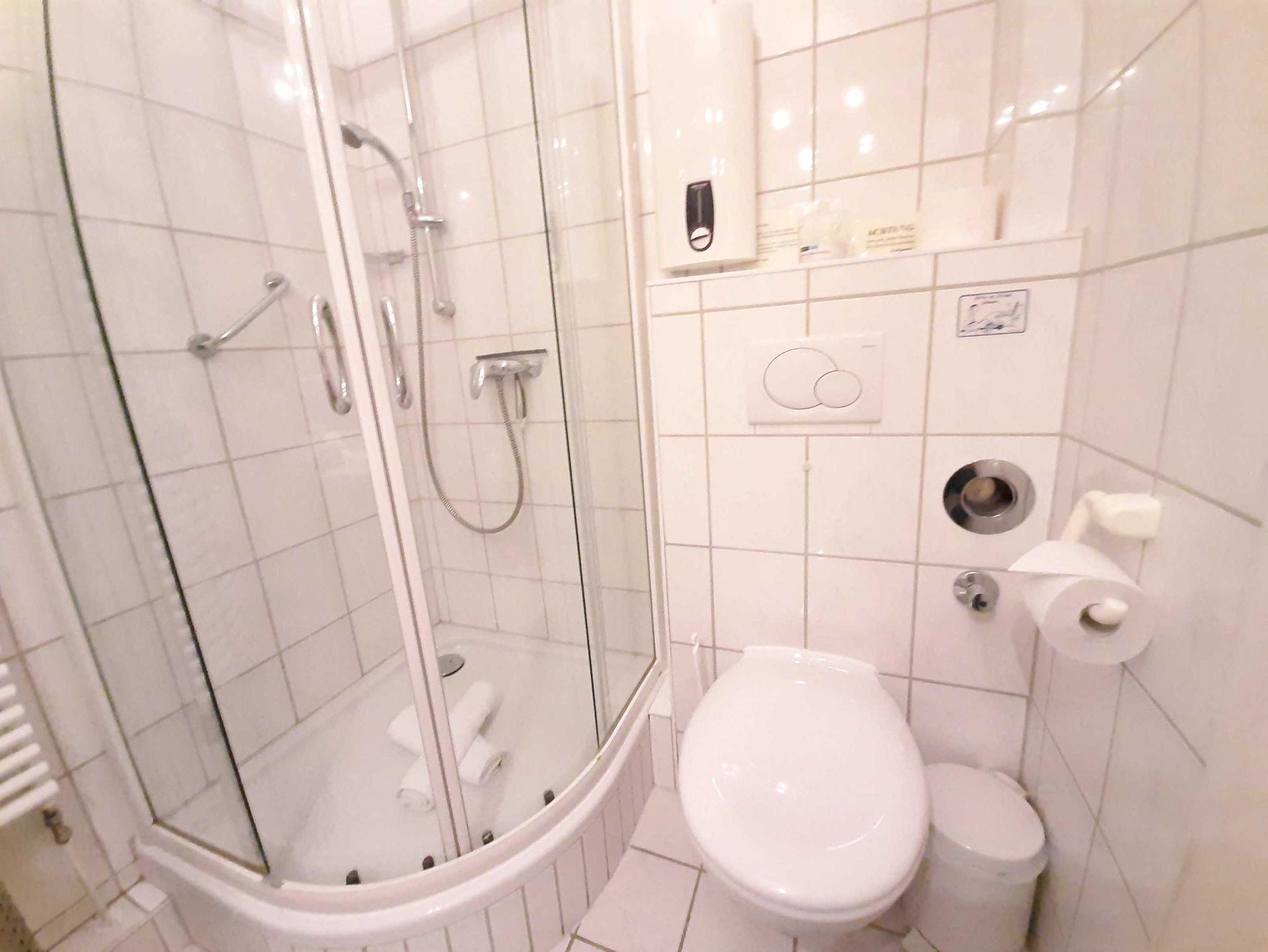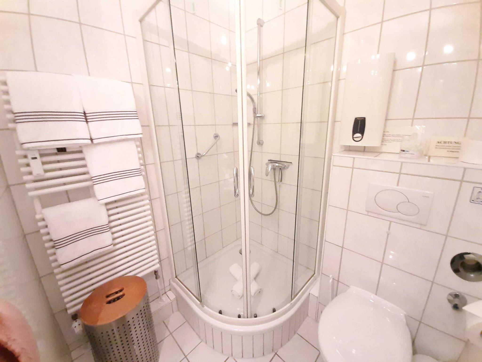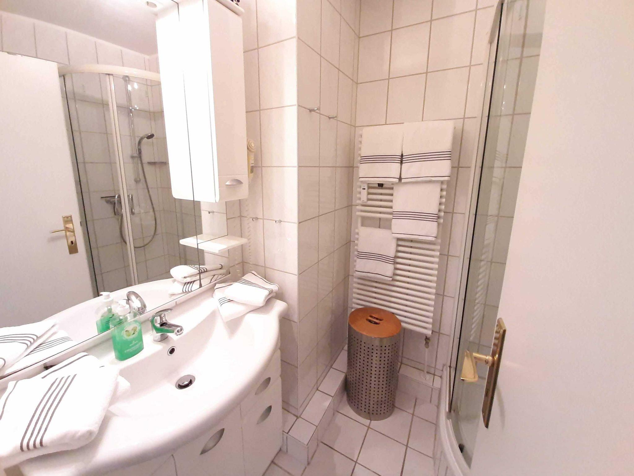 Ein Bad mit Dusche, Waschtisch, Handtuchtrockner, WC und Haartrockner.