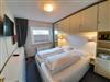 Schlafzimmer mit Doppelbett mit offenem Fußende, Nachttisch mit Leselampen, Flachbild TV und Kleiderschrank.