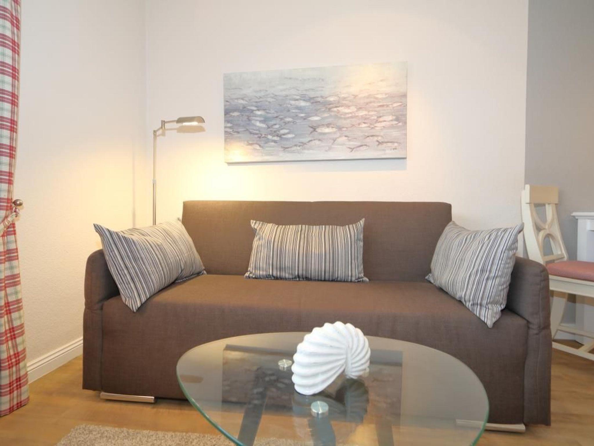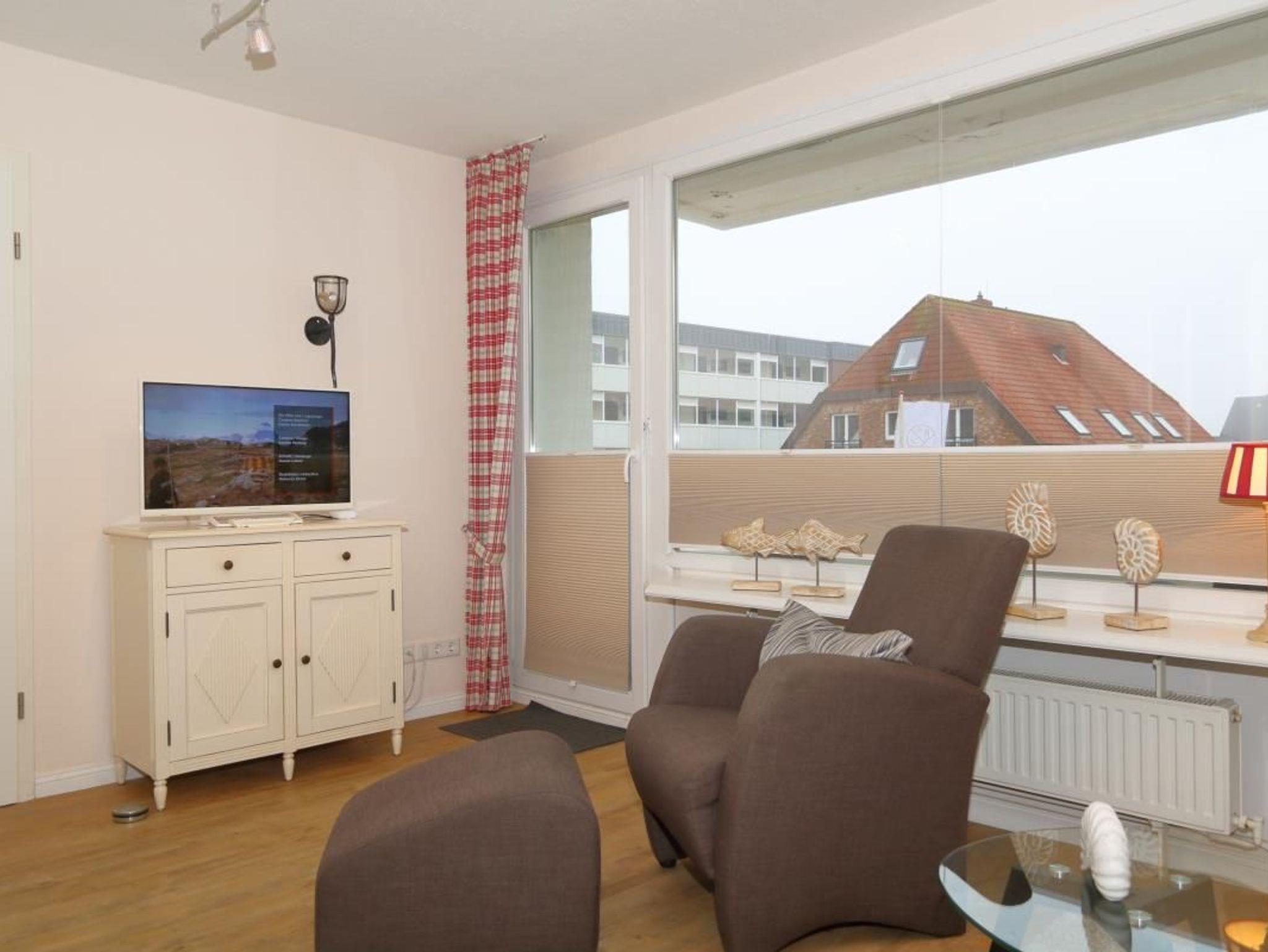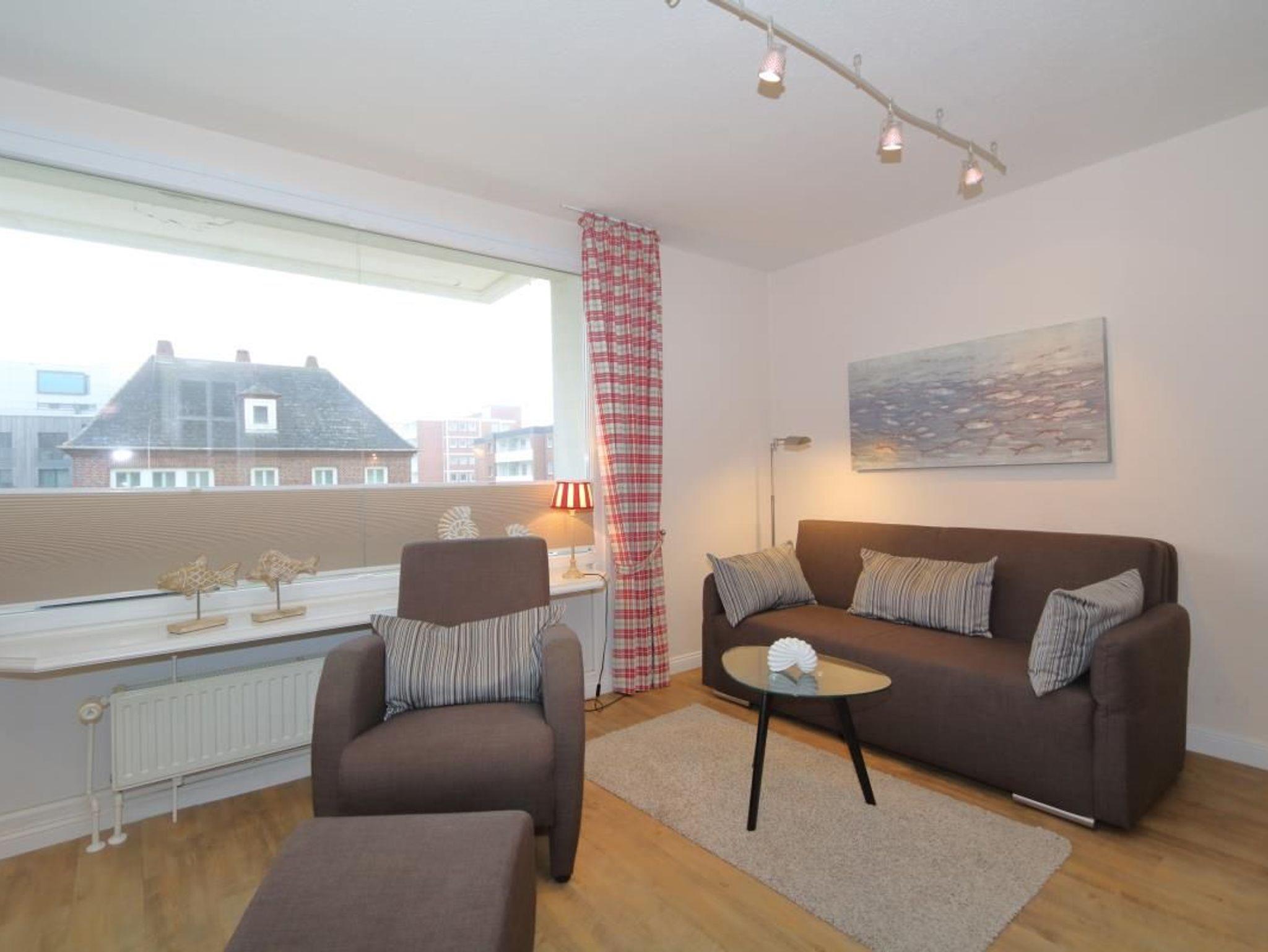 Das 2-Zimmer Appartement ``Ankerplatz`` im Haus Sola Bona befindet sich in der 1. Etage in zentraler Lage an der Friedrichstraße in Westerland. Zum Strand und den Fußgängerzonen sind es nur wenige Meter. Die Wohnung ist für 2 Personen auf rund 40qm Wohnfläche. Das Wohnzimmer hat eine bequemen Couch, einen Sessel und eine Essecke.