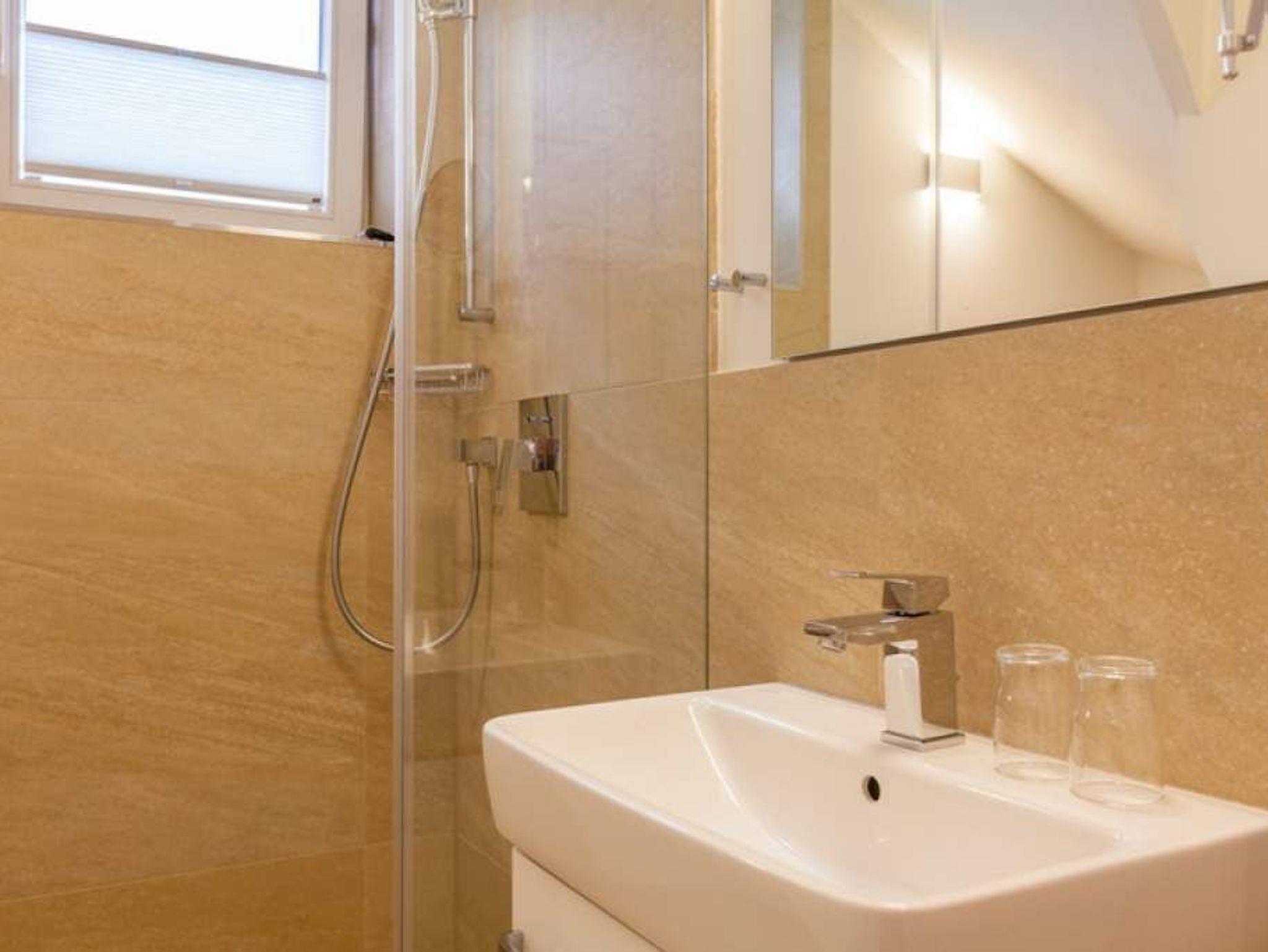 Das neue Bad lässt mit moderner Regendusche, Fön, Kosmetikspiegel, Waschtisch, Handtuchwärmer und WC keine Wünsche offen.