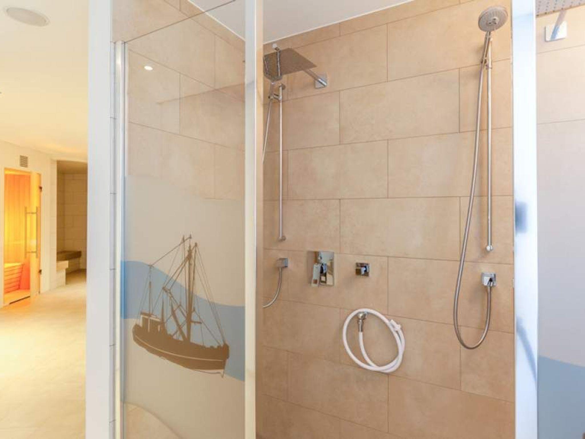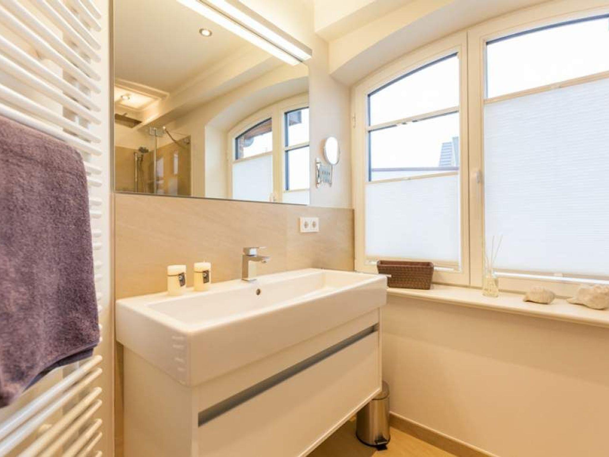 Das zweite Bad hat eine moderne Regendusche, Fön, Kosmetikspiegel,[nbsp][nbsp]Waschtisch, Handtuchwärmer und ein WC.