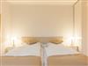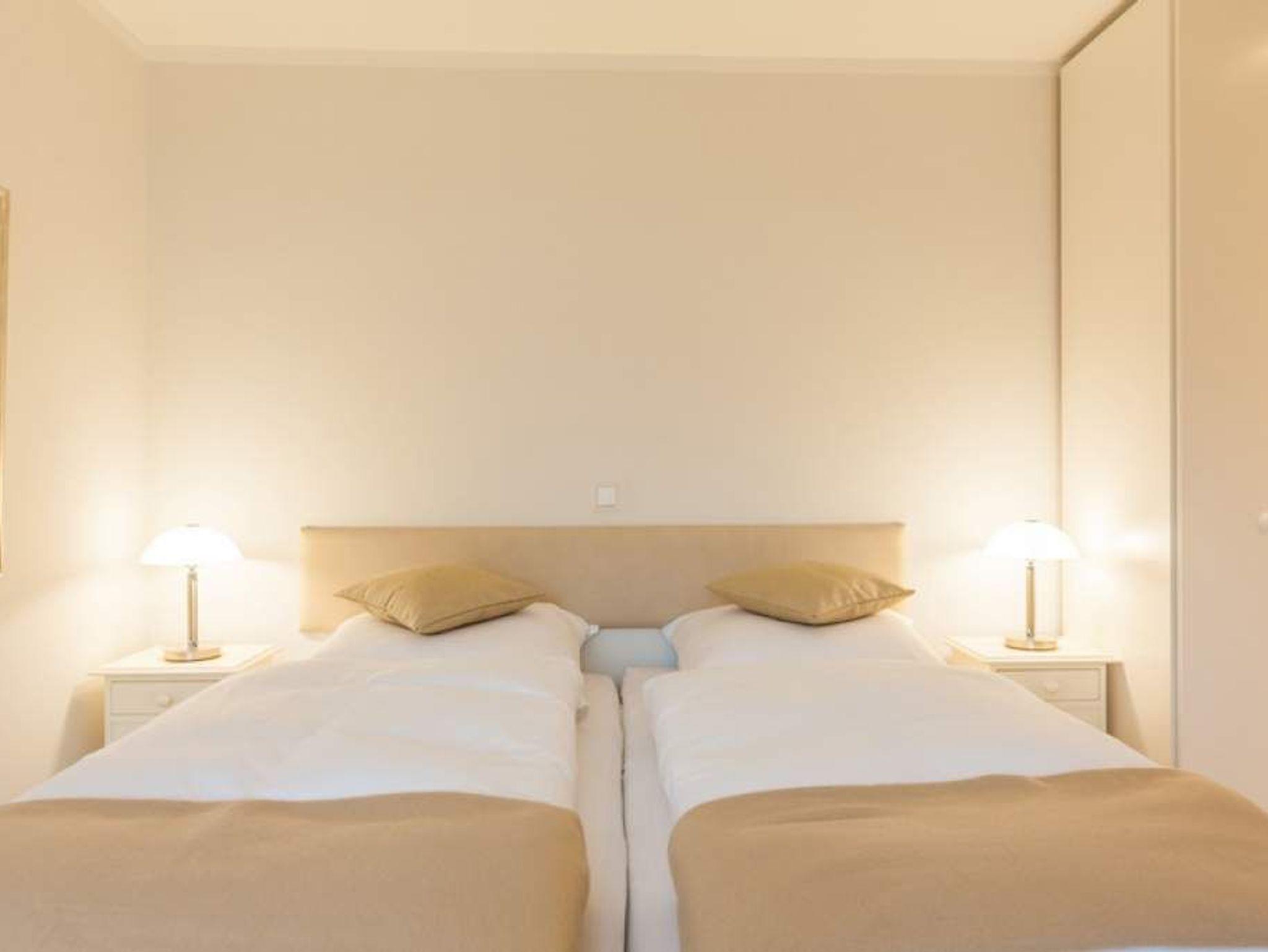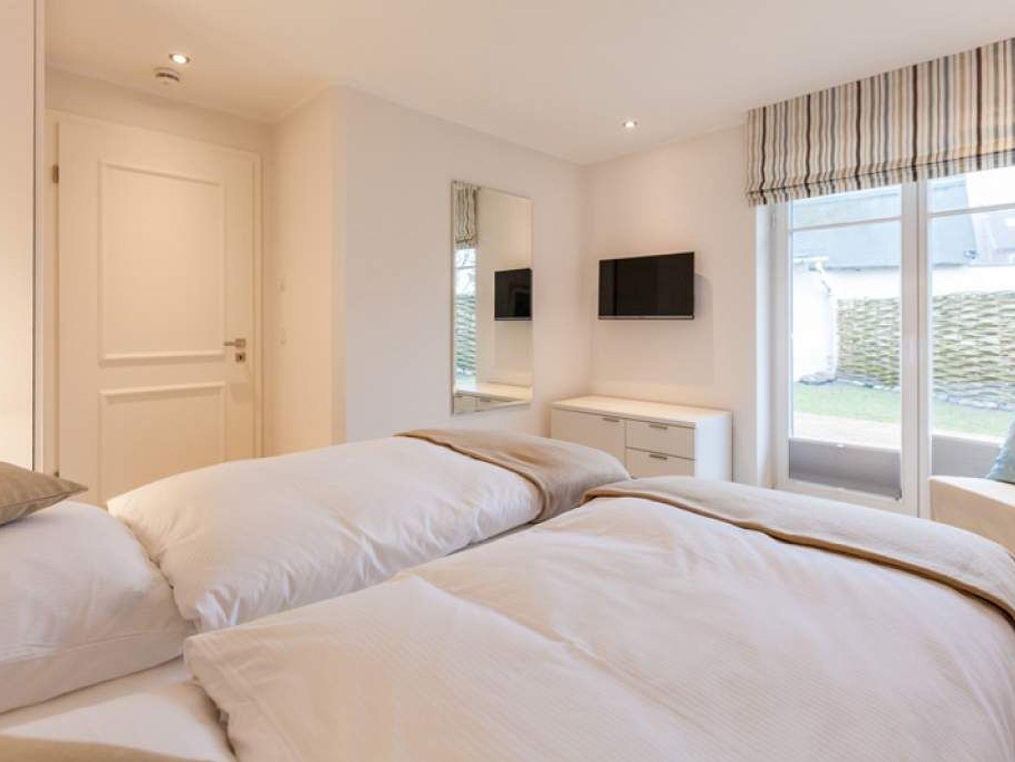 Im Erdgeschoss befindet sich außerdem das barrierefrei begehbare Doppel-Schlafzimmer mit Boxspringbett (Einzelmatratzen 0,90 x 2,00 m) in optimaler Liegehöhe (Kinderzustellbett mögl.), mit weiterem Flachbild-TV und Zugang zur zweiten nach Südosten ausgerichteter Terrasse mit kleinem Garten.