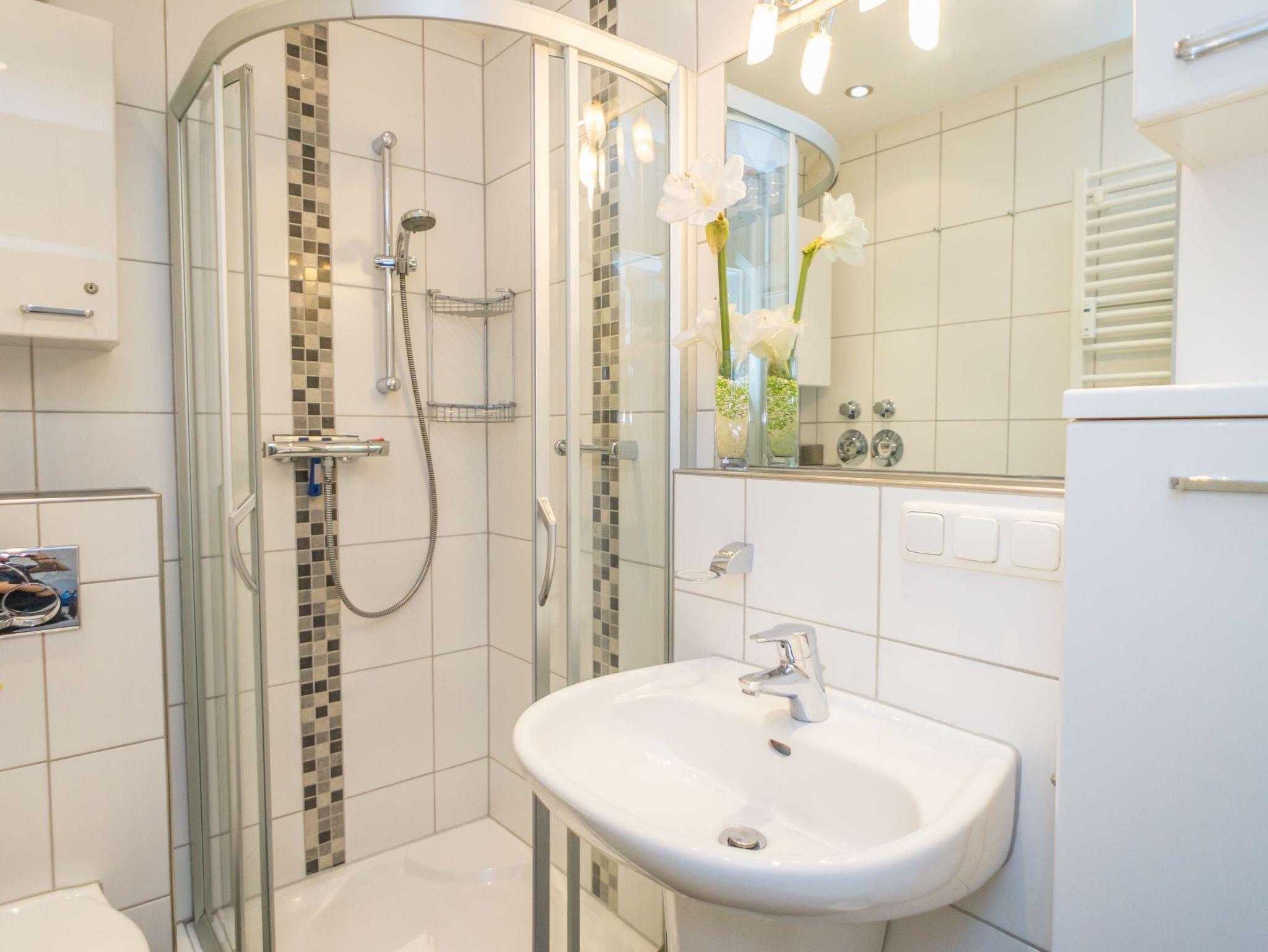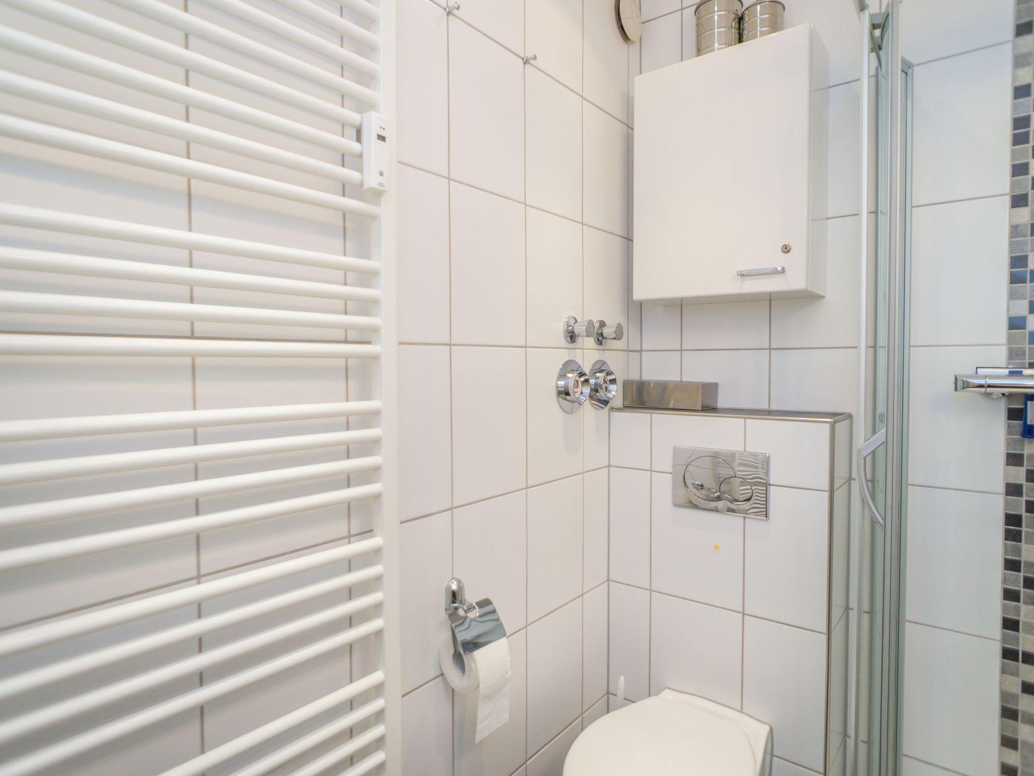 Das neue Duschbad/WC hat einen Waschtisch, Handtuchtrockner und Fön.