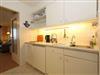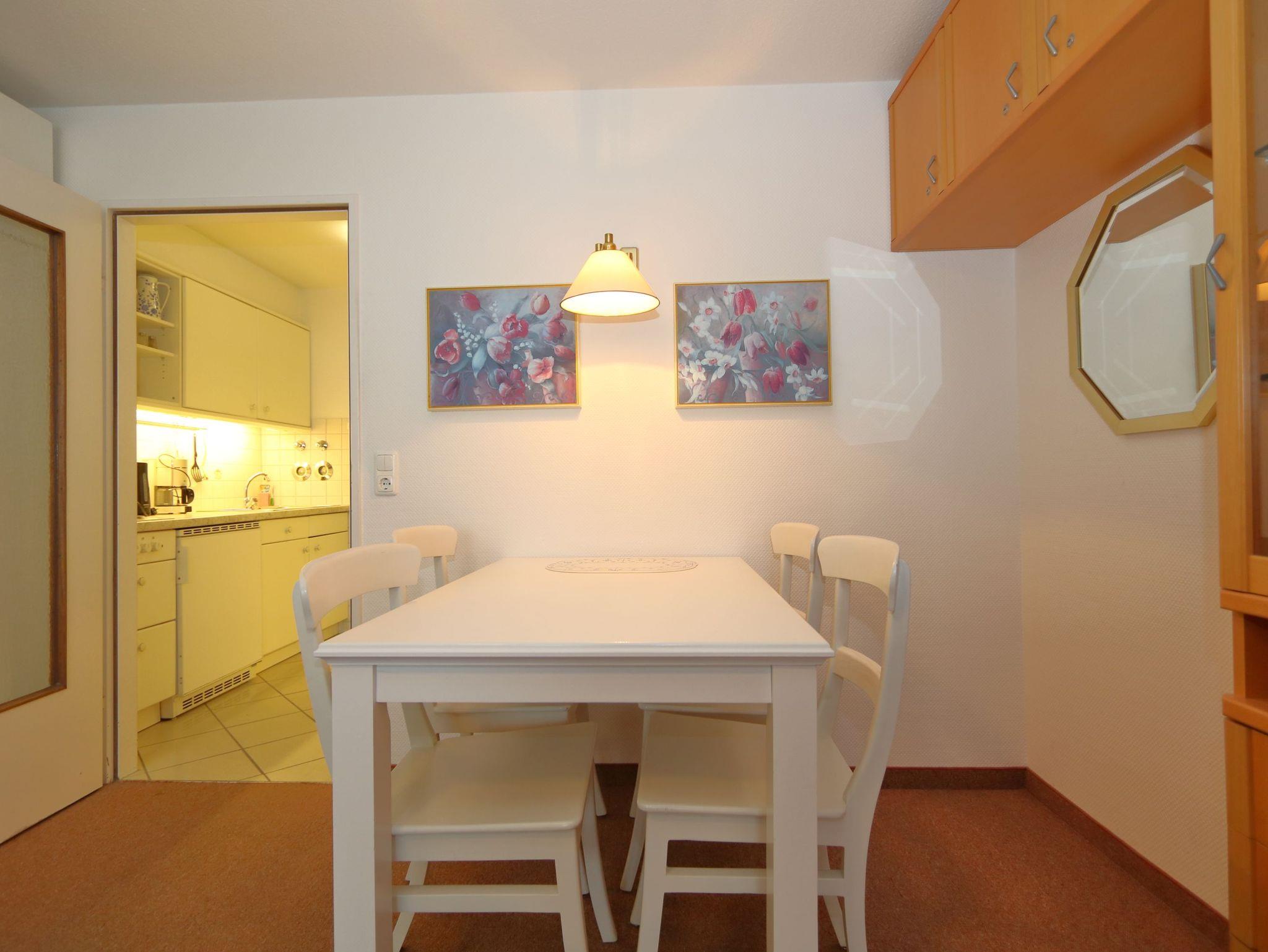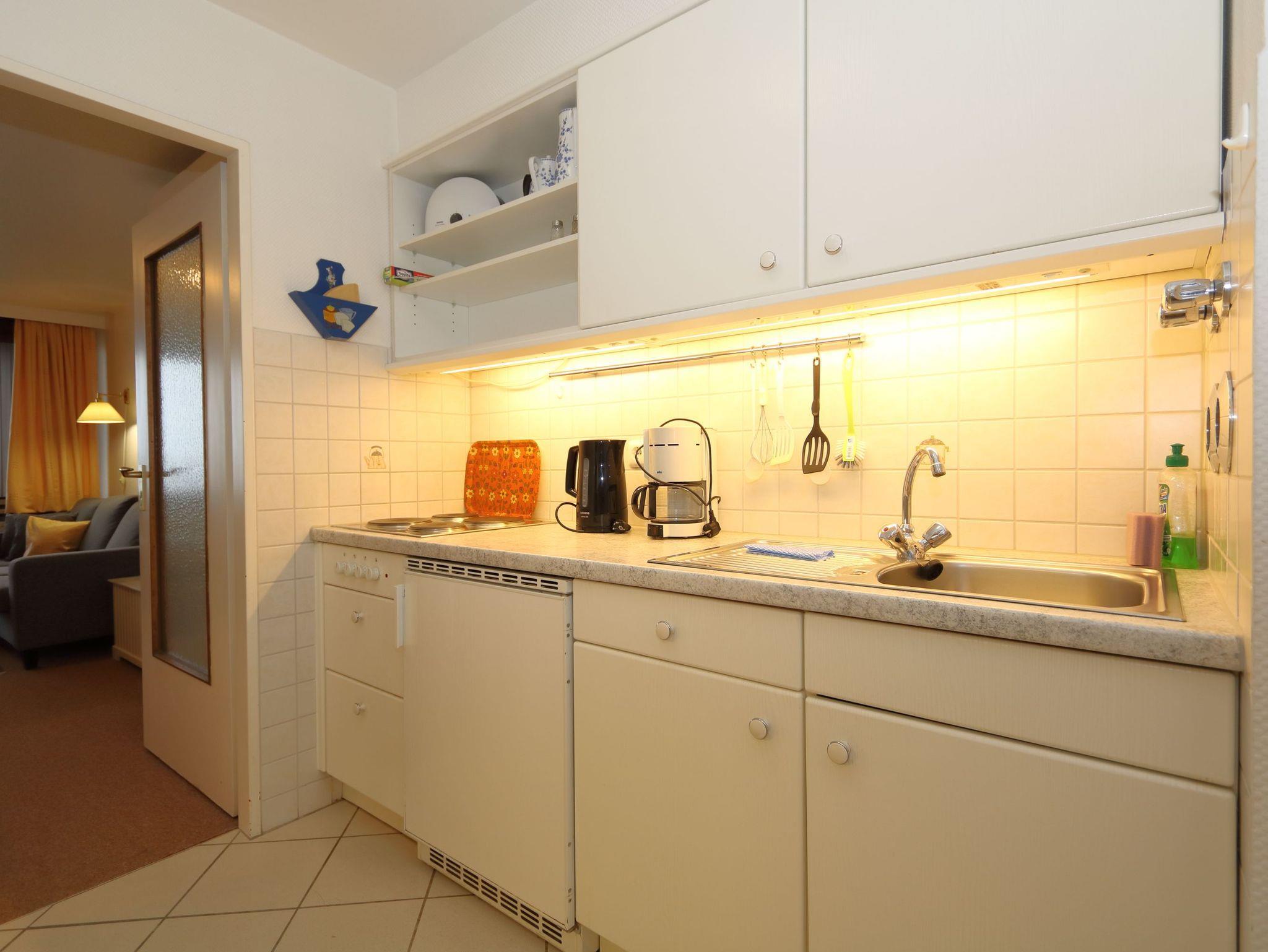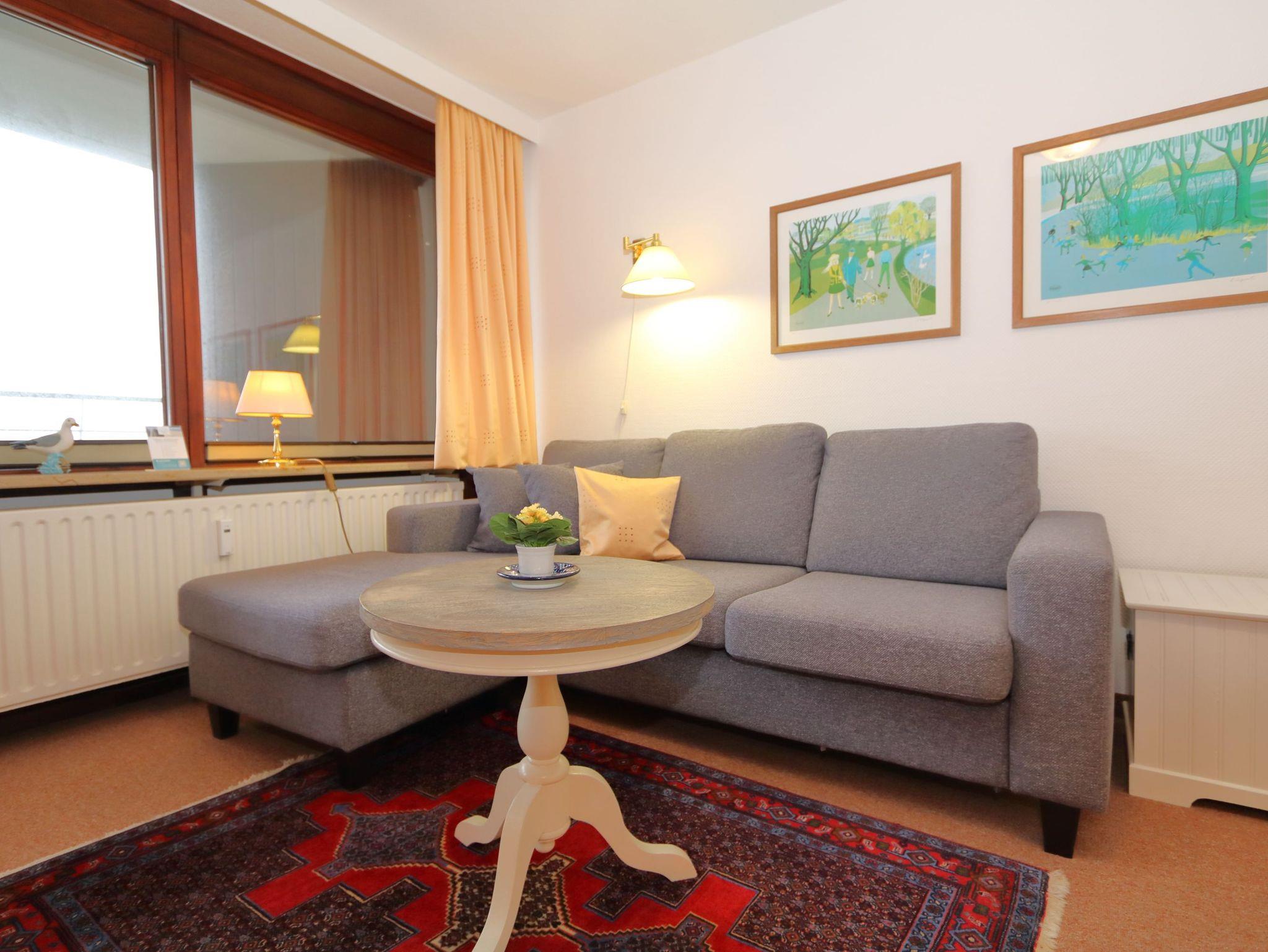 Im Wohnzimmer stehen eine Eckcouch und der Essplatz. In einer Schrankwand aus Buche sind zwei nebeneinander stehende einzeln aufklappbare Schrankbetten untergebracht. Vom Balkon hat man einen freien Blick auf das Meer. Die Küche befindet sich im Flur des Appartements. Das Bad ist mit einer Dusche versehen.