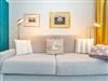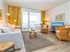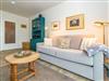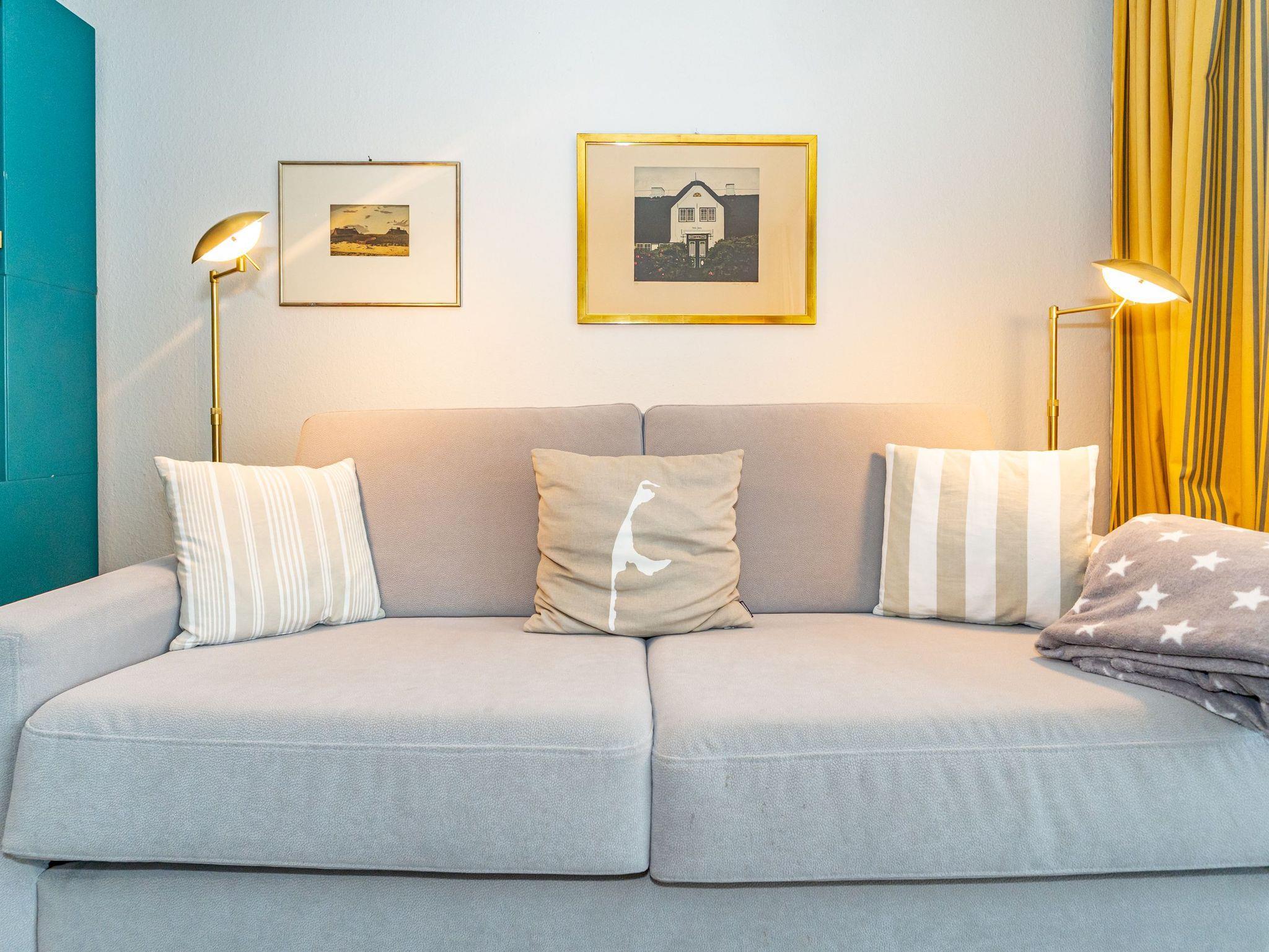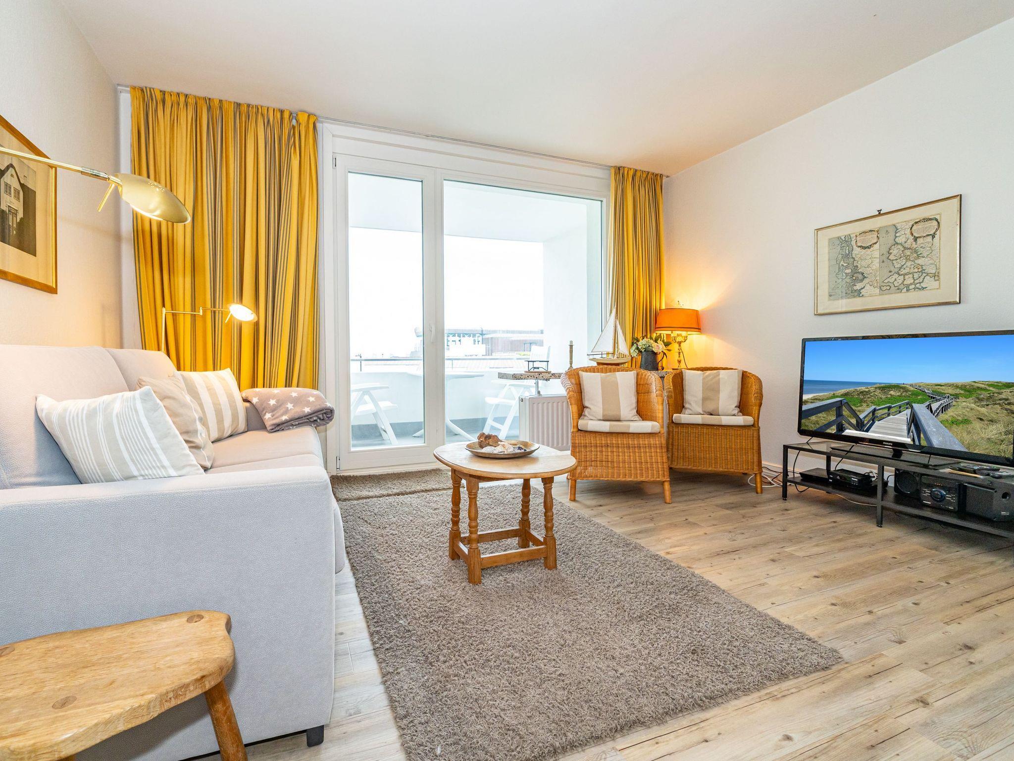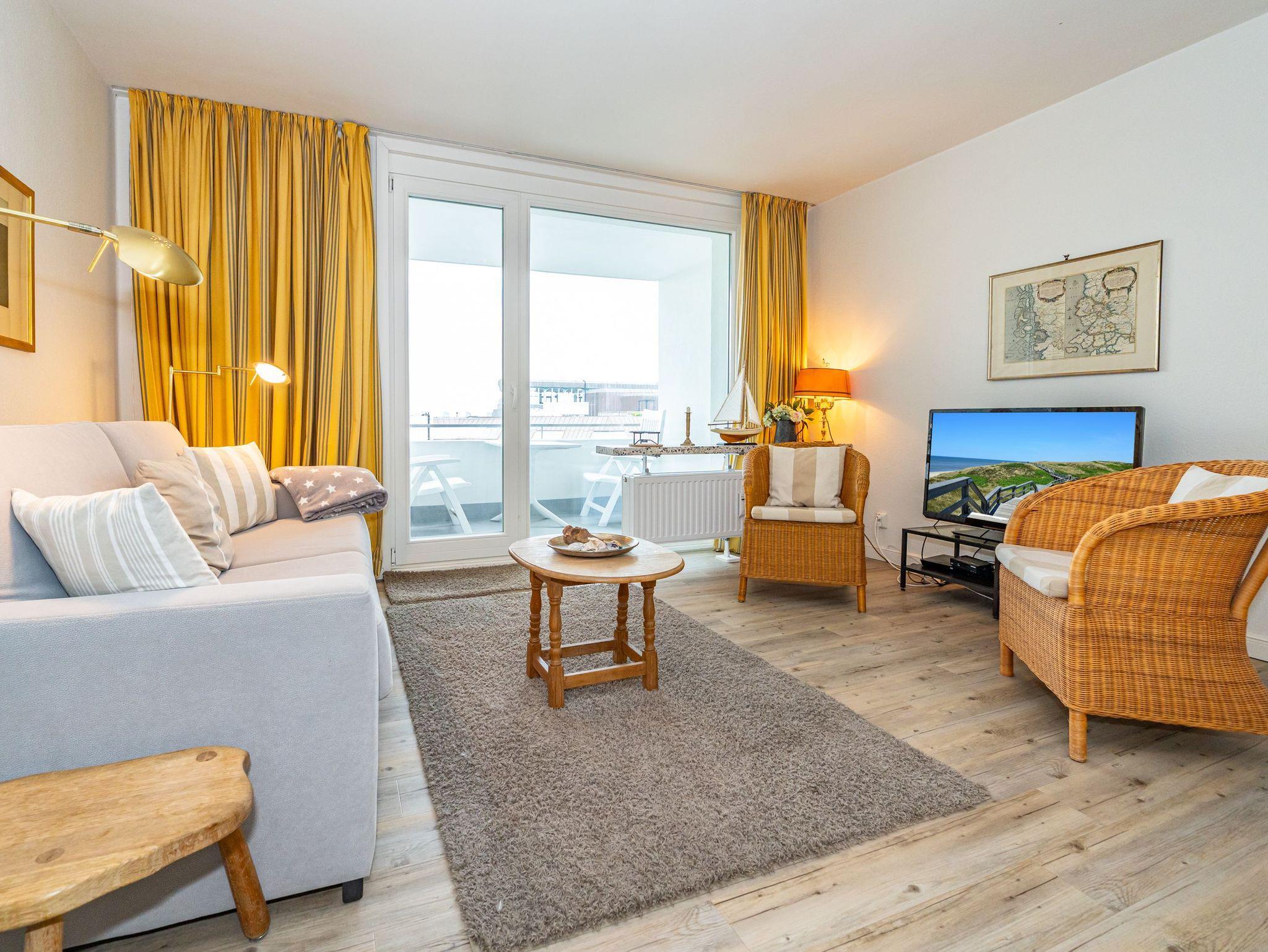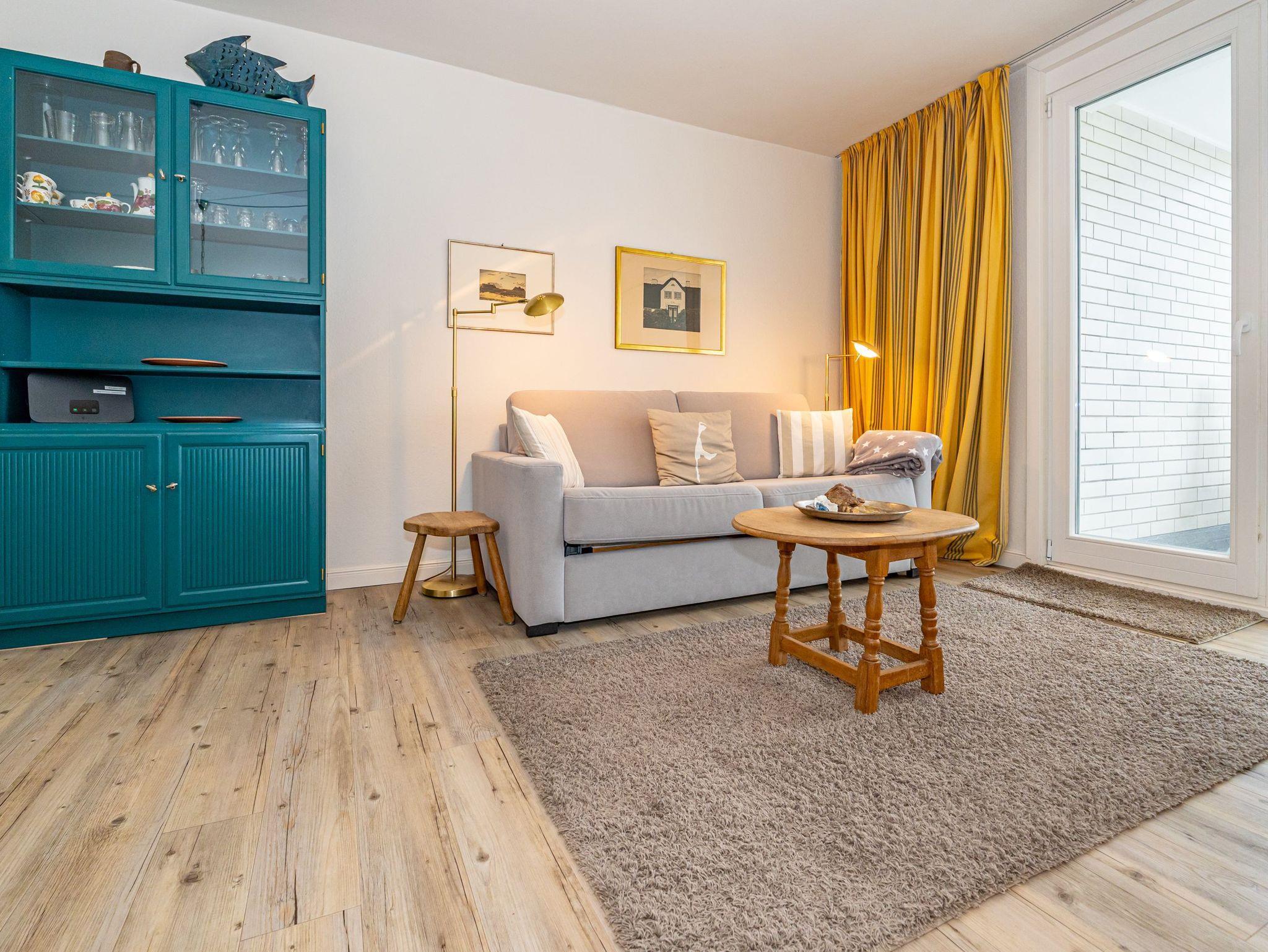 Der Wohnraum hat eine cremefarbene Doppelschlafcouch mit[nbsp][nbsp]integrierter, guter, durchgehender Matratze in optimaler Liegehöhe (Liegefläche ca. 1,80 x 1,98 m), zwei Korbsessel, einen Essplatz, einen Sat-Flachbild-TV, WLAN und eine offene Küchenzeile.