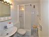 Im Bad befinden sich eine Dusche, ein WC, ein Waschtisch, ein Handtuchtrockner und ein Fön.
