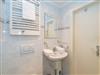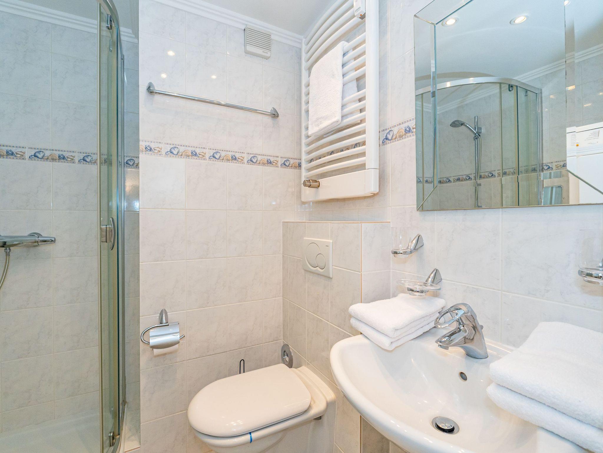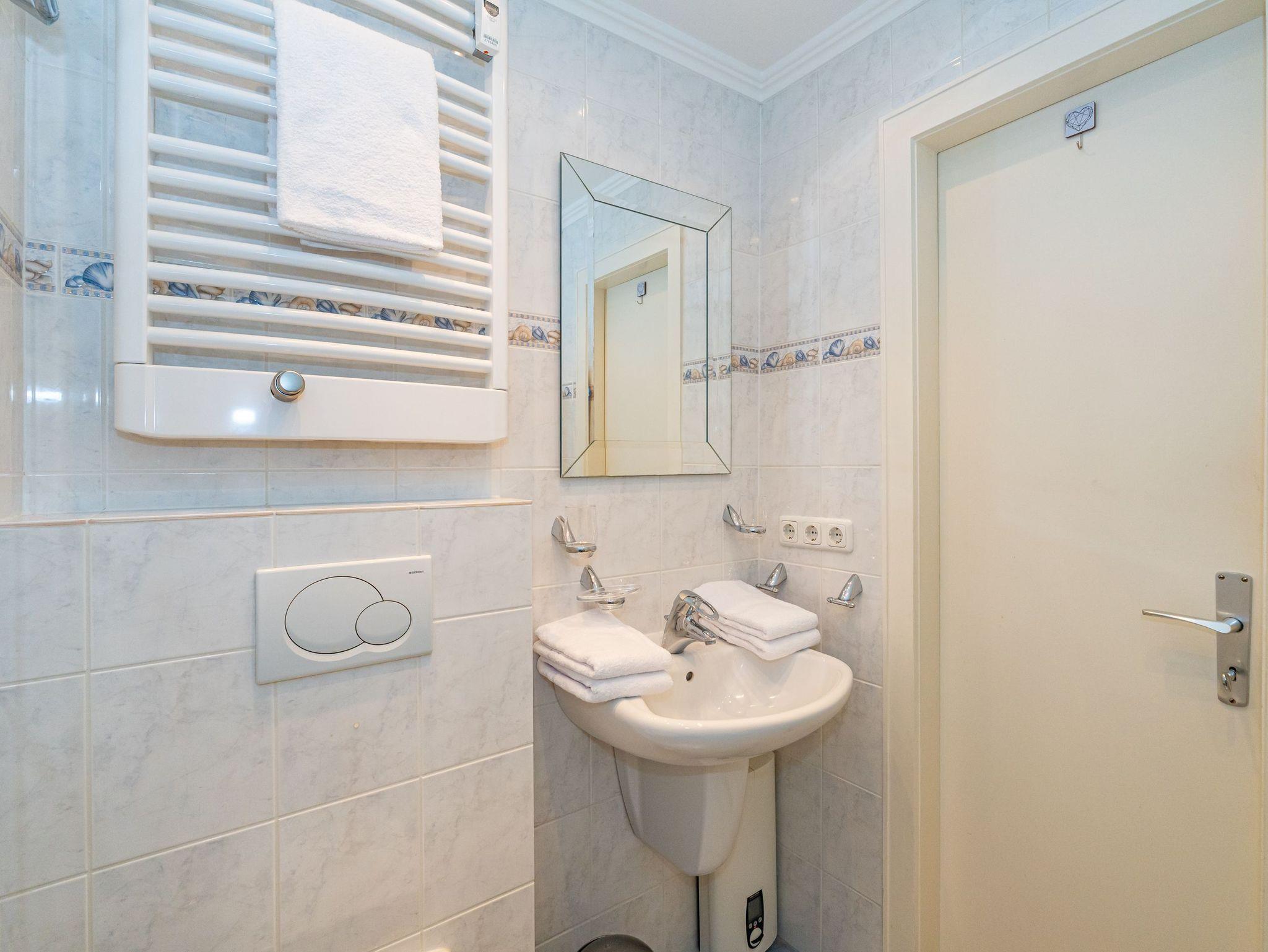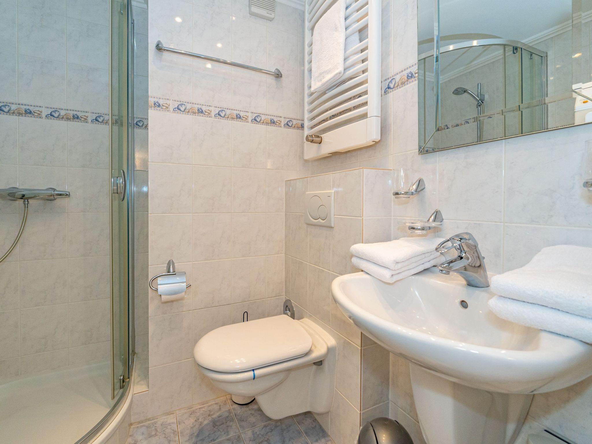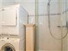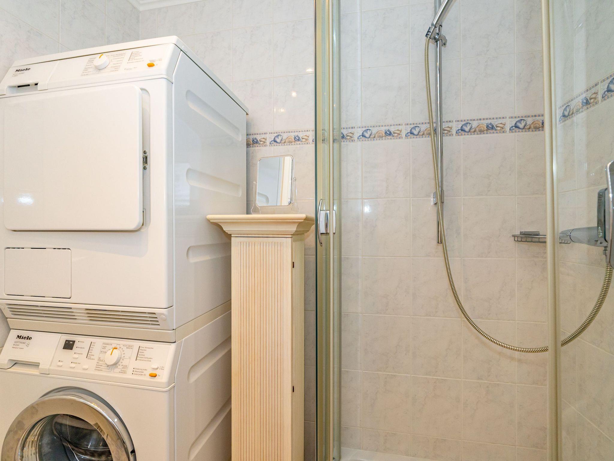 Im Bad befinden sich eine Dusche, ein WC, ein Waschtisch, ein Handtuchtrockner sowie Waschmaschine und Trockner.