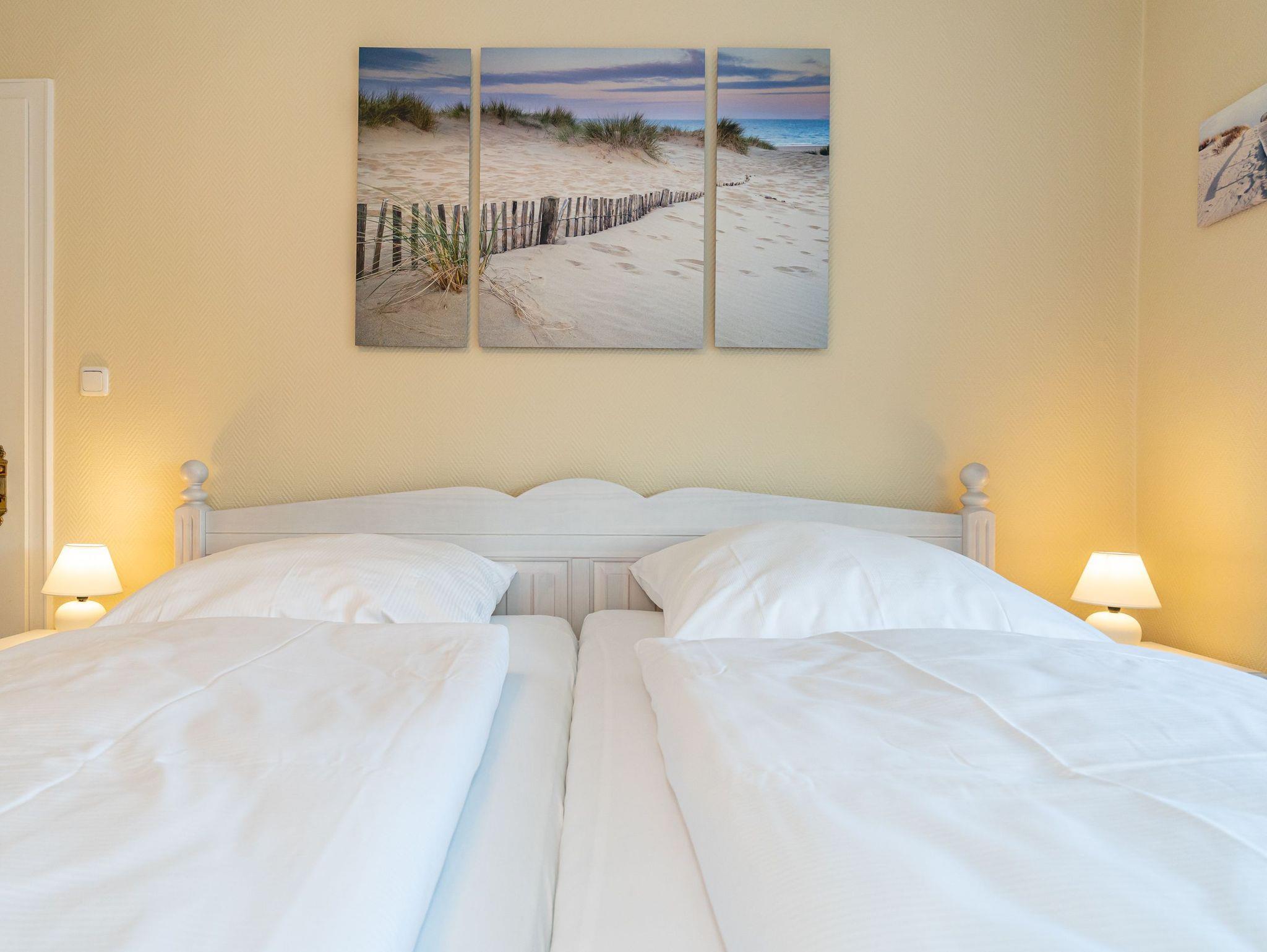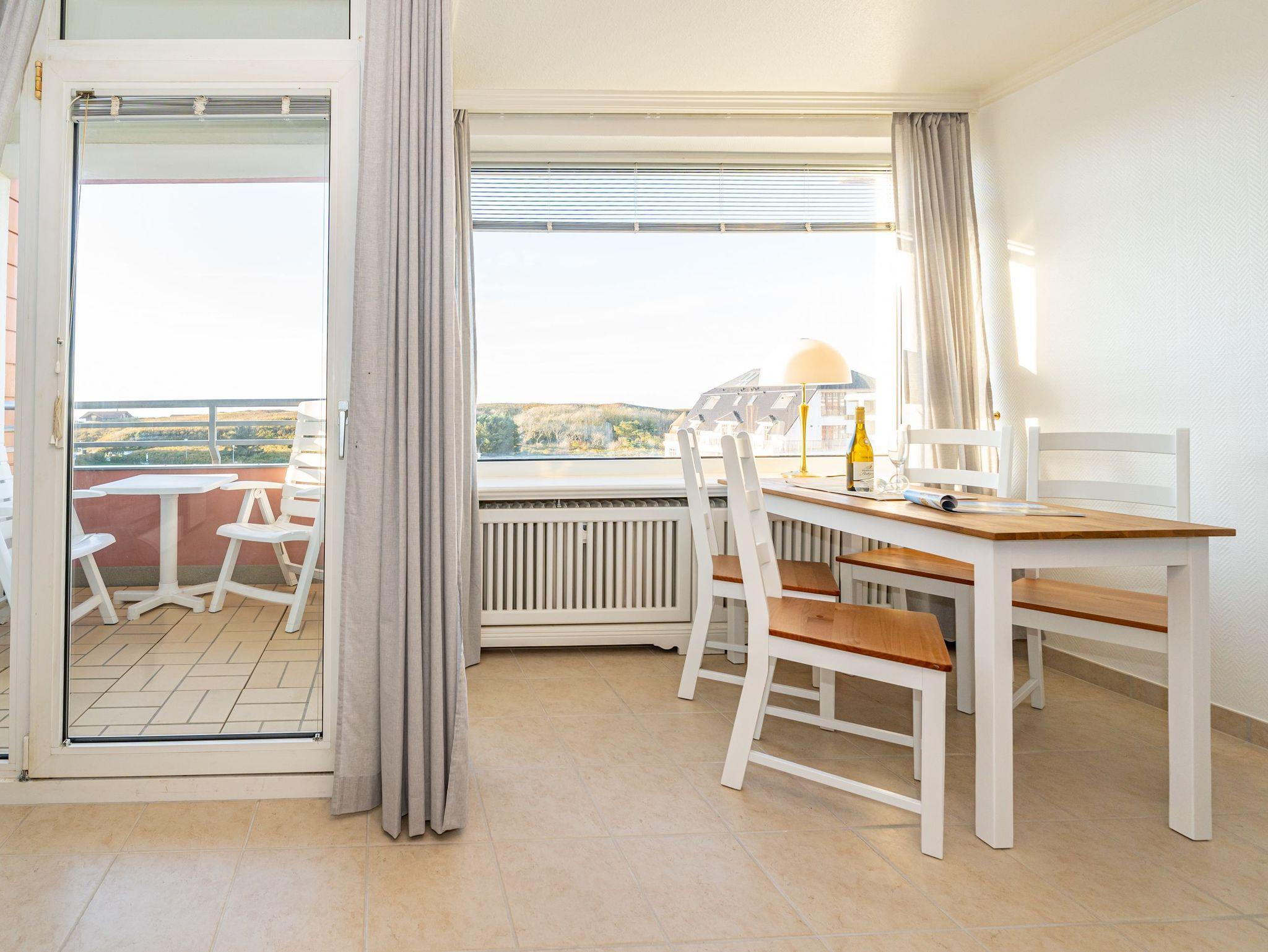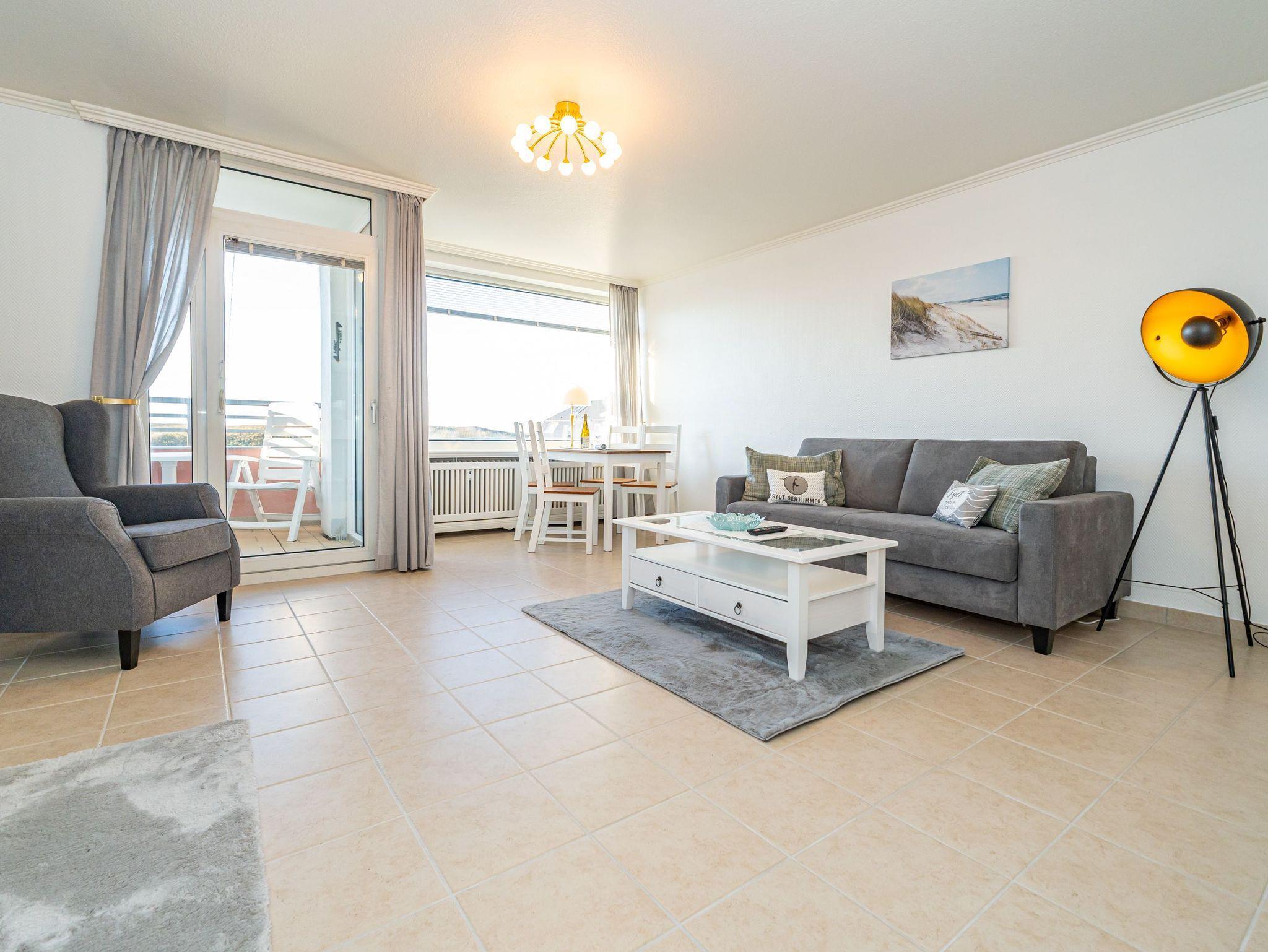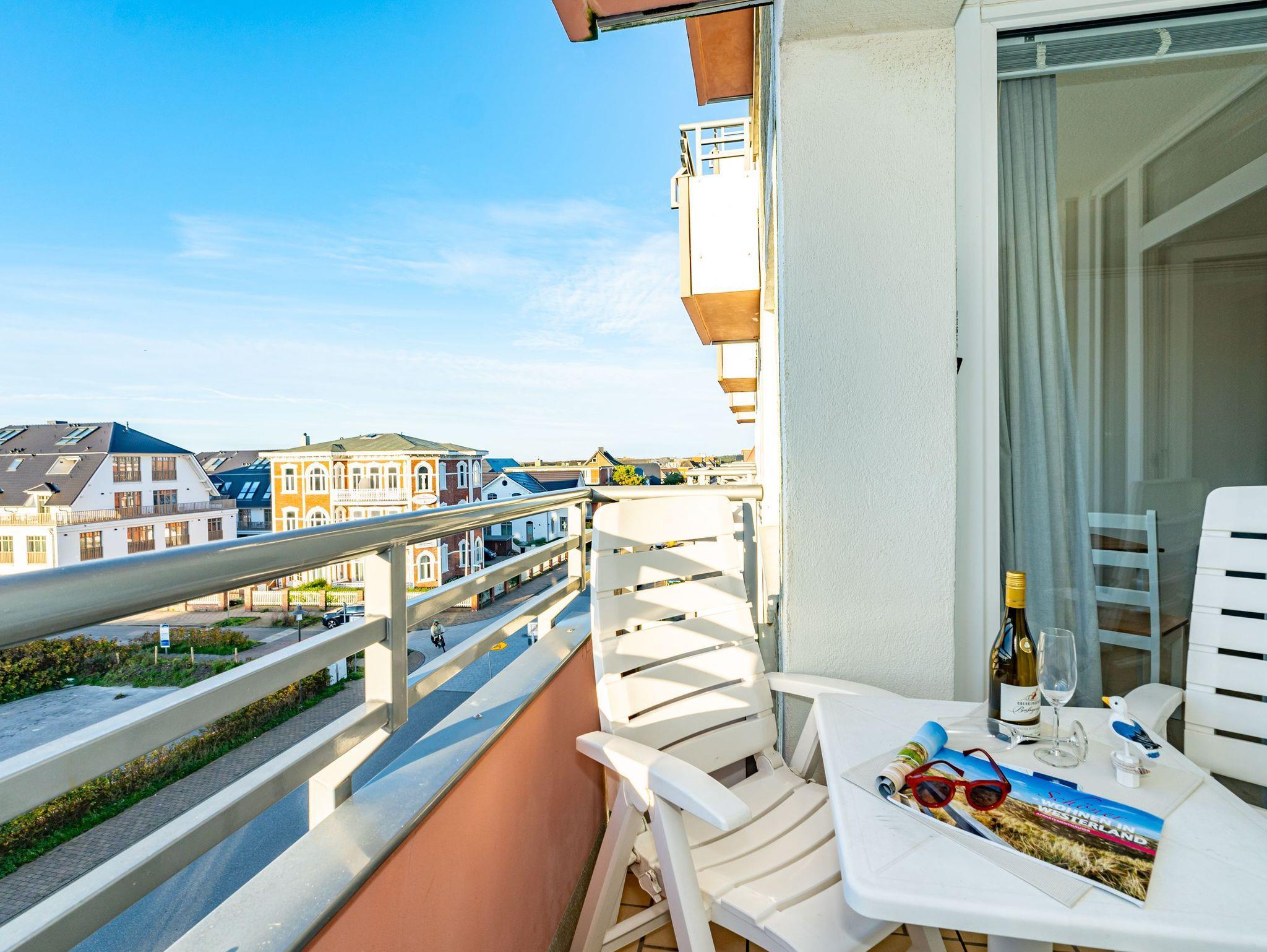 Geschmackvoll eingerichtete 2-Zimmer-Nichtraucher-Ferienwohnung, ca. 54,5 qm, in der 3. Etage zur Westseite für max. 4 Personen mit Westbalkon und Meerblick (Nachmittagssonne, mit Balkonmöbeln und Auflagen).
