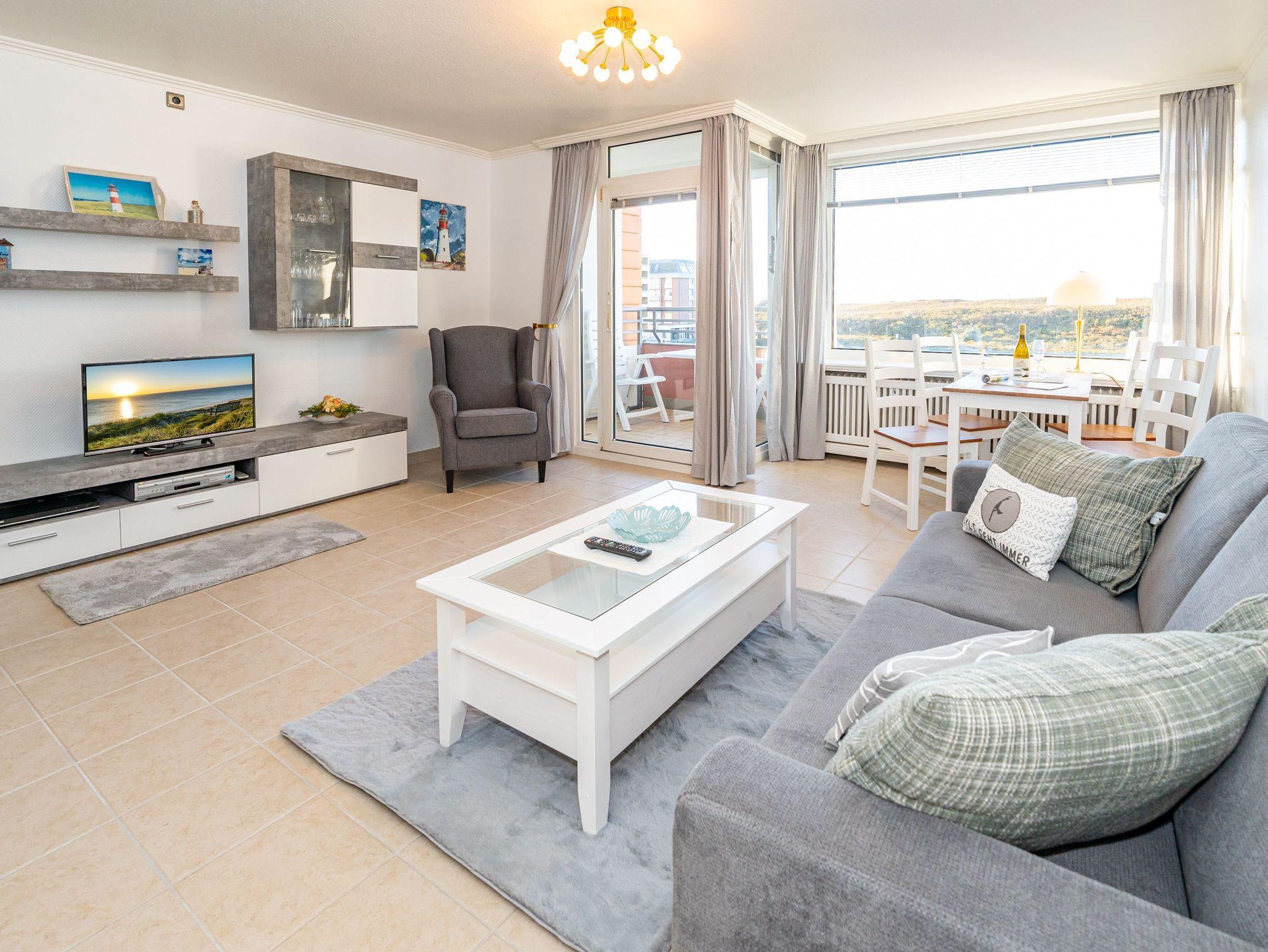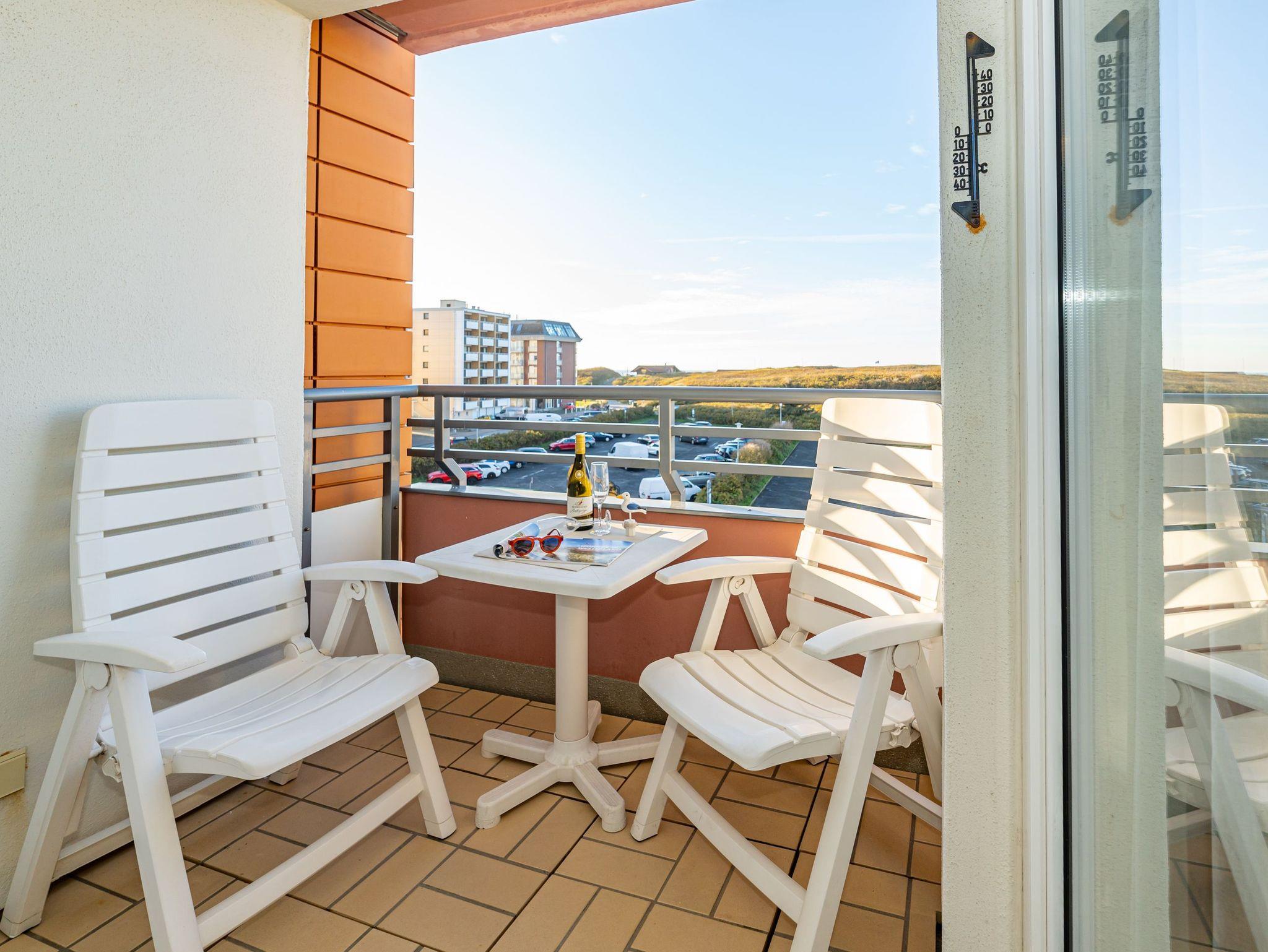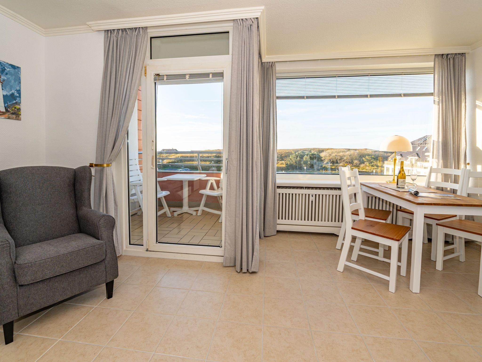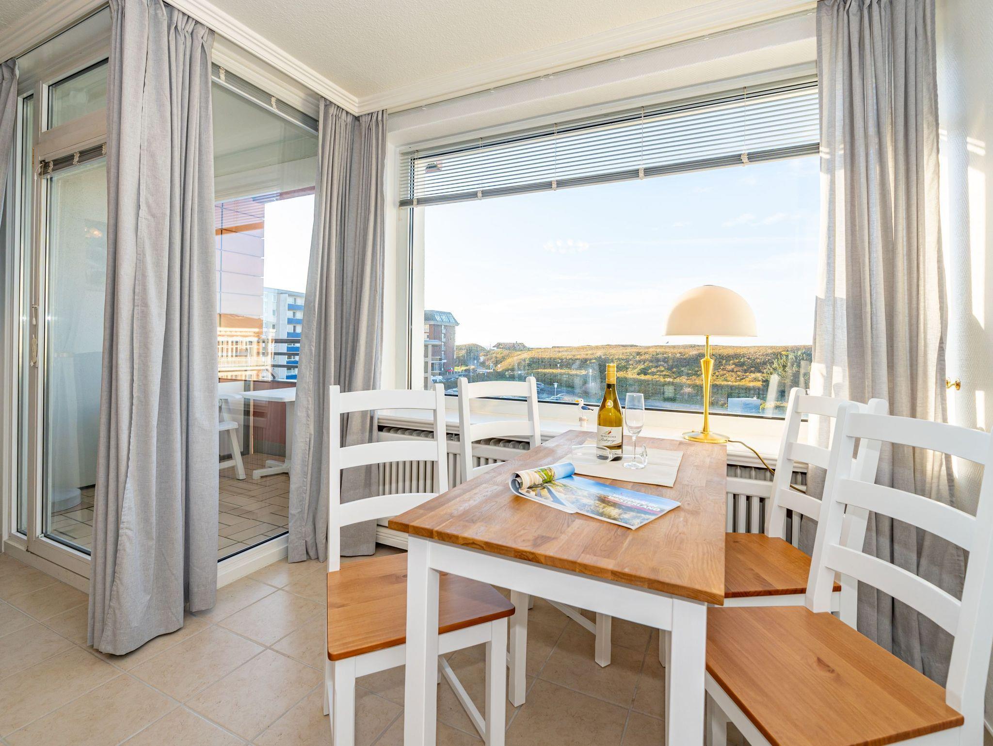 Geschmackvoll eingerichtete 2-Zimmer-Nichtraucher-Ferienwohnung, ca. 54,5 qm, in der 3. Etage zur Westseite für max. 4 Personen mit Westbalkon und Meerblick (Nachmittagssonne, mit Balkonmöbeln und Auflagen).