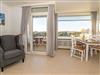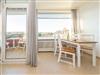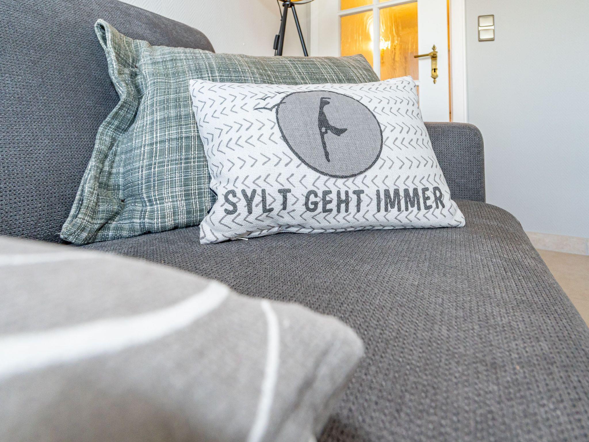 Der Wohnraum besteht aus einem Schlafsofa (Liegefläche 1,40 x 2,00 m) und einem Sessel, sowie einem separaten Essplatz am Fenster und Kabel-Flachbild-TV.