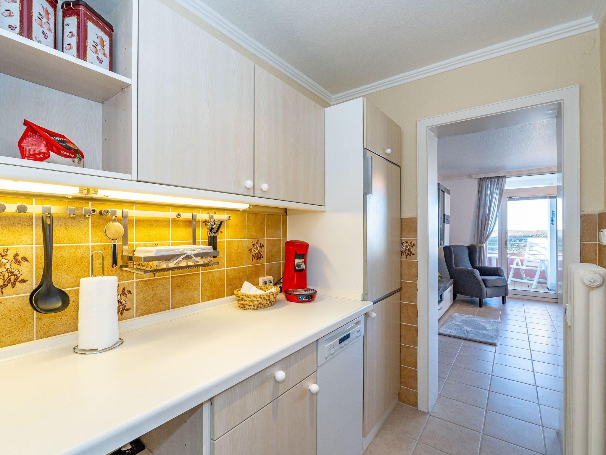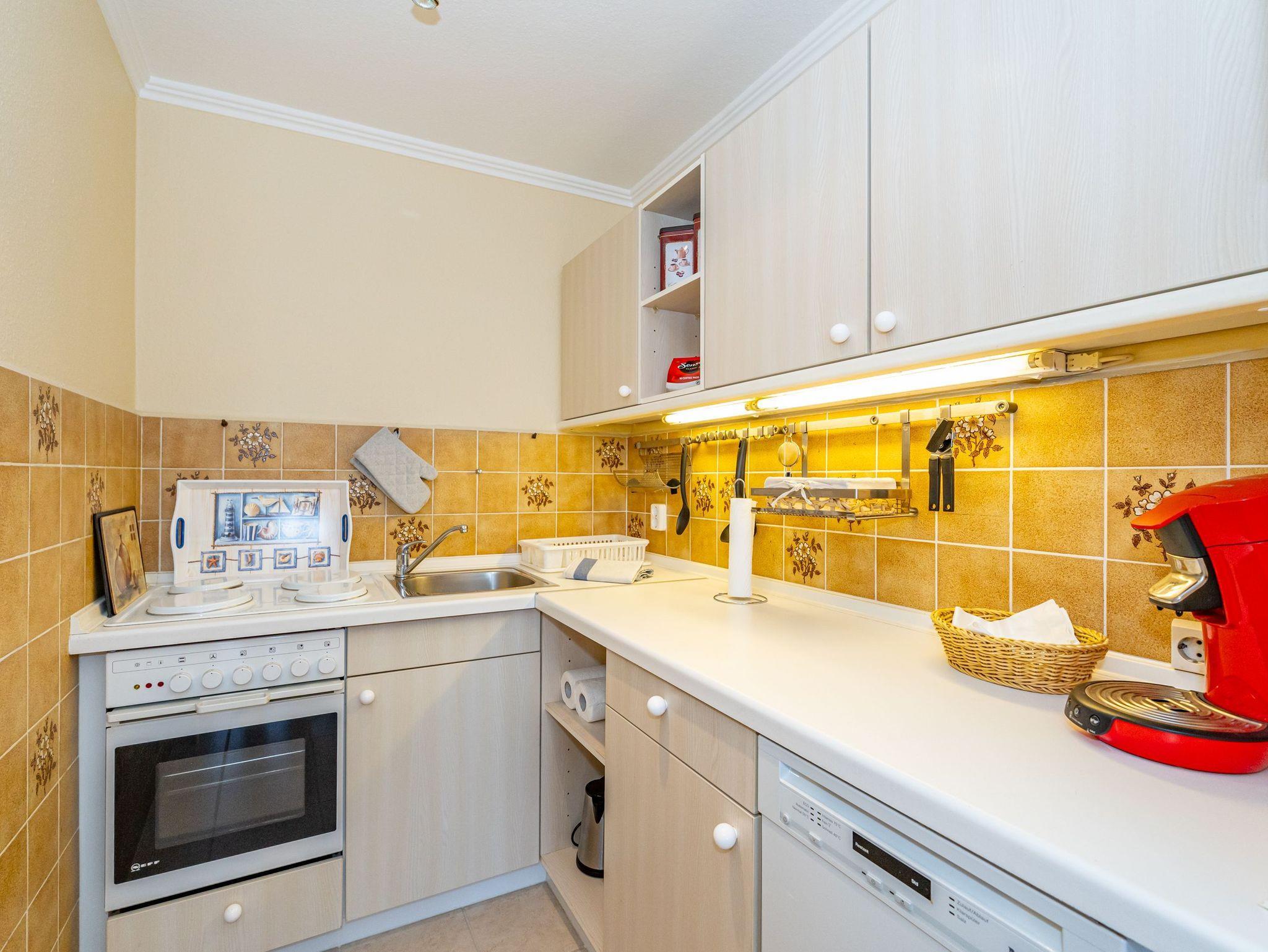 Die Küche ist mit einem Geschirrspüler, einem Herd mit Backofen und 4 Kochfeldern, Mikrowelle und einem Kühlschrank (ohne Gefrierfach) ausgestattet. Kaffeemaschine, Wasserkocher und Toaster gehören zur Grundausstattung.