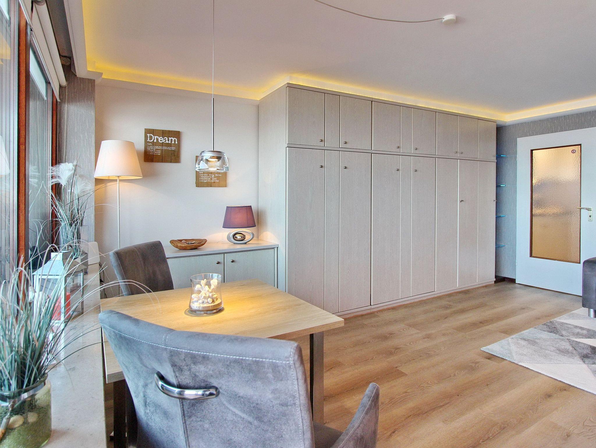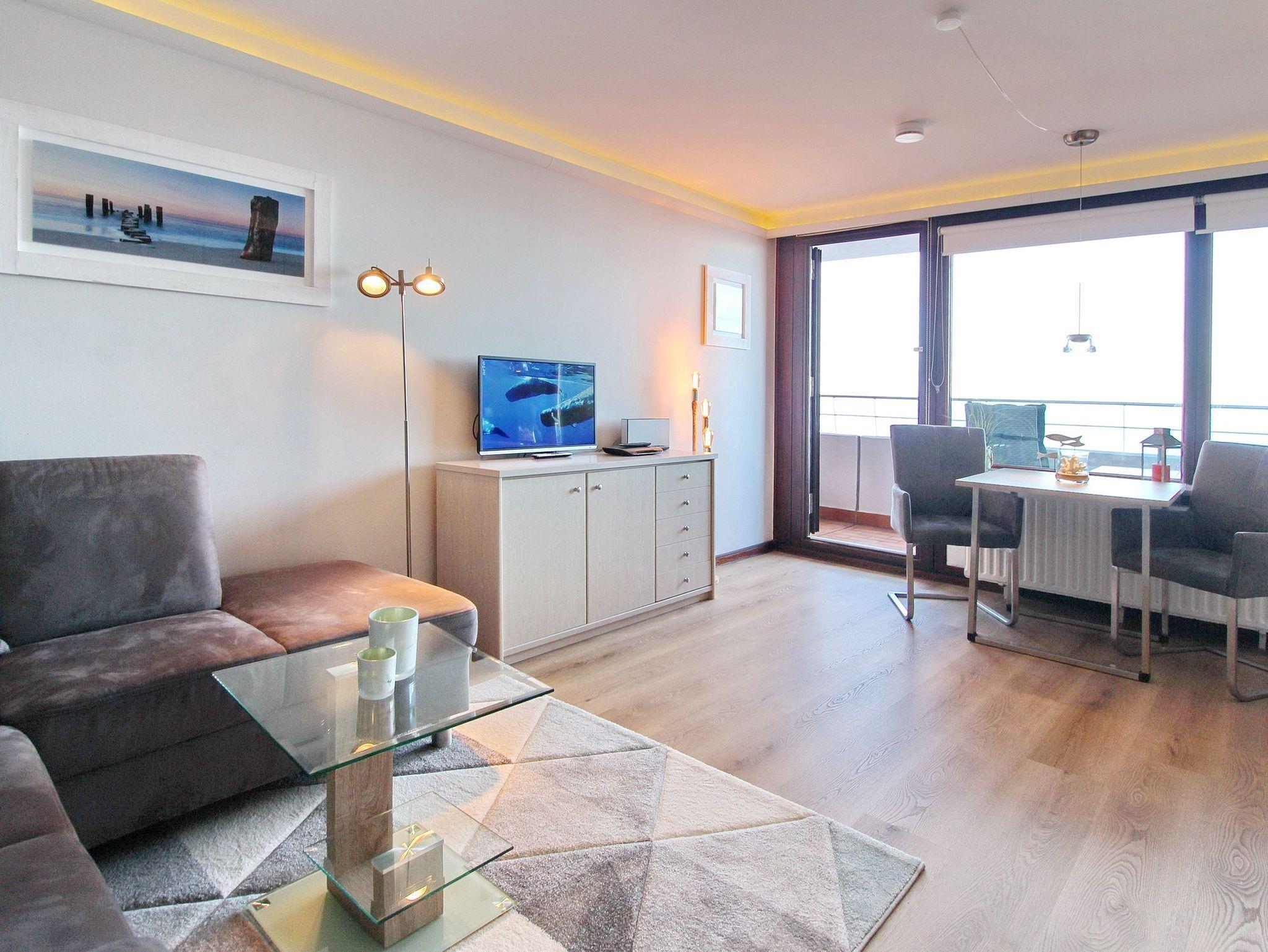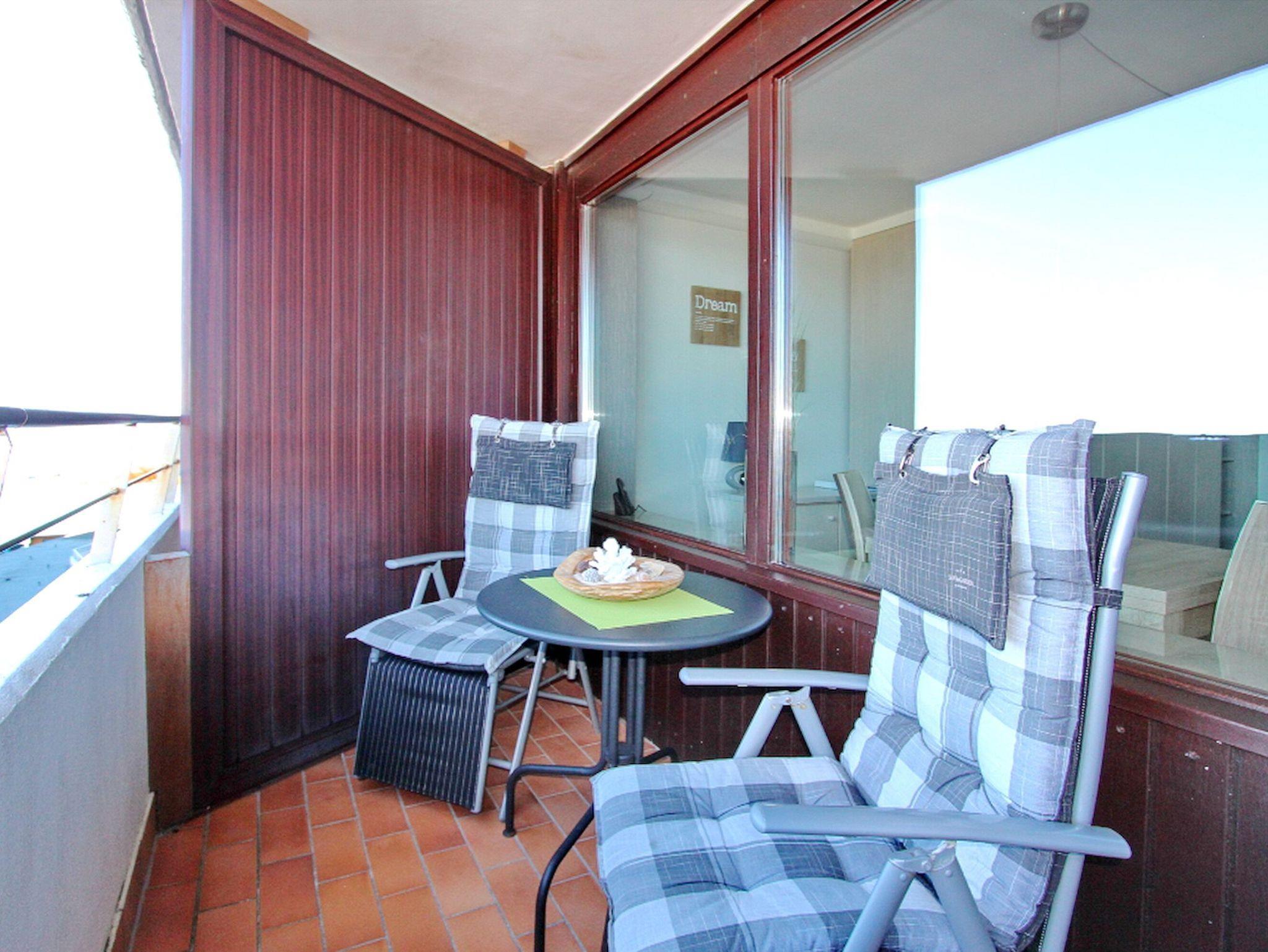 Diese Nichtraucherwohnung in der 3. Etage im Haus Metropol hat einen herrlichen Blick über den Strand und die Nordsee. Der hell und freundlich eingerichtete Wohn-/Schlafraum mit vorgelagertem Westbalkon verfügt über Einzelschrankbetten, einen Essplatz am Fenster mit 2 Stühlen, sowie eine bequemes Sofa. Im modernen Badezimmer gibt es eine Eckdusche, einen Handtuchtrockner, einen Duschhocker und einen Fön. Eine Einbauküche befindet sich im Flur. Stilvoll decken sie den Tisch mit Porzellan von Seltmann Weiden. Zur technischen Ausstattung gehört ein Flachbildfernseher von Panasonic mit integriertem Radio, eine Bluetooth Anlage mit Radio und CD Player von Sony und ein Telefonanschluss mit Flatrate ins dt. Festnetz ist ebenfalls vorhanden. Ein freies WLAN Netzwerk (WEG Haus Metropol - Passwortfrei - ohne Gewähr) und ein eigener Internetzugang des Eigentümers steht ihnen kostenfrei zur Verfügung. Haustiere sind herzlich willkommen. Wohnungsgröße: ca.34 m².