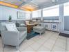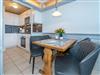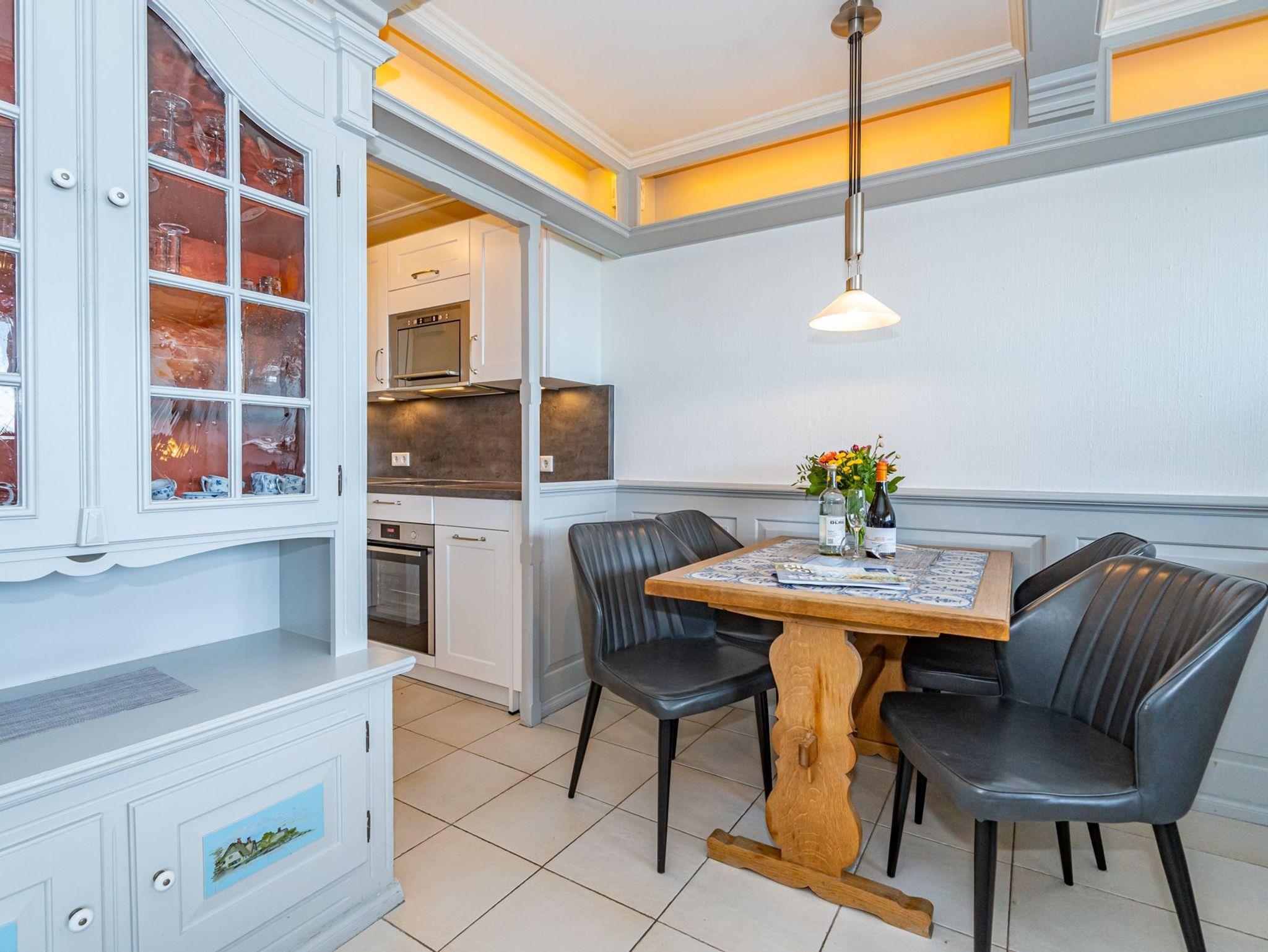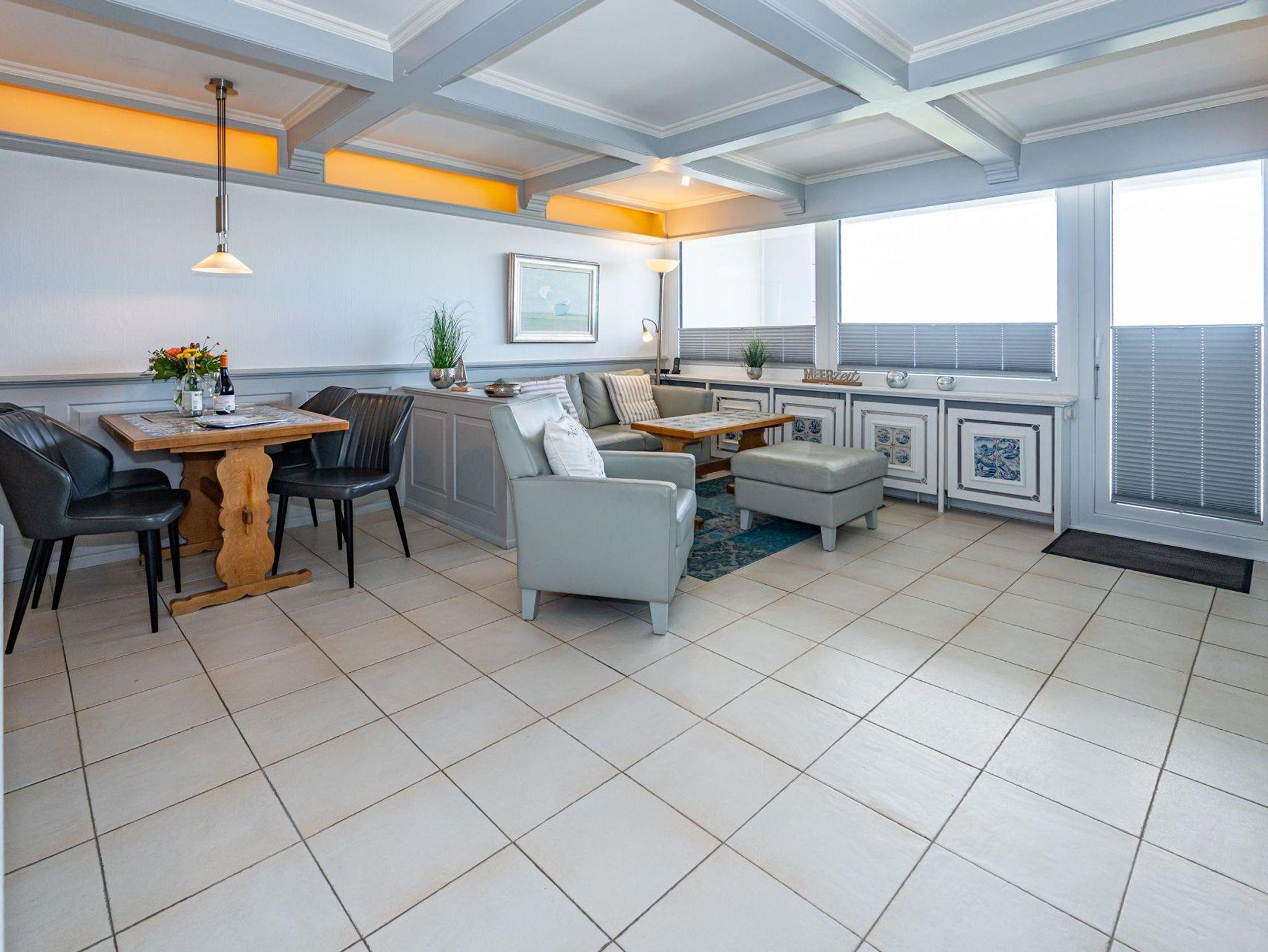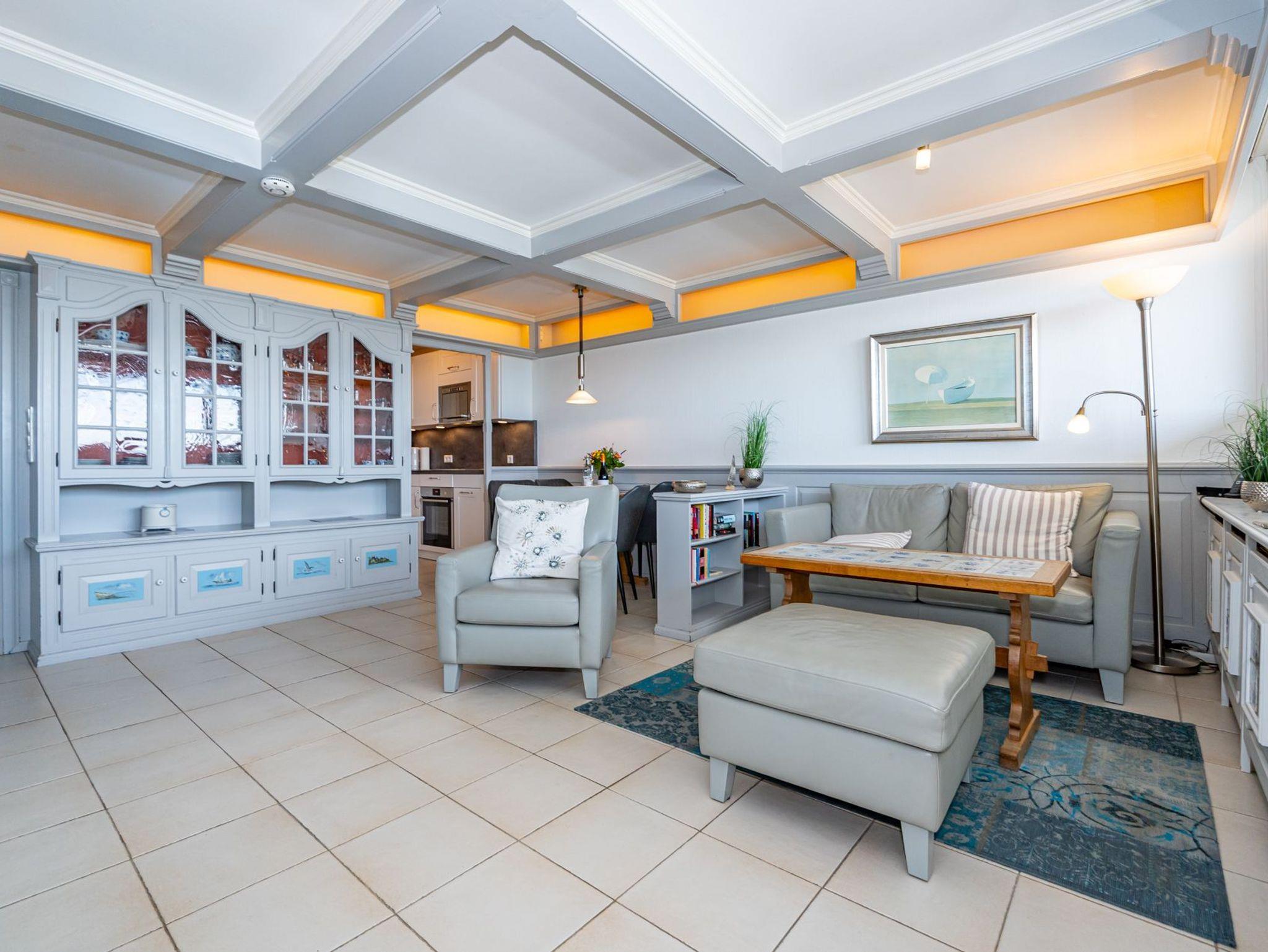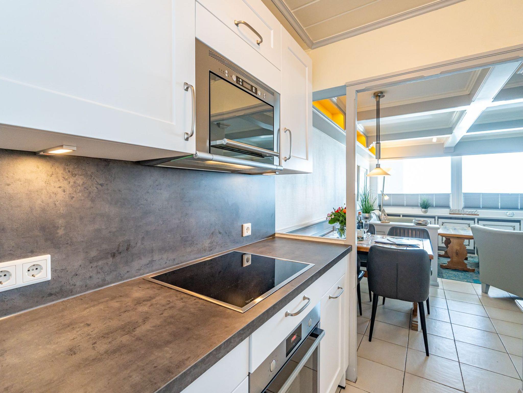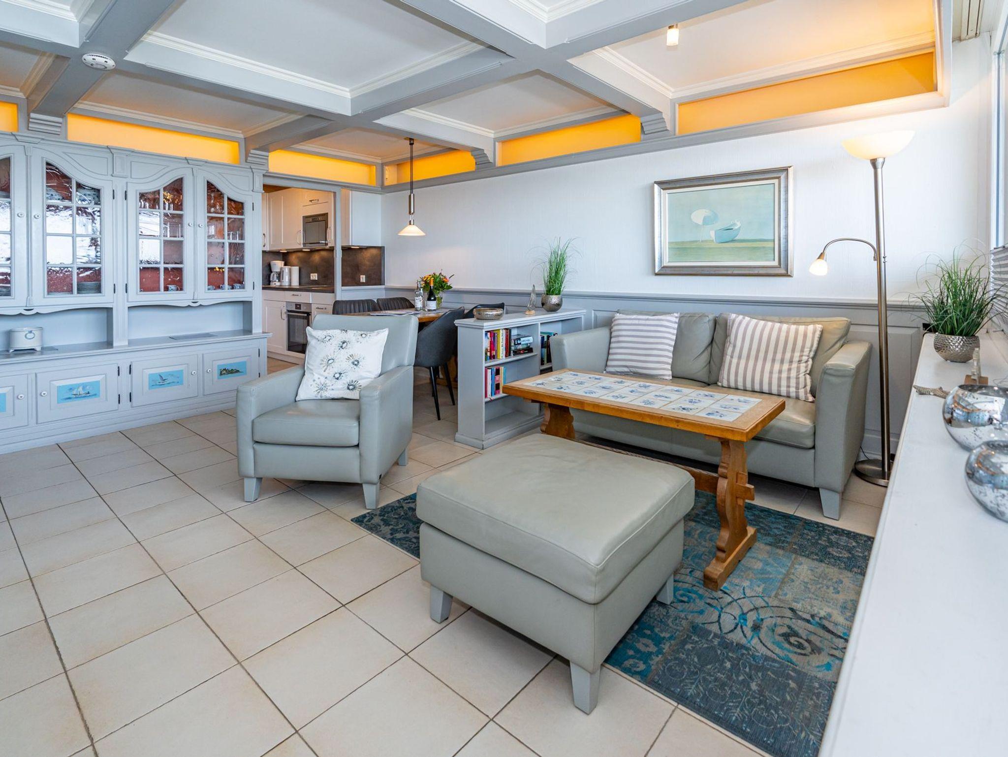 Der Wohnraum besteht aus einer besonders hochwertigen Sitzgarnitur von Bielefelder Werkstätten (2-Sitzer-Couch und ein Sessel mit Fußhocker), einem Essplatz und einer schönen, zum Wohnraum hin geöffneten Küche.