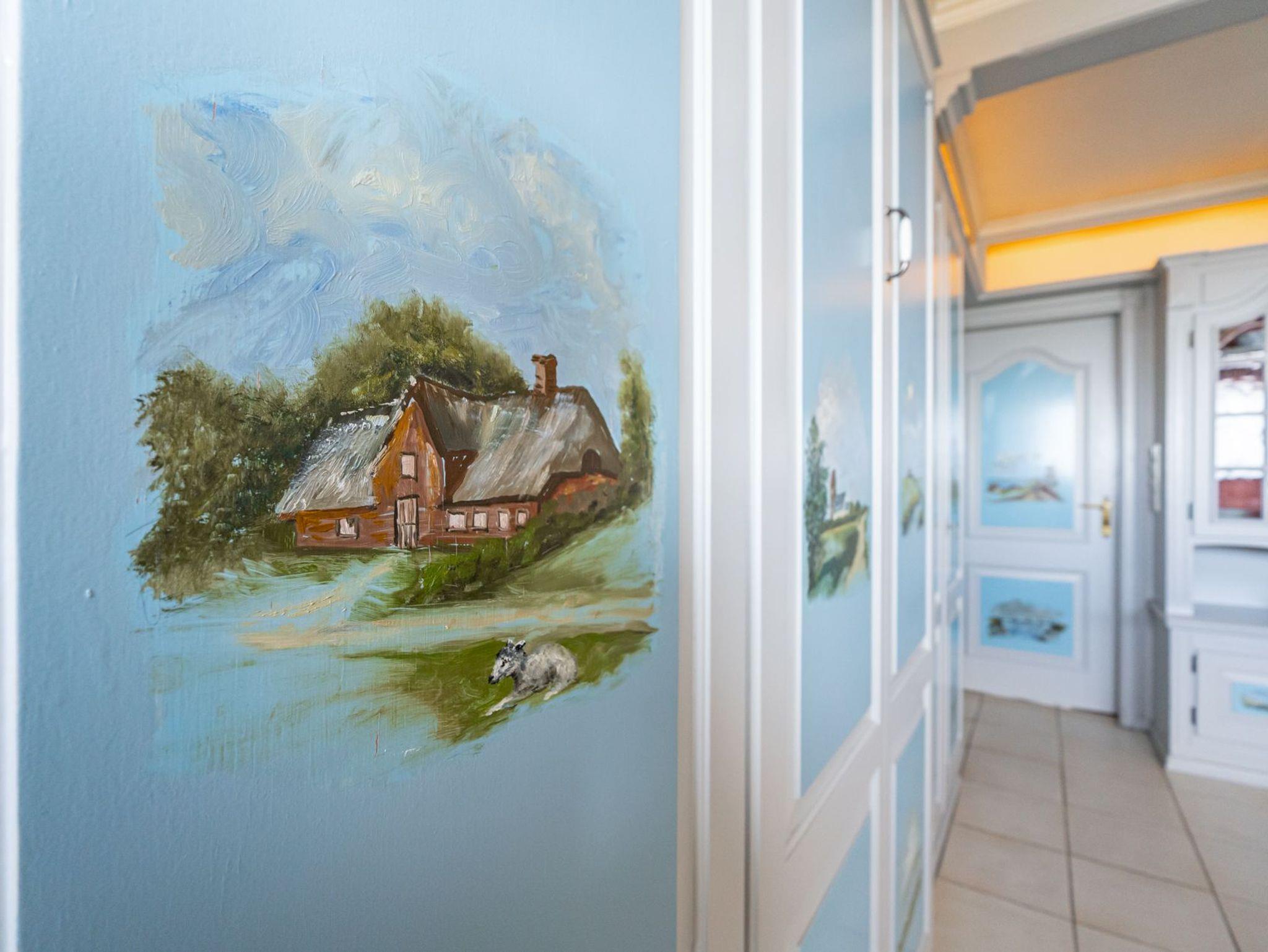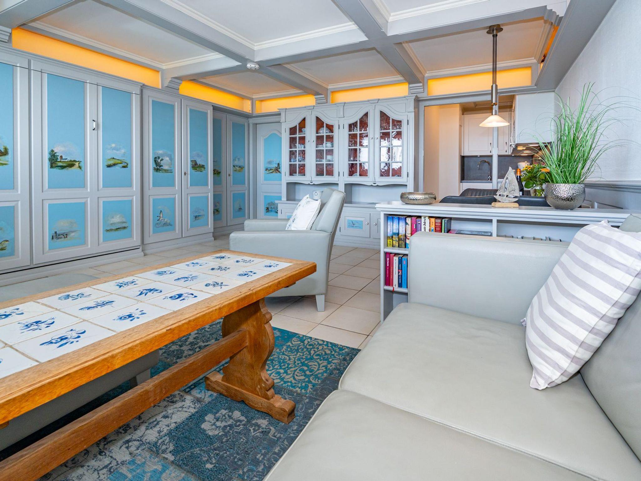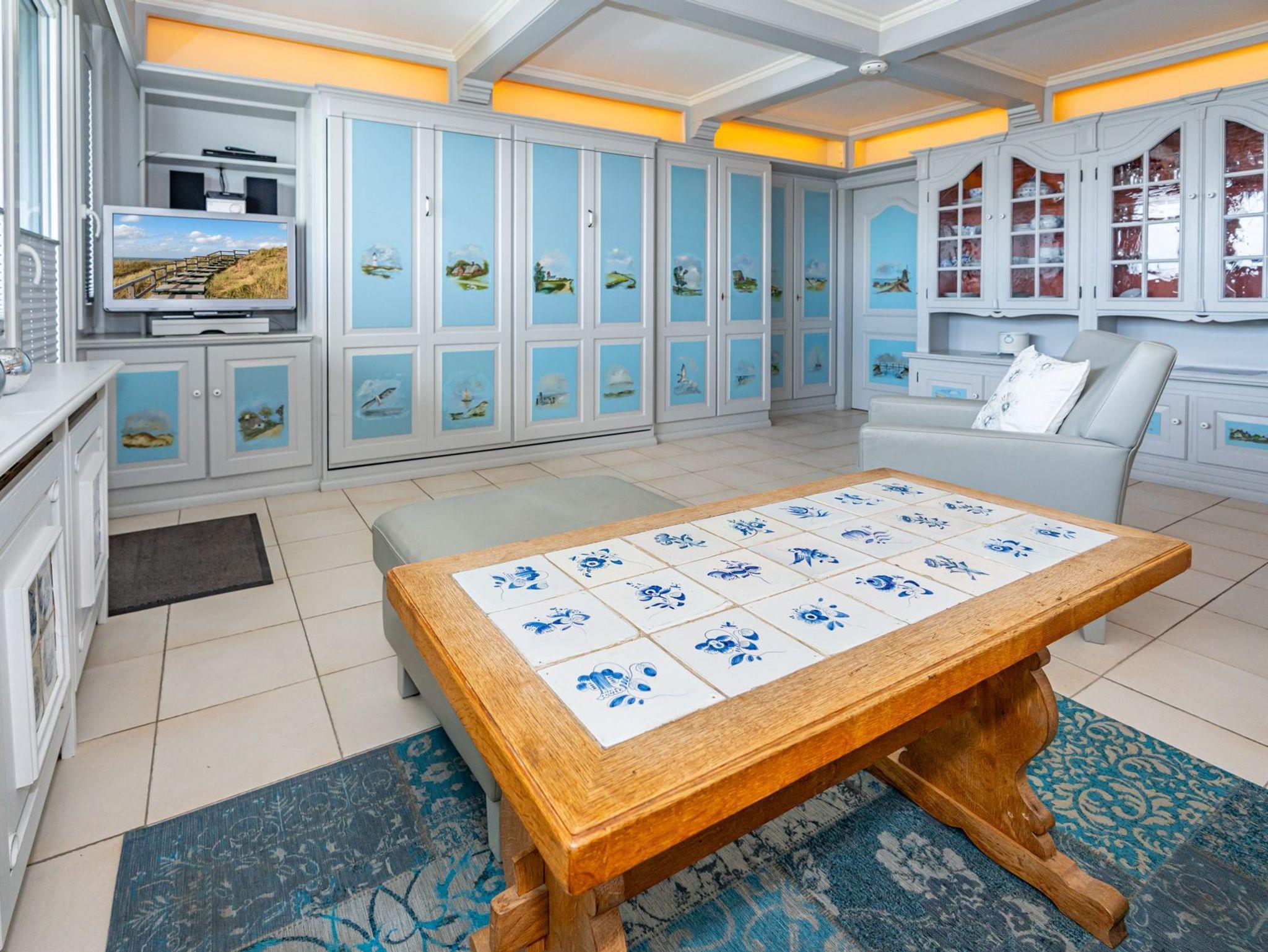 Die im modernen Friesenstil gehaltene Wohnung ist mit ihren aufwendigen Tischlereinbauten und handgemalten Sylt-Motiven ein Unikat.