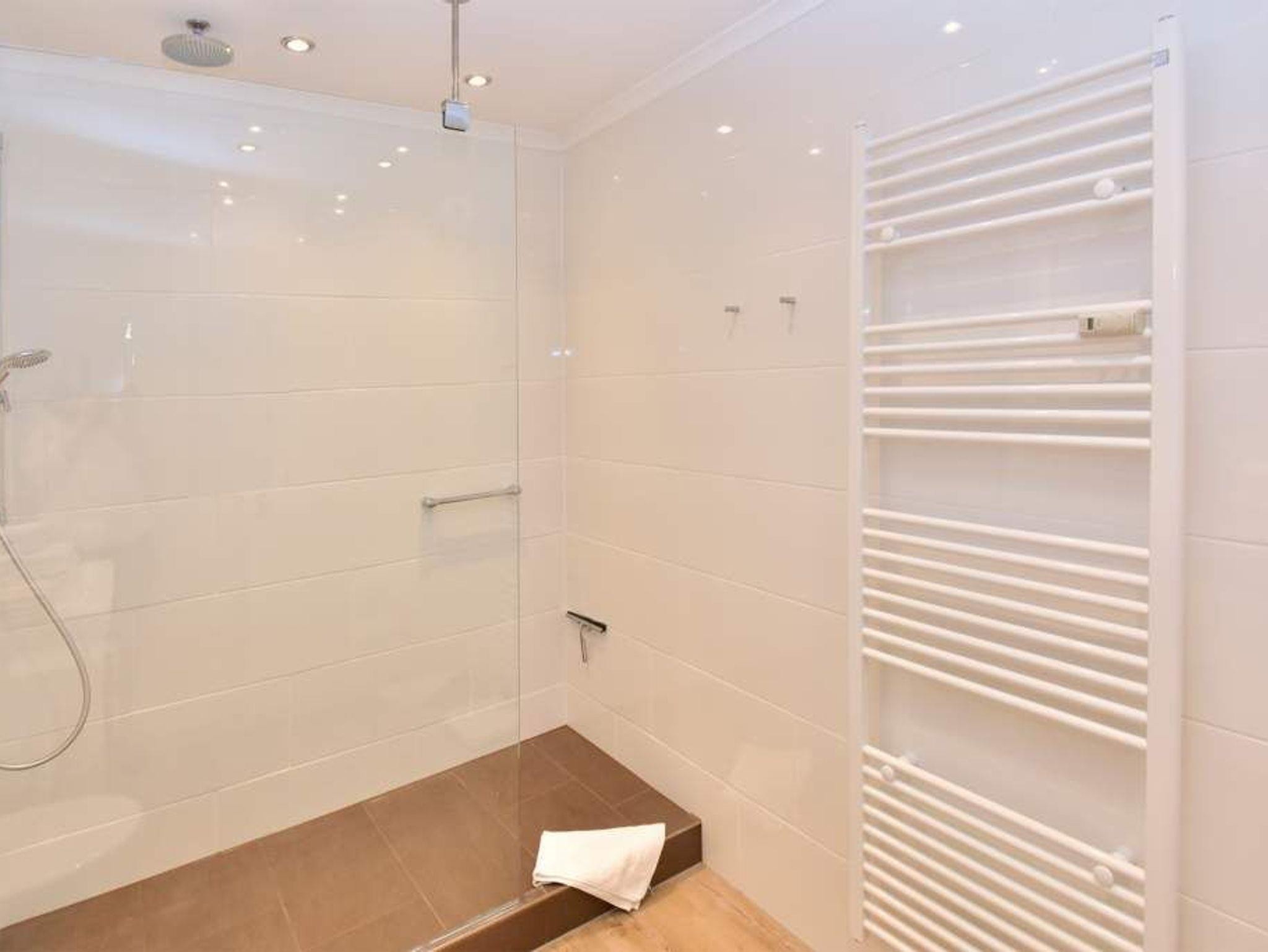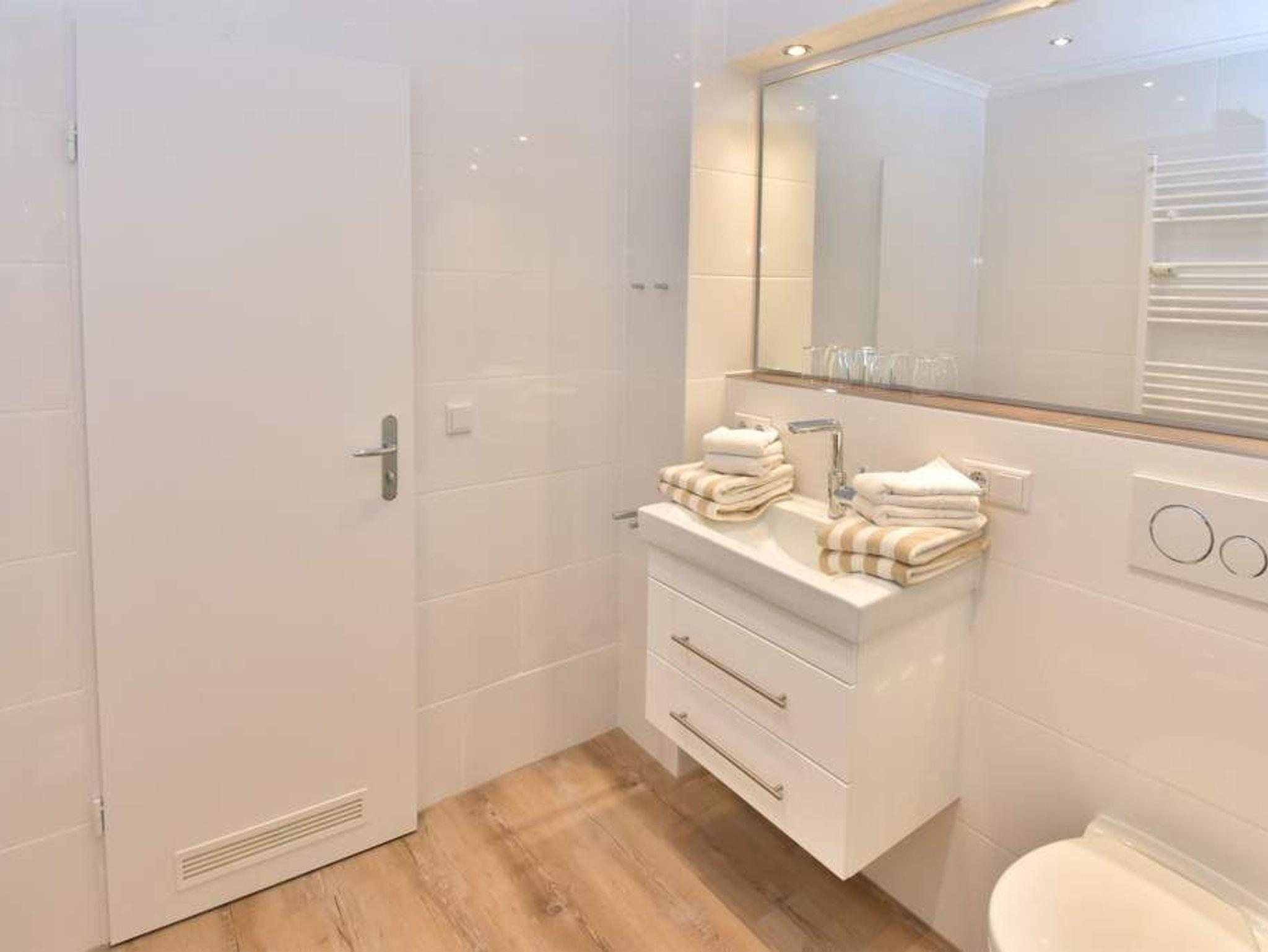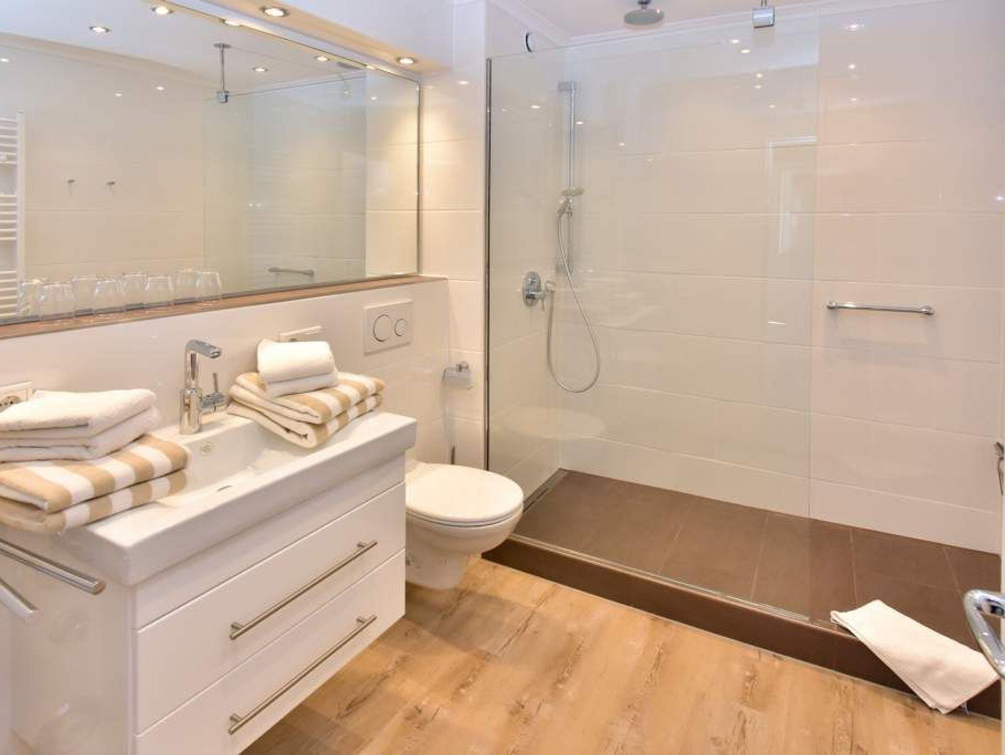Im neuen Badezimmer befindet sich eine extragroße Dusche mit flachem Einstieg, ein Waschtisch, Handtuchtrockner und das WC.