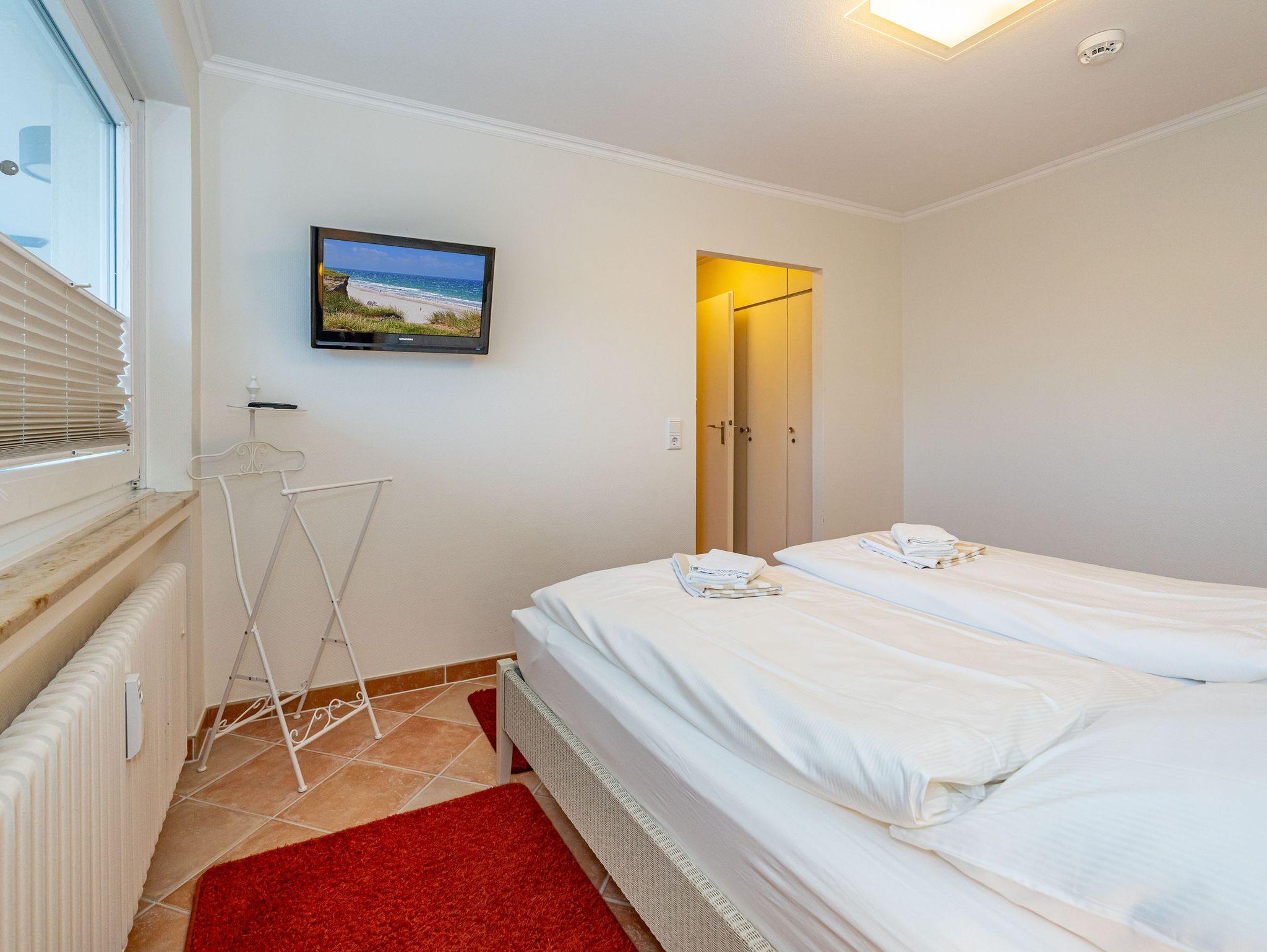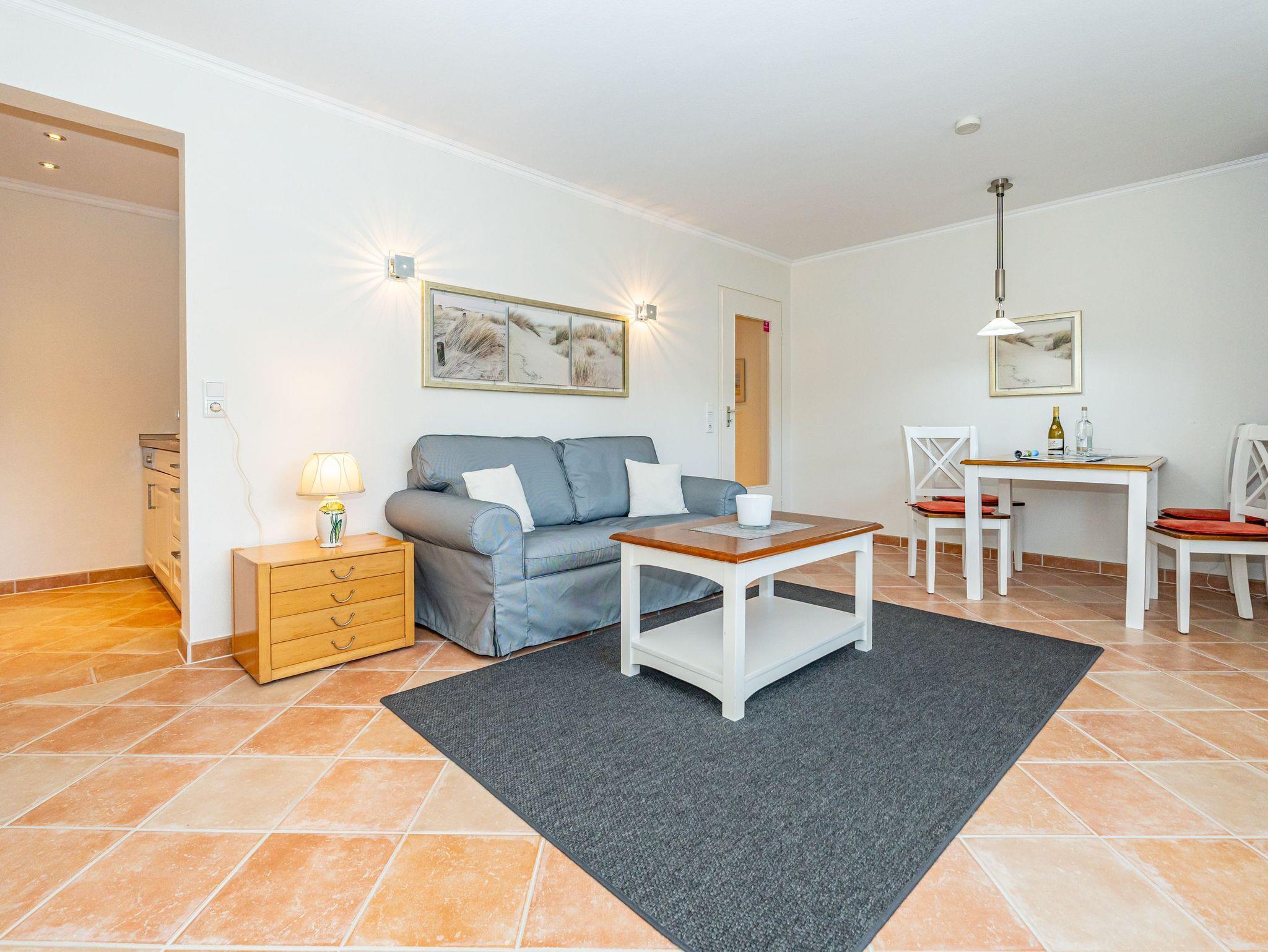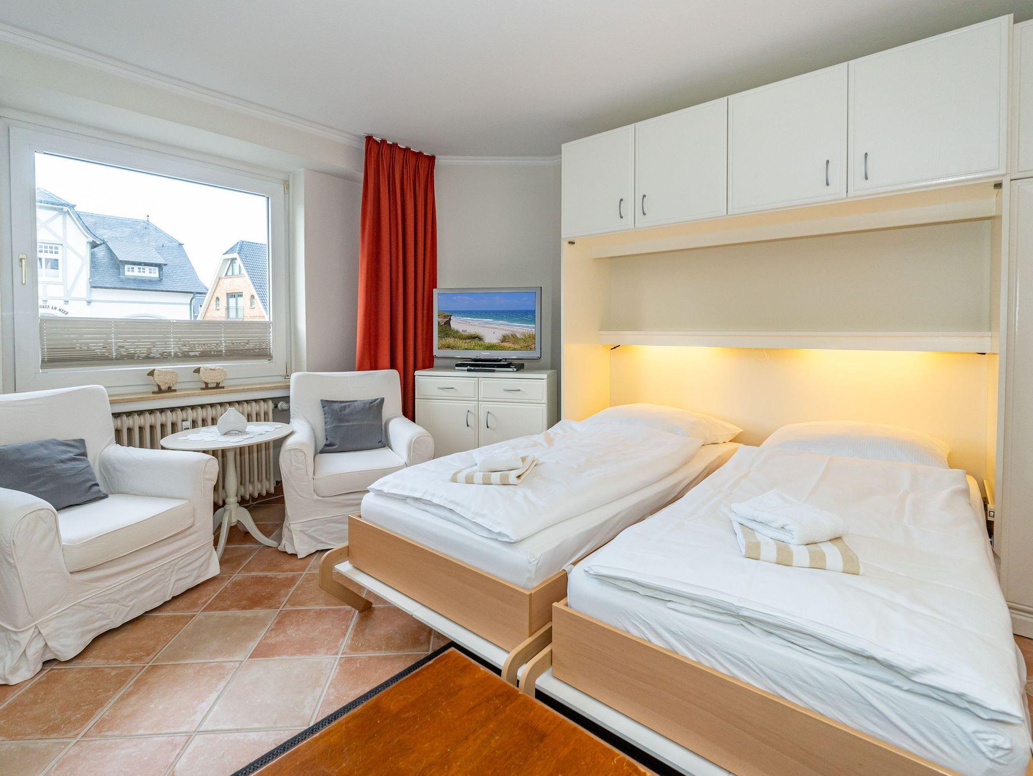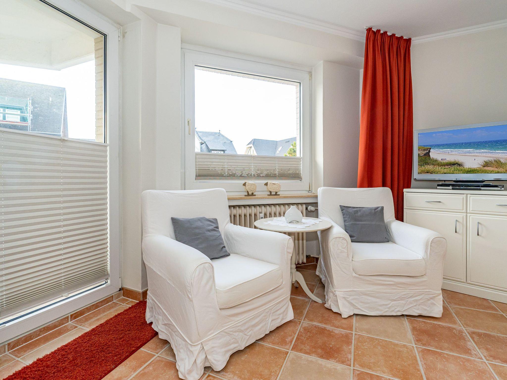 Erleben Sie Komfort und Wohlbefinden in dieser großzügigen, allergikergeeigneten 2-Zimmer-Ferienwohnung im Hochparterre (ca. 55 qm) ? ideal für einen entspannten Aufenthalt. Die Wohnung liegt auf einer Ebene und bietet Ihnen ein durchdachtes helles Raumkonzept, das keine Wünsche offen lässt. Im offenen Wohnbereich finden Sie flexible Wandklappbetten, eine gemütliche 2-Sitzer-Couch mit zwei Sesseln, einen Flachbild-TV, einen DVD-Player, ein Radio sowie einen offenen WLAN-Hotspot. Ein separater Essplatz und der Westbalkon ? der Sie in der Nachmittagssonne mit seiner komfortablen Ausstattung zum Verweilen einlädt ? runden den Wohnbereich perfekt ab.