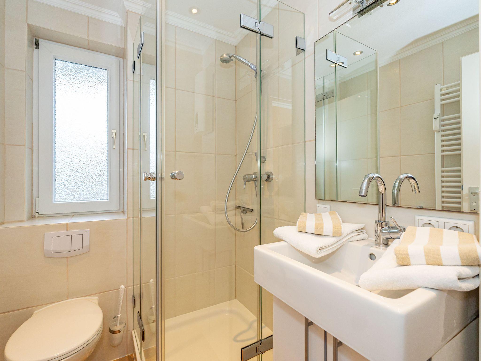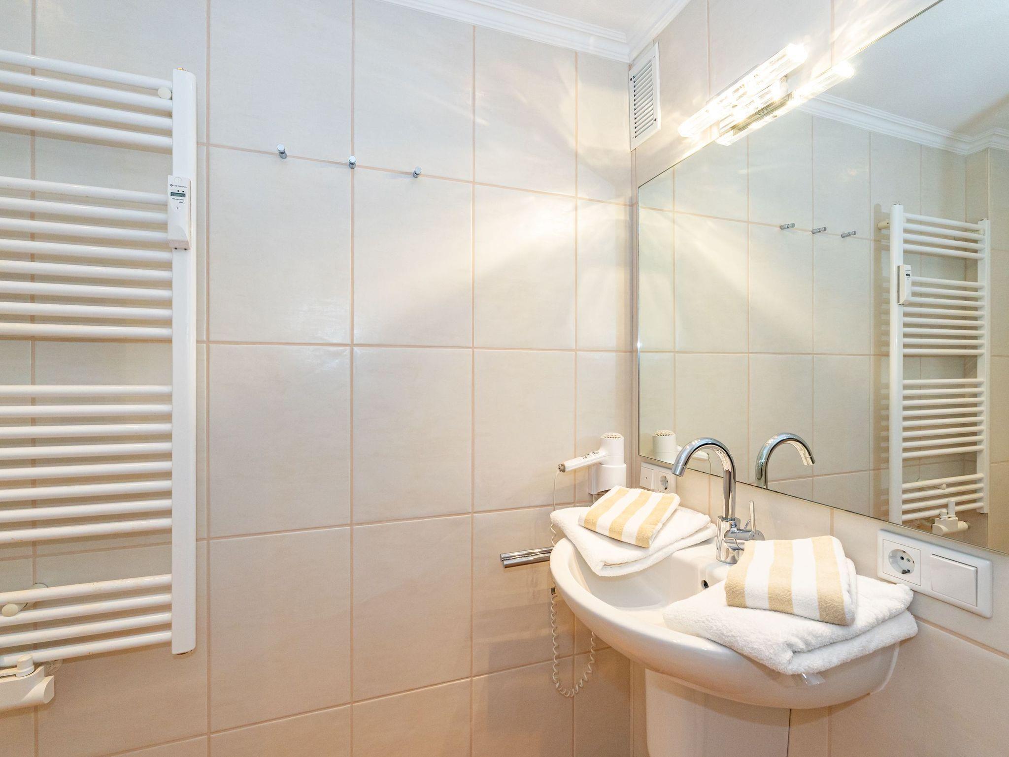 Das helle Schlafzimmer ist mit einem Doppelbett ausgestattet und verfügt über einen zusätzlichen Flachbild-TV für entspannte Abende. Die offene Küche überzeugt mit einem Geschirrspüler, einer Mikrowelle, einem Cerankochfeld sowie einer Kaffeemaschine, einem Wasserkocher und einem Toaster ? ideal, um Ihre Lieblingsgerichte selbst zuzubereiten. Für zusätzlichen Komfort sorgen zwei separate Duschbäder mit WC sowie ein Ionen-Haartrockner.