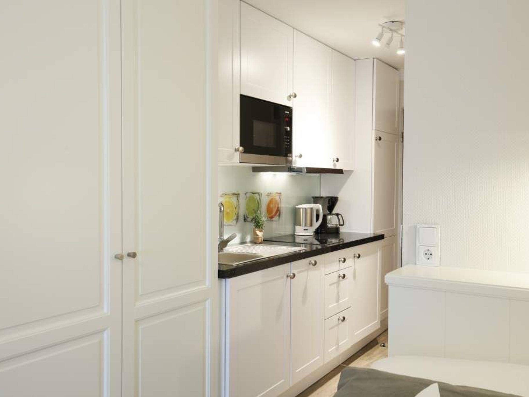 Die moderne Küchenzeile hat einen Geschirrspüler, eine Mikrowelle, ein Ceranfeld mit zwei Kochfeldern und ein Kühlschrank. Kaffeemaschine, Wasserkocher und Toaster gehören zur Grundausstattung.