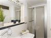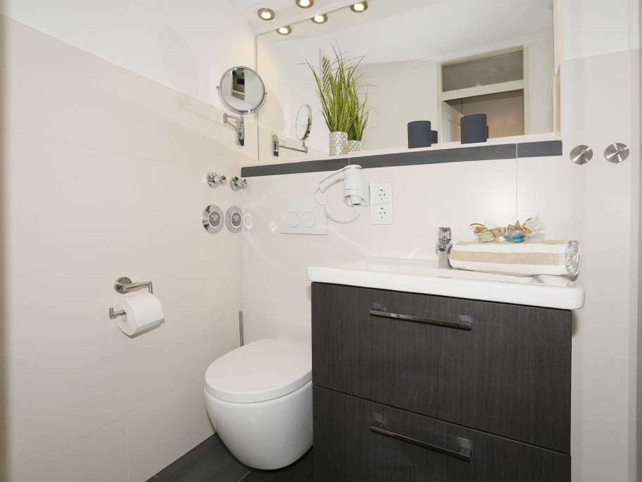 Im hellen, freundlichen Bad befinden sich eine Dusche, ein WC und ein Waschtisch.