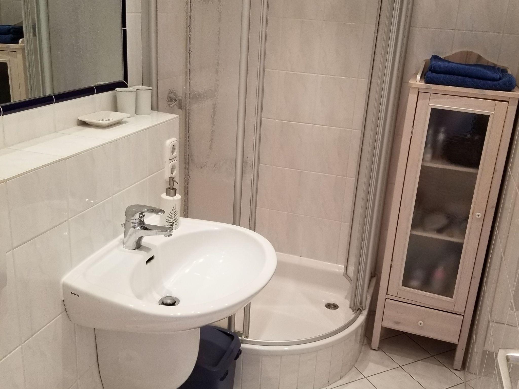 Das Badezimmer ist mit einer Dusche und einem WC ausgestattet. Ein Haartrockner ist ebenfalls vorhanden.