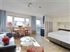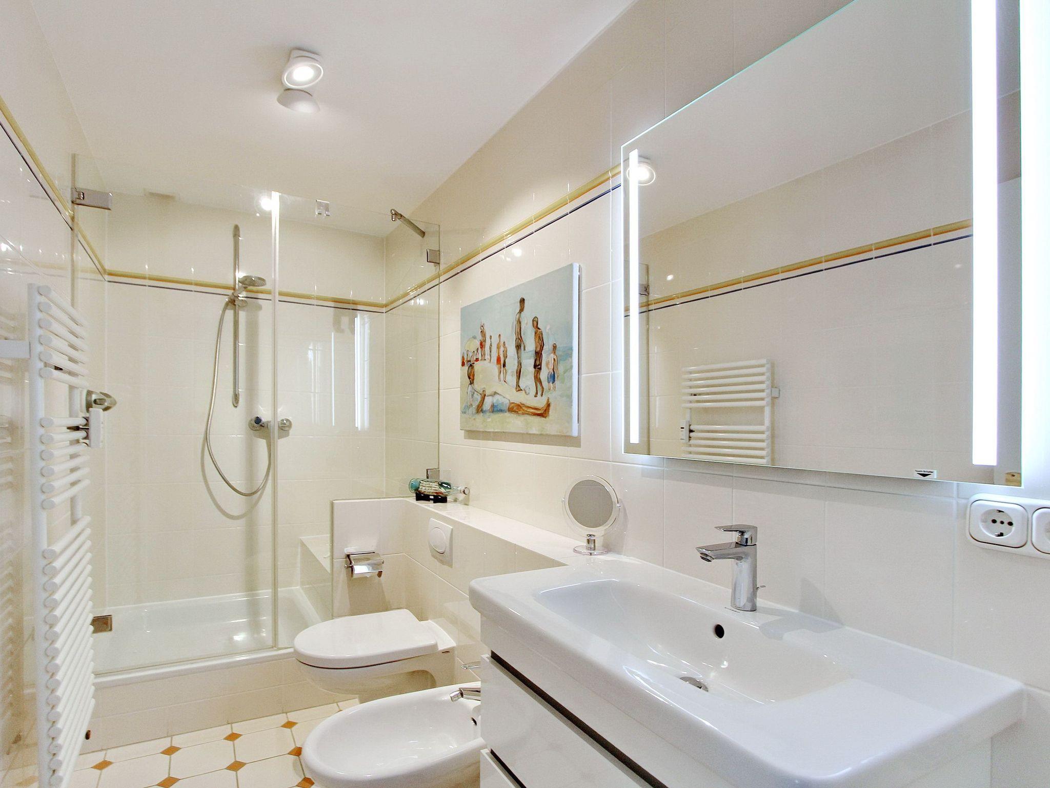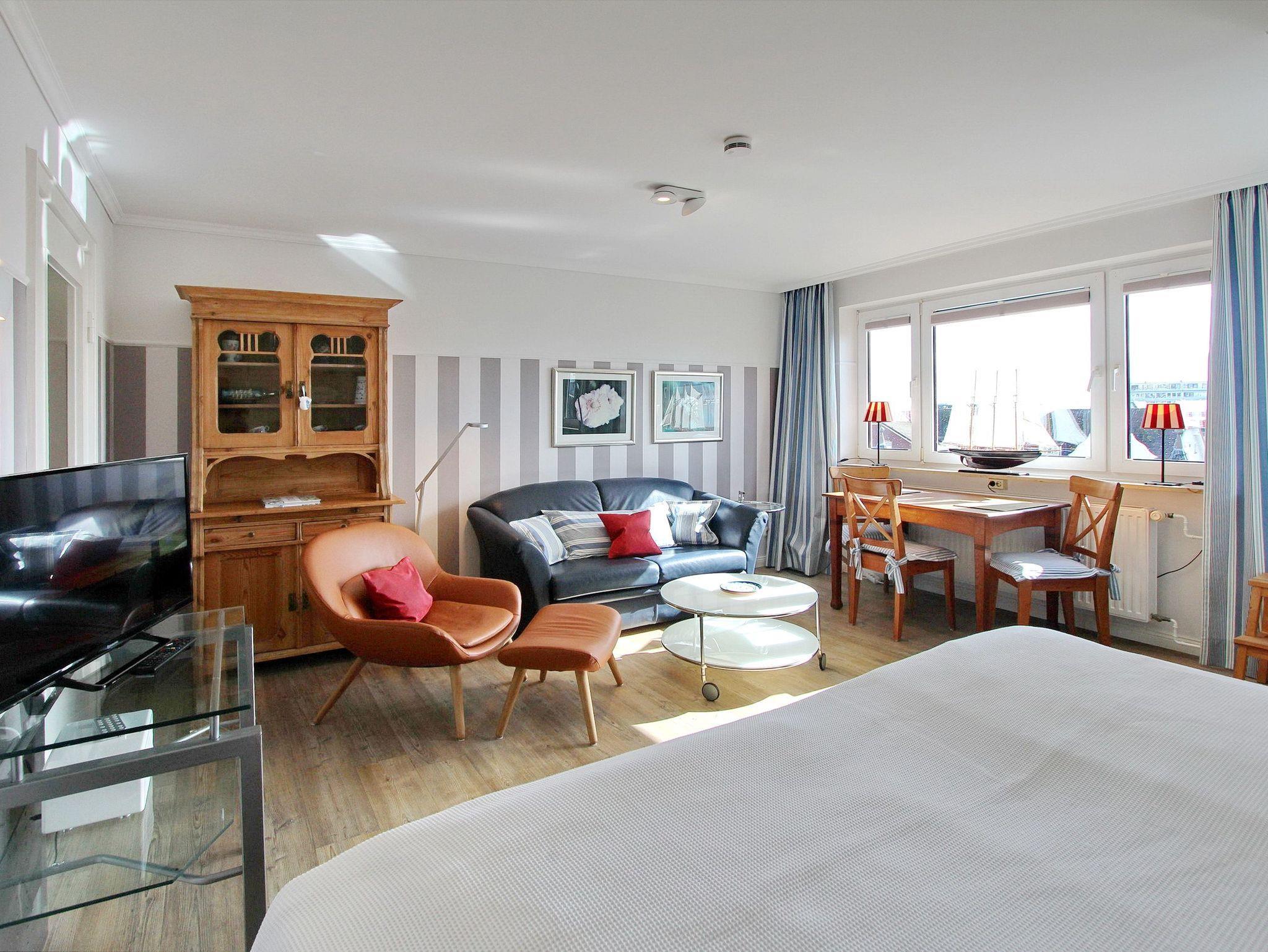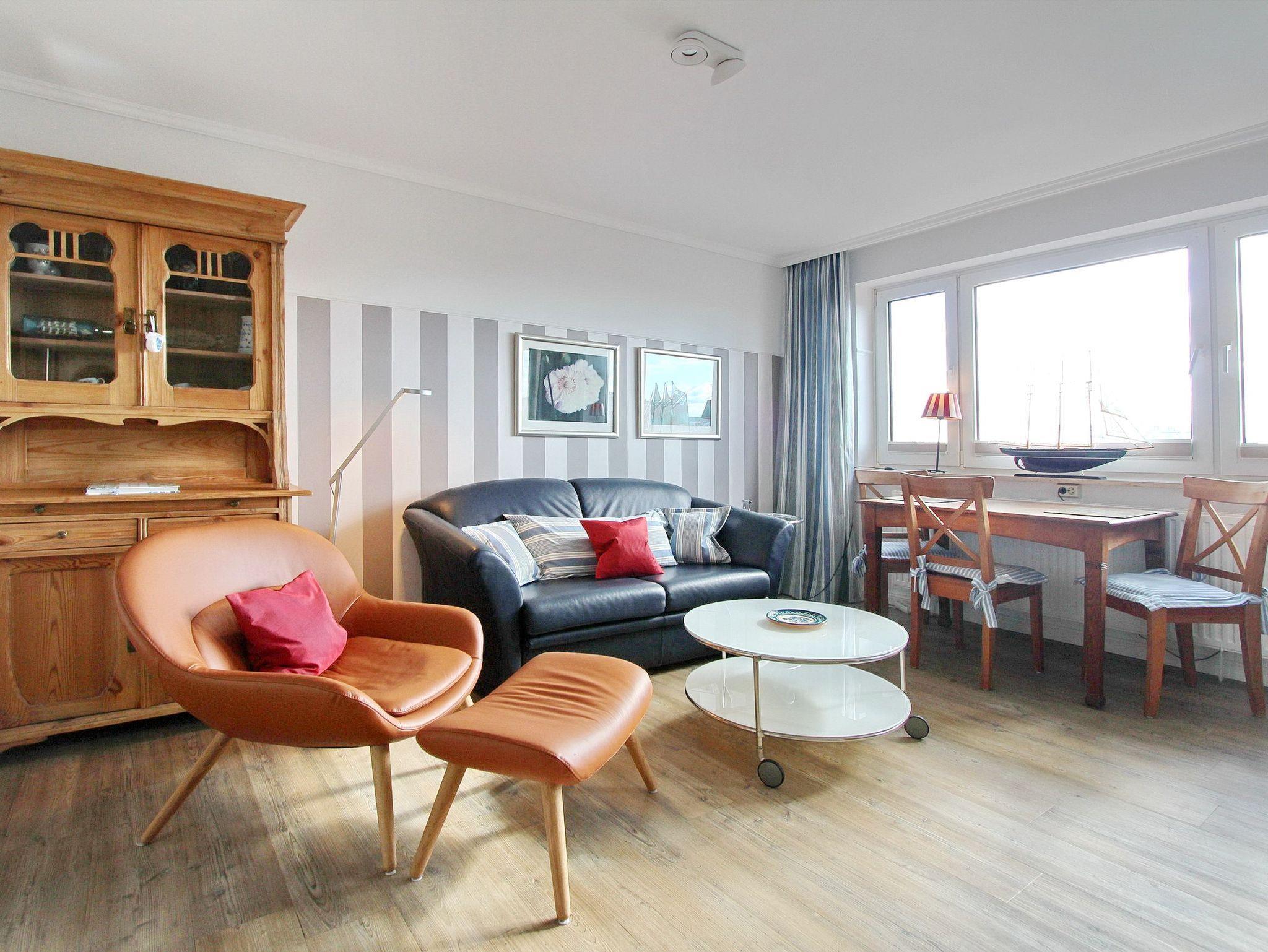 Liebevoll, hell und freundlich, eingerichtete 1 Zimmer Wohnung in der 4. Etage in unmittelbarer Nähe zum Strand und der Westerländer Promenade. Der kombinierte Wohn-Schlafraum verfügt über ein neues Boxspringbett mit höchstem Schlaf-sowie Ein-und Ausstiegskomfort, einen Essplatz am Fenster mit 3 Stühlen und eine Ledercouch und Sessel für gemütliche Fernseh- oder Leseabende. Im Einbaukleiderschrank haben Sie ausreichend Platz für Ihre persönlichen Dinge. Die offene Einbauküche mit Fenster ist mit einer Mikrowelle, einem Ceranfeld, einer zusätzliche Nespressomaschine und einem Geschirrspüler ausgestattet. Selbstverpfleger können sich hier ein köstliches Frühstück oder kleine Mahlzeiten zubereiten. Der Holzlaminatboden gibt dem Raum Wärme und Gemütlichkeit. Das großzügige Badezimmer verfügt über eine Dusche und ein Bidet. Zu ihrer Unterhaltung steht ihnen ein Smart-Flachbildfernseher, ein DVD Player, eine Stereoanlage mit Bluetooth und Kopfhörer, sowie eine umfangreiche Auswahl an DVDs, Büchern und Spielen zur Verfügung. Ein Hotspot im Haus ermöglicht ihnen kabellosen und kostenlosen Zugang ins Internet (WEG-AD3 - Passwortfrei - ohne Gewähr). Diese Wohnung ist eine Nichtraucherwohnung. Haustiere sind ausdrücklich willkommen. Wohnungsgröße: ca. 35 m².