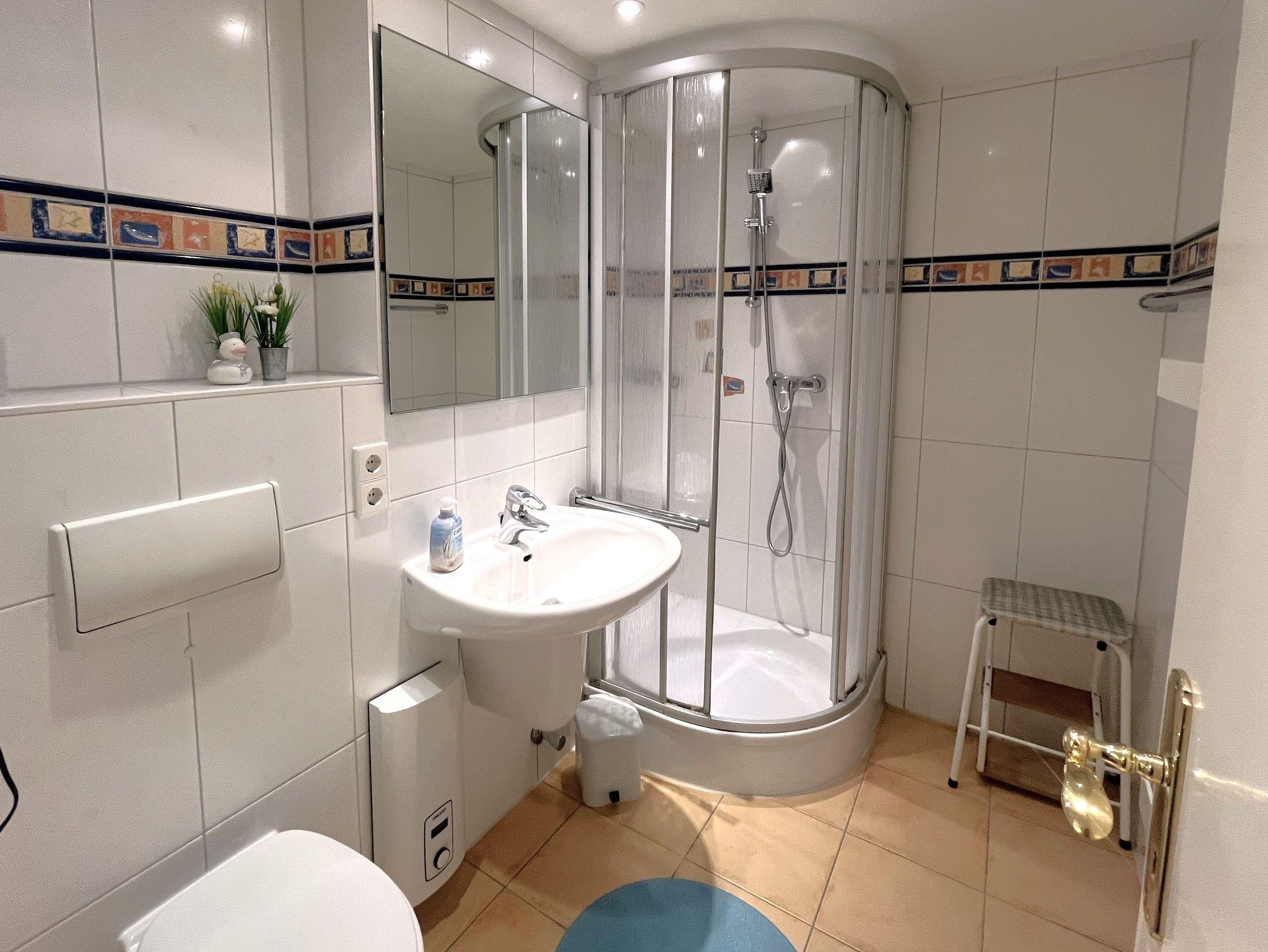 Ein modernes, helles Bad mit Dusche, WC, Waschbecken und Handtuchwärmer.