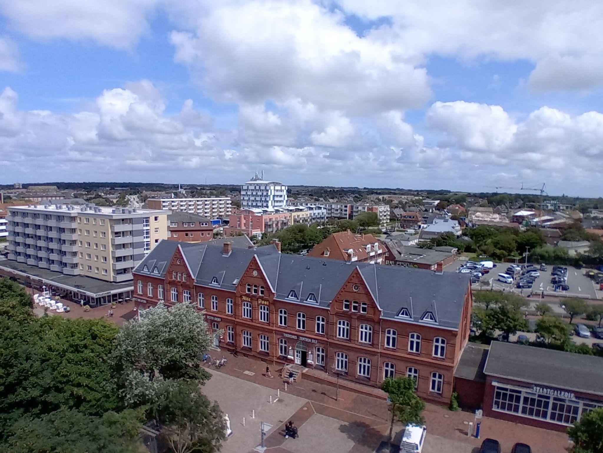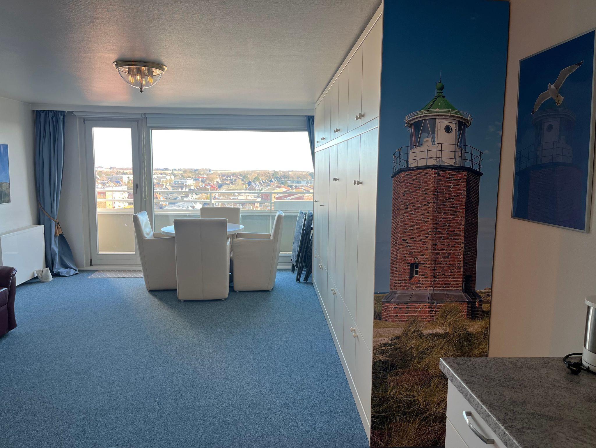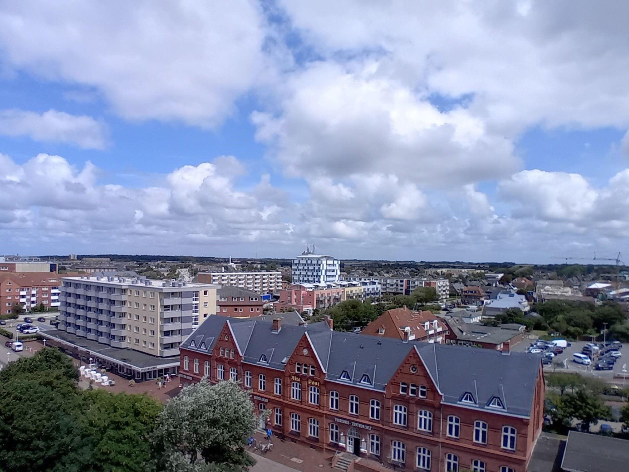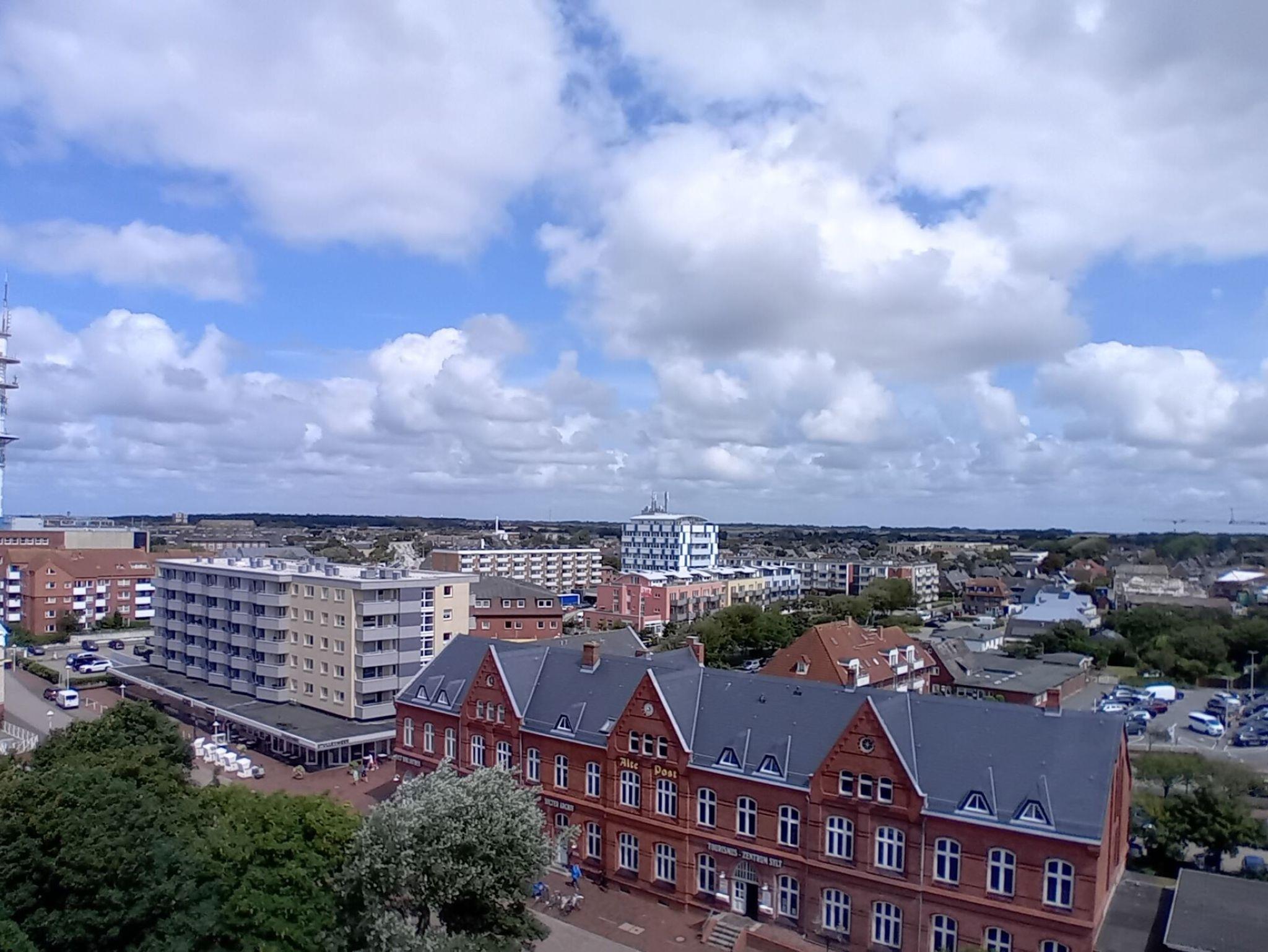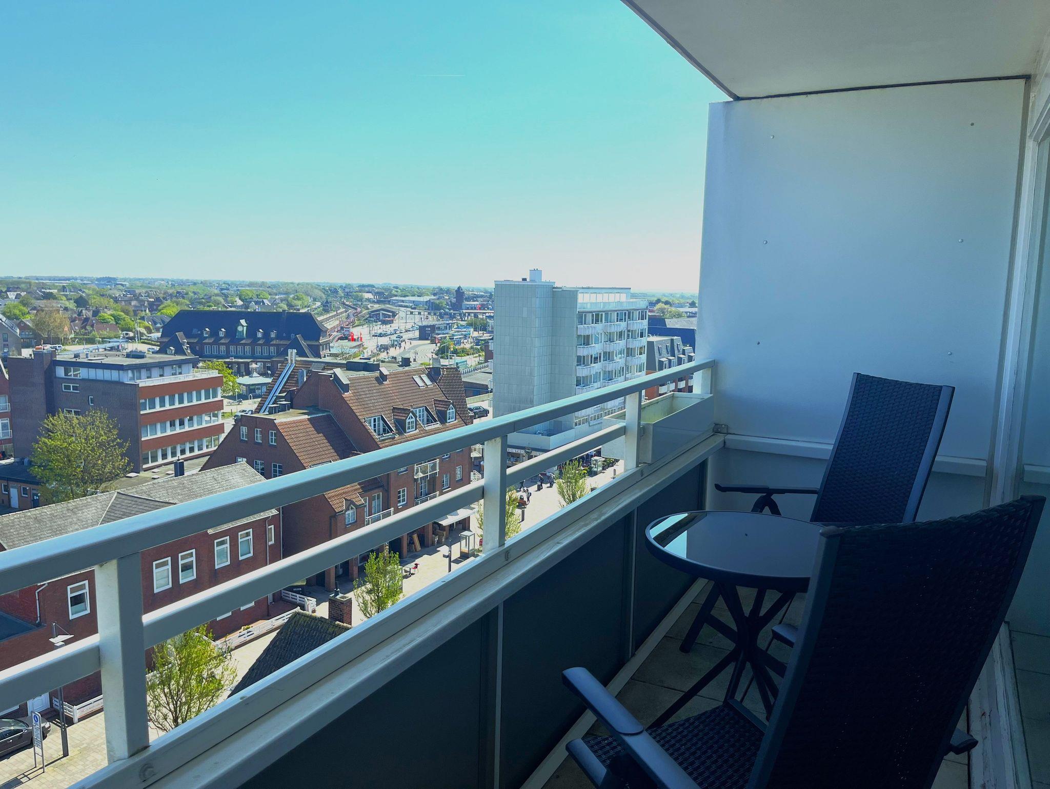 Die Ferienwohnung befindet sich in der 8. Etage eines 8-geschossigen Appartementhauses mit Aufzug. Sie haben vom Balkon eine herrliche Sicht über den Osten von Sylt. Bei gutem Wetter können Sie in Morsum das Watt sehen. Im Zentrum Westerlands, schräg gegenüber der Fußgängerzone Friedrichstrasse ist der Haupteingang des Hanseatenhauses. Entfernung zum Strand ca. 400 m, ca. 5 Gehminuten zum Bahnhof.