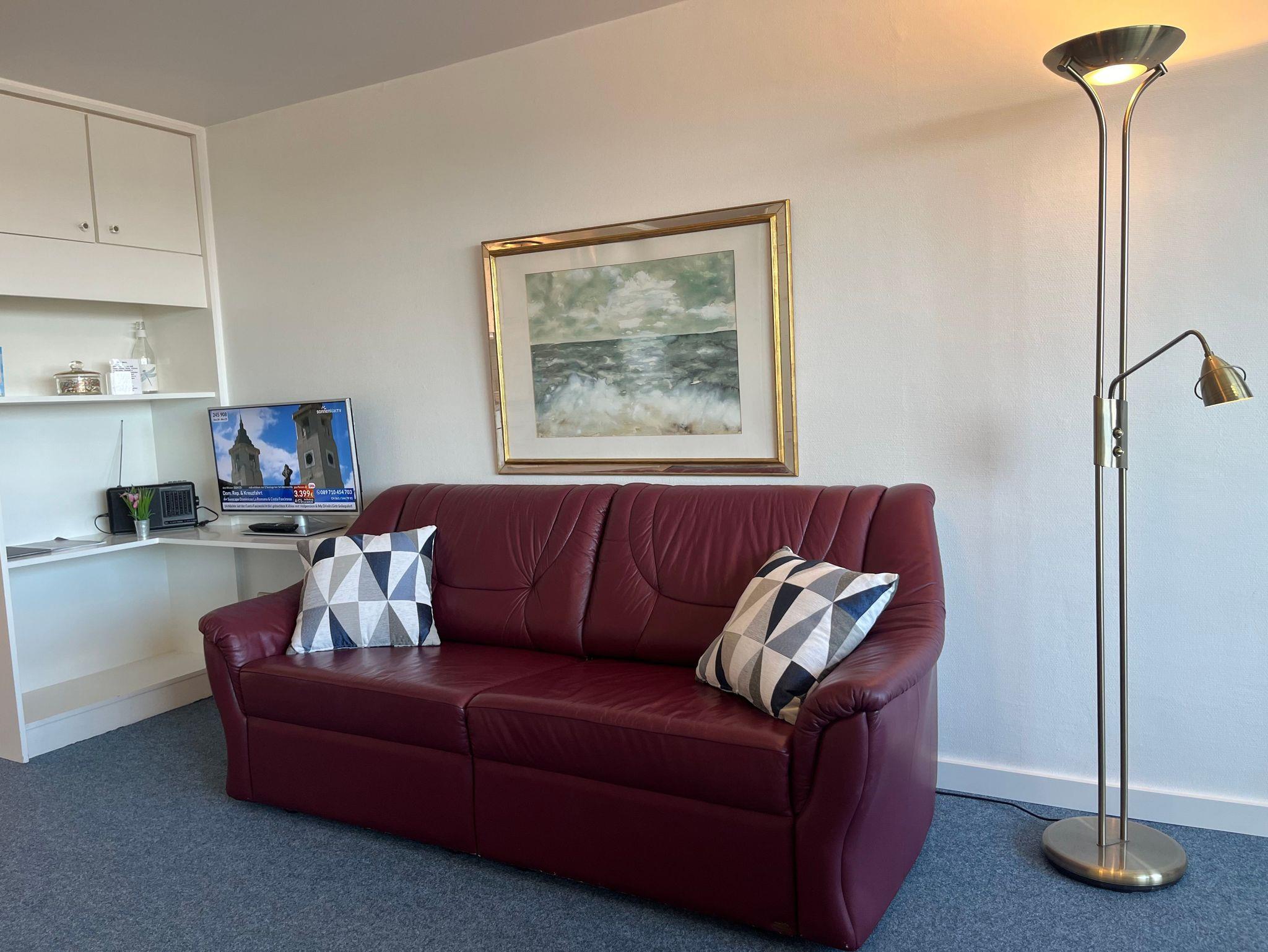 Ein kombinierter Wohn-Schlafraum mit Ledersofa, Flachbild-TV, Doppelschrankbett und Essecke ist der Mittelpunkt dieser hell eingerichteten Wohnung mit neuem Teppichboden. Im Vorraum sorgt ein großer Einbauschrank für reichlich Stauraum.